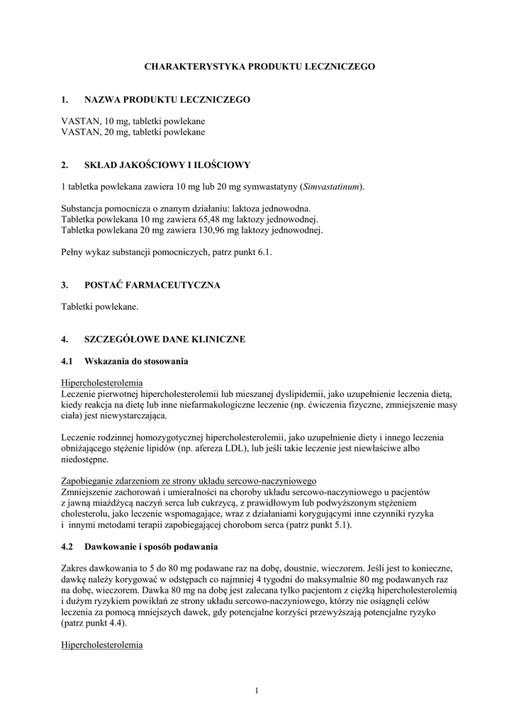 CHARAKTERYSTYKA PRODUKTU LECZNICZEGO 1. NAZWA PRODUKTU LECZNICZEGO VASTAN, 10 mg, tabletki powlekane VASTAN, 20 mg, tabletki powlekane 2. SKŁAD JAKOŚCIOWY I ILOŚCIOWY 1 tabletka powlekana zawiera 10 mg lub 20 mg symwastatyny (Simvastatinum). Substancja pomocnicza o znanym działaniu: laktoza jednowodna. Tabletka powlekana 10 mg zawiera 65,48 mg laktozy jednowodnej. Tabletka powlekana 20 mg zawiera 130,96 mg laktozy jednowodnej. Pełny wykaz substancji pomocniczych, patrz punkt 6.1. 3. POSTAĆ FARMACEUTYCZNA Tabletki powlekane. 4. SZCZEGÓŁOWE DANE KLINICZNE 4.1 Wskazania do stosowania Hipercholesterolemia Leczenie pierwotnej hipercholesterolemii lub mieszanej dyslipidemii, jako uzupełnienie leczenia dietą, kiedy reakcja na dietę lub inne niefarmakologiczne leczenie (np. ćwiczenia fizyczne, zmniejszenie masy ciała) jest niewystarczająca. Leczenie rodzinnej homozygotycznej hipercholesterolemii, jako uzupełnienie diety i innego leczenia obniżającego stężenie lipidów (np. afereza LDL), lub jeśli takie leczenie jest niewłaściwe albo niedostępne. Zapobieganie zdarzeniom ze strony układu sercowo-naczyniowego Zmniejszenie zachorowań i umieralności na choroby układu sercowo-naczyniowego u pacjentów z jawną miażdżycą naczyń serca lub cukrzycą, z prawidłowym lub podwyższonym stężeniem cholesterolu, jako leczenie wspomagające, wraz z działaniami korygującymi inne czynniki ryzyka i innymi metodami terapii zapobiegającej chorobom serca (patrz punkt 5.1). 4.2 Dawkowanie i sposób podawania Zakres dawkowania to 5 do 80 mg podawane raz na dobę, doustnie, wieczorem. Jeśli jest to konieczne, dawkę należy korygować w odstępach co najmniej 4 tygodni do maksymalnie 80 mg podawanych raz na dobę, wieczorem. Dawka 80 mg na dobę jest zalecana tylko pacjentom z ciężką hipercholesterolemią i dużym ryzykiem powikłań ze strony układu sercowo-naczyniowego, którzy nie osiągnęli celów leczenia za pomocą mniejszych dawek, gdy potencjalne korzyści przewyższają potencjalne ryzyko (patrz punkt 4.4). Hipercholesterolemia 1 Pacjent powinien stosować standardową niskocholesterolową dietę, którą należy kontynuować podczas leczenia produktem leczniczym Vastan. Zazwyczaj początkową dawką jest 10 do 20 mg na dobę, wieczorem. Pacjenci, u których konieczne jest znaczne obniżenie LDL-C (ponad 45%), mogą rozpocząć od dawki 20 do 40 mg raz na dobę, podawanej wieczorem. Jeśli konieczna jest korekta dawki, należy ją przeprowadzić tak, jak opisano powyżej. Homozygotyczna hipercholesterolemia rodzinna W oparciu o wyniki kontrolowanych badań klinicznych, zalecane dawkowanie produktu leczniczego Vastan to 40 mg raz na dobę, wieczorem lub 80 mg na dobę w trzech dawkach: rano i w południe po 20 mg, a wieczorem 40 mg. W tej grupie pacjentów Vastan należy stosować jako lek uzupełniający inne metody leczenia zmniejszające stężenie lipidów (np. afereza LDL), lub jeśli takie leczenie jest niedostępne albo niewłaściwe. Zapobieganie zdarzeniom ze strony układu sercowo-naczyniowego Zalecaną dawką produktu leczniczego Vastan u pacjentów z dużym ryzykiem wystąpienia zdarzeń wieńcowych (choroba wieńcowa, z hiperlipidemią lub bez) jest 20 do 40 mg na dobę, w pojedynczej dawce wieczorem. Leczenie może być rozpoczęte jednocześnie ze stosowaniem diety i ćwiczeniami fizycznymi. Jeśli konieczna jest korekta dawkowania, należy ją przeprowadzić tak, jak opisano powyżej. Jednoczesne stosowanie z innymi lekami zmniejszającymi stężenie lipidów Vastan jest skuteczny w monoterapii lub w skojarzeniu z preparatami wiążącymi kwasy żółciowe. Produkt leczniczy należy podawać nie mniej niż 2 godziny przed lub nie mniej niż 4 godziny po podaniu preparatów wiążących kwasy żółciowe. Pacjenci przyjmujący jednocześnie z produktem leczniczym Vastan cyklosporynę, danazol, gemfibrozyl lub inne fibraty (z wyjątkiem fenofibratu), nie mogą stosować dobowej dawki produktu leczniczego Vastan większej niż 10 mg na dobę. Pacjenci przyjmujący jednocześnie z produktem leczniczym Vastan amiodaron lub werapamil, nie mogą stosować dawki produktu leczniczego Vastan większej niż 20 mg na dobę. U pacjentów stosujących diltiazem lub amlodypinę jednocześnie z produktem leczniczym Vastan, dawka produktu leczniczego Vastan nie powinna przekraczać 40 mg/dobę. (Patrz punkty 4.4 i 4.5.) Niewydolność nerek Nie ma konieczności zmiany dawkowania u pacjentów z łagodną lub umiarkowaną niewydolnością nerek. U pacjentów z ostrą niewydolnością nerek (klirens kreatyniny < 30 ml/min), należy bardzo starannie rozważyć podawanie dawki większej niż 10 mg na dobę i jeśli jest to niezbędne, bardzo ostrożnie rozpocząć leczenie. Pacjenci w podeszłym wieku: Dostosowanie dawkowania nie jest konieczne. Dzieci i młodzież (w wieku od 10 do 17 lat): Zwykle zalecana dawka początkowa dla dzieci i młodzieży (chłopców w fazie II i powyżej wg skali Tannera oraz dziewcząt, u których minął co najmniej jeden rok od pierwszej miesiączki, w wieku 10–17 lat) z heterozygotyczną hipercholesterolemią rodzinną wynosi 10 mg raz na dobę wieczorem. Przed rozpoczęciem leczenia symwastatyną u dzieci i młodzieży należy zastosować standardową dietę obniżającą poziom cholesterolu; dietę należy kontynuować w trakcie leczenia symwastatyną. Zalecany zakres dawek wynosi 10 do 40 mg/dobę; najwyższa zalecana dawka wynosi 40 mg/dobę. Dawki należy dostosowywać indywidualnie zgodnie z zalecanym celem terapii, według zaleceń dotyczących leczenia dzieci i młodzieży (patrz punkt 4.4). Dawkę należy dostosowywać w odstępach 4 tygodni lub dłuższych. 2 Doświadczenia dotyczące stosowania produktu leczniczego Vastan u dzieci przed okresem dojrzewania są ograniczone. 4.3 4.4 Przeciwwskazania Nadwrażliwość na symwastatynę lub na którąkolwiek substancję pomocniczą wymienioną w punkcie 6.1. Czynna choroba wątroby lub u