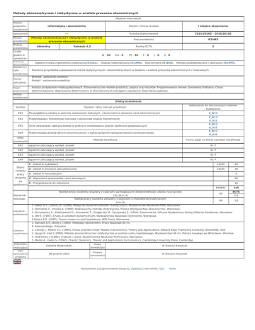 Metody ekonometryczne i statystyczne w analizie procesów ekonomicznych Wydział Informatyki Nazwa programu kształcenia Informatyka i ekonometria Poziom i forma studiów I stopień stacjonarne Specjalność --- Ścieżka dyplomowania 2015/2016Z - 2018/2019Z Nazwa przedmiotu Metody ekonometryczne i statystyczne w analizie procesów ekonomicznych Kod przedmiotu IE1MES Punkty ECTS 5 Rodzaj przedmiotu obieralny Semestr 4,5 Liczba godzin w semestrze W - 30 Ćw - 0 PS - 30 P - 0 L - 0 S - 0 Przedmioty wprowadzające Algebra liniowa z geometrią analityczną (IE1ALG), Analiza matematyczna (IE1AMA), Ekonometria (IE1EKN), Metody probabilistyczne i statystyka (IE1MPS), Założenia i cele przedmiotu Formy zaliczenia Treści programowe Poznanie przykładów zastosowania metod statystycznych i ekonometrycznych w badaniu i analizie procesów ekonomicznych i finansowych. Wykład - zaliczenie pisemne, Projekt - wykonanie projektów Analiza przepływów międzygałęziowych. Ekonometryczne modele produkcji, popytu oraz kosztów. Programowania liniowe. Geometria fraktalna. Chaos deterministyczny. Wykrywanie determinizmu w ekonomicznych szeregach czasowych. Estymatory jądrowe. Metody dydaktyczne Efekty kształcenia Symbol Odniesienie do kierunkowych efektów kształcenia Student, który zaliczył przedmiot: EK1 Ma pogłębioną wiedzę w zakresie zastosowań statystyki i ekonometrii w obszarze nauk ekonomicznych K_W13 EK2 Przeprowadza i interpretuje ilościowe i jakościowe analizy ekonomiczne K_W13 K_U15 EK3 Umie zastosować zdobytą wiedzę w praktyce modelowania zjawisk społeczno-gospodarczych EK4 Przeprowadza analizę danych ekonomicznych z wykorzystaniem oprogramowania komputerowego Efekt kształcenia K_W13 K_U15 K_W13 K_U16 Metoda weryfikacji Forma zajęć na której zachodzi weryfikacja EK1 egzamin zaliczający wykład, projekt W, P EK2 egzamin zaliczający wykład, projekt W, P EK3 egzamin zaliczający wykład, projekt W, P EK4 egzamin zaliczający wykład, projekt W, P Bilans nakładu pracy studenta (w godzinach) 1 - Udział w wykładach 15x2h 30 2 - Udział w pracowni specjalistycznej 15x2h 30 3 - Udział w konsultacjach 5 4 - Wykonanie sprawozdań i prac domowych 50 5 - Przygotowanie do zaliczenia 10 RAZEM: Wskaźniki ilościowe Literatura podstawowa Literatura uzupełniająca Jednostka realizująca ECTS Nakład pracy studenta związany z zajęciami wymagającymi bezpośredniego udziału nauczyciela: 65 2,5 (3)+(2)+(1) Nakład pracy studenta związany z zajęciami o charakterze praktycznym: 80 3,0 (4)+(2) 1. Baker G.L., Gollub J.P. (1998), Wstęp do dynamiki układów chaotycznych, Wydawnictwo Naukowe PWN, Warszawa 2. Domański C., Pruska K. (2000), Nieklasyczne metody statystyczne, Polskie Wydawnictwo Ekonomiczne, Warszawa 3. Dorosiewicz S., Kołatkowiski D., Kuszewski T., Podgórska M., Syczewska E. (1994), Ekonometria, Oficyna Wydawnicza Szkoły Głównej Handlowej, Warszawa 4. Ott E. (1997), Chaos w układach dynamicznych, Wydawnictwa Naukowo-Techniczne, Warszawa 5.Peters E.E. (1997), Teoria chaosu a rynki kapitałowe, WIG Press, Warszawa 1. Barczak A.S., Biolik J. (1998), Podstawy ekonometrii, Prace Naukowe AE im. K. Adamieckiego, Katowice 2. Creedy J., Martin V.L. (1994), Chaos and Non-linear Models in Economics. Theory and Applications, Edward Elgar Publishing Company, Brookfield, USA 3. Jajuga K. (red.) (2000), Metody ekonometryczne i statystyczne w analizie rynku kapitałowego, Wydawnictwo AE im. Oskara Langego we Wrocławiu, Wrocław 4. Kudrewicz J. (1993), Fraktale i chaos, Wydawnictwa Naukowo-Techniczne, Warszawa 5. Medio A., Gallo G. (1992), Chaotic Dynamics. Theory and Applications to Economics, Cambridge University Press, Cambridge Katedra Matematyki Osoby prowadzące dr Dariusz Kacprzak 18 grudnia 2013 Program opracował(a) dr Dariusz Kacprzak Data opracowania programu 125 Wydrukowane w programie Świerk Design by: styleshout | Valid XHTML | CSS Home