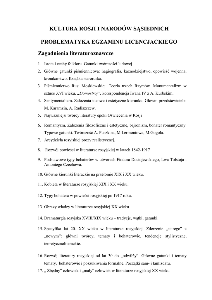 KULTURA ROSJI I NARODÓW SĄSIEDNICH PROBLEMATYKA EGZAMINU LICENCJACKIEGO Zagadnienia literaturoznawcze 1. Istota i cechy folkloru. Gatunki twórczości ludowej. 2. Główne gatunki piśmiennictwa: hagiografia, kaznodziejstwo, opowieść wojenna, kronikarstwo. Książka staroruska. 3. Piśmiennictwo Rusi Moskiewskiej. Teoria trzech Rzymów. Monumentalizm w sztuce XVI wieku. „Domostroj”, korespondencja Iwana IV z A. Kurbskim. 4. Sentymentalizm. Założenia ideowe i estetyczne kierunku. Główni przedstawiciele: M. Karamzin, A. Radiszczew. 5. Najważniejsi twórcy literatury epoki Oświecenia w Rosji 6. Romantyzm. Założenia filozoficzne i estetyczne, bajronizm, bohater romantyczny. Typowe gatunki. Twórczość A. Puszkina, M.Lermontowa, M.Gogola. 7. Arcydzieła rosyjskiej prozy realistycznej. 8. Rozwój powieści w literaturze rosyjskiej w latach 1842-1917 9. Podstawowe typy bohaterów w utworach Fiodora Dostojewskiego, Lwa Tołstoja i Antoniego Czechowa. 10. Główne kierunki literackie na przełomie XIX i XX wieku. 11. Kobieta w literaturze rosyjskiej XIX i XX wieku. 12. Typy bohatera w powieści rosyjskiej po 1917 roku. 13. Obrazy władzy w literaturze rosyjskiej XX wieku. 14. Dramaturgia rosyjska XVIII/XIX wieku – tradycje, wątki, gatunki. 15. Specyfika lat 20. XX wieku w literaturze rosyjskiej. Zderzenie „starego” z „nowym”: główni twórcy, tematy i bohaterowie, tendencje stylistyczne, teoretycznoliterackie. 16. Rozwój literatury rosyjskiej od lat 30 do „odwilży”. Główne gatunki i tematy tematy, bohaterowie i poszukiwania formalne. Początki sam- i tamizdatu. 17. „ Zbędny” człowiek i „mały” człowiek w literaturze rosyjskiej XX wieku 18. Literatura łagrowa – najważniejsi przedstawiciele i ich teksty. 19. Epoka „zastoju” w literaturze. Twórcy wobec powrotu metod nakazowoadministracyjnych. Znaczenie „prozy wiejskiej” w literaturze tego czasu. Inteligent wobec wyzwań epoki. Rozkwit sam- i tamizdatu. 20. Pieriestrojka i ostatnie dziesięciolecia. Nowe zjawiska i tematy w literaturze i kulturze rosyjskiej. Zagadnienia kulturoznawcze 1. Folklor rosyjski – główne dziedziny sztuki, gatunki, tematyka 2. Kultura staroruska – zabytki architektury i malarstwa. 3. Najważniejsze wydarzenia w historii Rusi Kijowskiej, okresu najazdu mongolskiego i Państwa Moskiewskiego 4. Rosja XVIII. Reformy Piotra I oraz ich wpływ na kulturę rosyjską. Najważniejsi przedstawiciele rosyjskiego oświecenia. 5. Kultura epoki romantyzmu w Rosji. 6. Wybitnie pisarze rosyjscy XIX wieku. 7. Przemiany społeczno-kulturowe w Rosji w latach 1861-1917. 8. Wybitni malarze rosyjscy II połowy XIX i początku XX wieku. 9. Modernizm w kulturze rosyjskiej. 10. Najważniejsze zjawiska w kulturze rosyjskiej w latach 1917-1932 11. Periodyzacja literatury rosyjskiej po 1917 roku do dnia dzisiejszego. 12. Najważniejsze wydarzenia historyczne w dziejach ZSRR. 13. Architektura okresu stalinowskiego – charakterystyka ogólna, metro w Moskwie, wysotki. 14. Socrealizm i jego przejawy w kulturze lat 30.-50. XX wieku 15. Kultura rosyjska od odwilży do pierestrojki. 16. Teatr rosyjski i jego rozwój w wieku XIX i XX. 17. Kino rosyjskie – najwybitniejsze filmy i ich twórcy. 18. Wielcy kompozytorzy rosyjscy XIX i XX wieku. 19. Muzyka estradowa i rockowa w Rosji. Najważniejsi przedstawiciele. 20. Swoboda kulturalna w Rosji po 1991 roku i jej konsekwencje dla postsowieckiej przestrzeni (literatura, film, media).