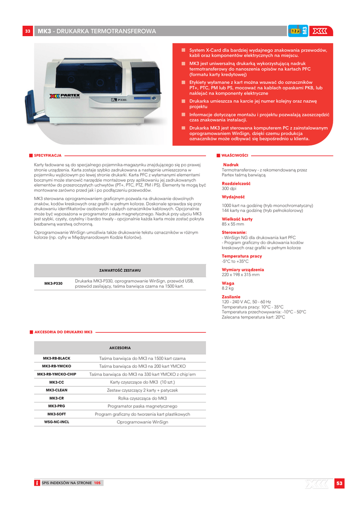 12 M3 MK3 - DRUKARKA TERMOTRANSFEROWA M3 M2 System X-Card dla bardziej wydajnego znakowania przewodów, 3 1 2elektrycznych 123 na miejscu. 12 kabli oraz komponentów M1 123 M1 MK3 jest uniwersalną drukarką wykorzystującą nadruk termotransferowy do nanoszenia opisów na kartach PFC (formatu karty kredytowej) M2 Etykiety wyłamane z kart można wsuwać do oznaczników PT+, PTC, PM lub PS, mocować na kablach opaskami PKB, lub naklejać na komponenty elektryczne Drukarka umieszcza na karcie jej numer kolejny 123 oraz nazwę projektu M2 123 123 12 M3 123 M1 Informacje dotyczące montażu i projektu pozwalają zaoszczędzić czas znakowania instalacji. M1 33 Drukarka MK3 jest sterowana komputerem PC z zainstalowanym oprogramowaniem WinSign, dzięki czemu produkcja oznaczników może odbywać się bezpośrednio u klienta. SPECYFIKACJA WŁAŚCIWOŚCI Karty ładowane są do specjalnego pojemnika-magazynku znajdującego się po prawej stronie urządzenia. Karta zostaje szybko zadrukowana a następnie umieszczona w pojemniku wyjściowym po lewej stronie drukarki. Karta PFC z wyłamanymi elementami bocznymi może stanowić narzędzie montażowe przy aplikowaniu jej zadrukowanych elementów do przezroczystych uchwytów (PT+, PTC, PTZ, PM i PS). Elementy te mogą być montowane zarówno przed jak i po podłączeniu przewodów. Nadruk Termotransferowy - z rekomendowaną przez Partex taśmą barwiącą MK3 sterowana oprogramowaniem graficznym pozwala na drukowanie dowolnych znaków, kodów kreskowych oraz grafiki w pełnym kolorze. Doskonale sprawdza się przy drukowaniu identfikatorów osobowych i dużych oznaczników kablowych. Opcjonalnie może być wyposażona w programator paska magnetycznego. Nadruk przy użyciu MK3 jest szybki, czysty, czytelny i bardzo trwały - opcjonalnie każda karta może zostać pokryta bezbarwną warstwą ochronną. Wydajność Oprogramowanie WinSign umożliwia także drukowanie tekstu oznaczników w różnym kolorze (np. cyfry w Międzynarodowym Kodzie Kolorów). Sterowanie: - WinSign NG dla drukowania kart PFC - Program graficzny do drukowania kodów kreskowych oraz grafiki w pełnym kolorze Rozdzielczość 300 dpi 1000 kart na godzinę (tryb monochromatyczny) 144 karty na godzinę (tryb pełnokolorowy) Wielkość karty 85 x 55 mm Temperatura pracy -5°C to +35°C ZAWARTOŚĆ ZESTAWU MK3-P330 Drukarka MK3-P330, oprogramowanie WinSign, przewód USB, przewód zasilający, taśma barwiąca czarna na 1500 kart. Wymiary urządzenia 220 x 198 x 315 mm Waga 8.2 kg Zasilanie 120 - 240 V AC, 50 - 60 Hz Temperatura pracy: 10°C - 35°C Temperatura przechowywania: -10°C - 50°C Zalecana temperatura kart: 20°C AKCESORIA DO DRUKARKI MK3 AKCESORIA MK3-RB-BLACK Taśma barwiąca do MK3 na 1500 kart czarna MK3-RB-YMCKO Taśma barwiąca do MK3 na 200 kart YMCKO MK3-RB-YMCKO-CHIP Taśma barwiąca do MK3 na 330 kart YMCKO z chip’em MK3-CC Karty czyszczące do MK3 (10 szt.) MK3-CLEAN Zestaw czyszczący 2 karty + patyczek MK3-CR Rolka czyszcząca do MK3 MK3-PRG Programator paska magnetycznego MK3-SOFT Program graficzny do tworzenia kart plastikowych WSG-NC-INCL Oprogramowanie WinSign SPIS INDEKSÓW NA STRONIE 105 53 MATERIAŁY DRUKOWANE PRZEZ MK3 12 M3 X ILOŚĆ ETYKIET NA KARCIE ILOŚĆ KART W OPAKOWANIU PFC042 12 15 18 21 30 4.5 4.5 4.5 4.5 4.5 ABS ABS ABS ABS ABS 21 / kartę 21 / kartę 21 / kartę 21 / kartę 14 / kartę 25 kart 25 kart 25 kart 25 kart 25 kart PFC07533 33 7.5 ABS 9 / kartę 25 kart PTZ+ PFC09518 18 9.5 ABS 20 / kartę 25 kart PM-20, PM-24,PS-20 PFC09540 40 9.5 poliamid 8 / kartę 25 kart 2 opaski PKB PFC09580 80 9.5 poliamid 4 / kartę 25 kart 2 opaski PKB 1 2Z3 DO STOSOWANIA PFC 123 PT+, PTC, PM-10, PTZ+ 123 123 M2 123 12 M3 123 M1 KARTY PFC Z SAMOPRZYLEPNYMI ETYKIETAMI 123 M1 STANDARDOWY KOLOR: żółty, biały. 12 M3 MATERIAŁ M1 SZEROKOŚĆ mm M2 DŁUGOŚĆ mm M2 TYP M1 KARTY PFC Z ETYKIETAMI TYP DŁUGOŚĆ mm SZEROKOŚĆ mm MATERIAŁ ILOŚĆ ETYKIET NA KARCIE ILOŚĆ W OPAKOWANIU PFC07014 14 7 poliester 25 / kartę 25 kart PFC12726 12.7 25.4 poliester 9 / kartę 25 kart PFC45080 45 80 poliester 1 / kartę 25 kart STANDARDOWY KOLOR: biały. PEŁNE KARTY PFC TYP DŁUGOŚĆ mm SZEROKOŚĆ mm MATERIAŁ ILOŚĆ KART W OPAKOWANIU PFC85055 85 55 PCV 100 kart PFCA85055 85 55 samoprzylepne PCV 100 kart PEŁNE KARTY PFC STANDARDOWY KOLOR: biały, srebrny. Inne na życzenie. PRODUKTY POWIĄZANE PT+ PTC PATRZ STRONA 14 54 PM PATRZ STRONA 15 PS PATRZ STRONA 20 PKB PATRZ STRONA 26 PATRZ STRONA 34 SPIS INDEKSÓW NA STRONIE 90