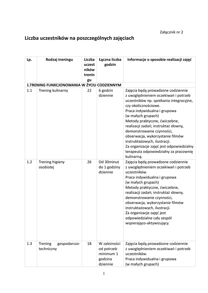 Załącznik nr 2 Liczba uczestników na poszczególnych zajęciach Lp. Rodzaj treningu Liczba Łączna liczba Informacje o sposobie realizacji zajęć uczest godzin ników trenin gu 1.TRENING FUNKCJONOWANIA W ŻYCIU CODZIENNYM 1.1 Trening kulinarny 22 6 godzin Zajęcia będą prowadzone codziennie dziennie z uwzględnieniem oczekiwań i potrzeb uczestników np. spotkania integracyjne, czy okolicznościowe. Praca indywidualna i grupowa (w małych grupach) Metody praktyczne, ćwiczebne, realizacji zadań; instruktaż słowny, demonstrowanie czynności, obserwacja, wykorzystanie filmów instruktażowych, ilustracji. Za organizacje zajęć jest odpowiedzialny terapeuta odpowiedzialny za pracownię kulinarną. 1.2 Trening higieny 26 Od 30minut Zajęcia będą prowadzone codziennie osobistej do 1 godziny z uwzględnieniem oczekiwań i potrzeb dziennie uczestników. Praca indywidualna i grupowa (w małych grupach) Metody praktyczne, ćwiczebne, realizacji zadań; instruktaż słowny, demonstrowanie czynności, obserwacja, wykorzystanie filmów instruktażowych, ilustracji. Za organizacje zajęć jest odpowiedzialne cały zespół wspierająco-aktywizujący. 1.3 Trening gospodarczotechniczny 18 W zależności od potrzeb minimum 1 godzina dziennie 1 Zajęcia będą prowadzone codziennie z uwzględnieniem oczekiwań i potrzeb uczestników. Praca indywidualna i grupowa (w małych grupach) Metody praktyczne, ćwiczebne, realizacji zadań; instruktaż słowny, demonstrowanie czynności, Za organizacje zajęć jest odpowiedzialny cały zespół wspierająco-aktywizujący. 2.TRENING UMIEJĘTNOŚCI SPĘDZANIA CZASU WOLNEGO 2.1 Trening muzyczno22 2 razy w Praca grupowa i indywidualna, metody teatralny tygodniu praktyczne -ćwiczebne, realizacji zadań, łącznie 5 metody problemowe – klasyczna, godzin przypadków, burza mózgów. Osobą odpowiedzialną za prowadzenie zajęć jest instruktor zajęć muzycznych i wyznaczony terapeuta. 2.2 Trening kulturalno30 Zgodnie z Realizacja treningu odbywa się głównie turystyczny kalendarzem na podstawie wydarzeń kulturalnych imprez i okolicznościowych (spotkanie wigilijne, kulturalnozabawa sylwestrowa, spotkania z okazji oświatowych imienin czy urodzin uczestników). Praca grupowa. Wspólne wycieczki, spacery, wyjazdy do kina itp. Za organizacje zajęć jest odpowiedzialny cały zespół wspierająco-aktywizujący. 2.3 Zajęcia świetlicowe 3 godziny Zajęcia z elementami aktywizującymi 35 dziennie lub uczestników, praca ciągła każdego dnia. w zależności Praca indywidualna i grupowa. od potrzeb Zajęcia prowadziły osoby z zespołu wspierająco-aktywizującego. Za organizacje zajęć był odpowiedzialny cały zespół wspierająco-aktywizujący. 3.TRENING UMIEJĘTNOŚCI INTERPERSONALNYCH I ROZWIAZYWANIA PROBLEMÓW 20 3 godziny Praca ciągła, każdego dnia. Zajęcia z 3.1 Zajęcia pedagogiczne dziennie elementami aktywizującymi danego uczestnika, praca wyrównawcza, zajęcia rewalidacyjno-wychowawcze, komunikacyjne. Za organizacje zajęć będzie odpowiedzialny terapeuta – psycholog. 12 3 godziny Trening praktyczny poprzez 3.2 Zajęcia komputerowe dziennie demonstrowanie czynności, instruktaż słowny. Praca indywidualna i grupowa Za organizacje zajęć jest odpowiedzialny terapeuta opiekun sali komputerowej. 4.TRENING TWORCZOŚCI ARTYSTYCZNEJ 4.1 Zajęcia plastyczne 15 3 godziny dziennie 2 Zajęcia odbywały się w formie terapii zajęciowej. Metody nauczania praktycznego: pokaz, ćwiczenia, instruktaż. Za organizacje zajęć jest odpowiedzialny terapeuta, opiekun sali plastyczno-manualnej. 4.2 Zajęcia manualne 5.TERAPIA RUYCHOWA 5.1 Kinezyterapia 5.2 Zabiegi fizykalne 5.3 Działania profilaktyczne, gry i zabawy 19 3 godziny dziennie Zajęcia odbywały się w formie terapii zajęciowej. Metody nauczania praktycznego: pokaz, ćwiczenia, instruktaż. Za organizacje zajęć był odpowiedzialny terapeuta, opiekun sali plastycznomanualnej. 35 6 godzin dziennie Praca ciągła, każdego dnia - praca w małych grupach i indywidualna; Metody praktyczne – ćwiczebne, realizacji zadań. Za organizacje zajęć jest odpowiedzialny fizjoterapeuta 6. PORADNICTWO PSYCHOLOGICZNE Praca ciągła, każdego dnia, lub w miarę potrzeb. METODY: Społeczność terapeutyczna (treningi umiejętności społecznych i interpersonalnych z zakresu nawiązywania kontaktów społecznych); przepracowywanie konfliktów grupowych, psychoedukacja 35 Za organizacje zajęć odpowiedzialny jest psycholog. 7. POMOC W ZAŁATWIANIU SPRAW URZĘDOWYCH, 35 Praca ciągła, każdego dnia, lub w miarę potrzeb i możliwości Praca indywidualna ukierunkowana na uczestnika 8. WSPÓŁPRACA Z RODZINAMI 35 Praca ciągła, każdego dnia, lub w miarę potrzeb i możliwości Praca indywidualna ukierunkowana na uczestnika 3