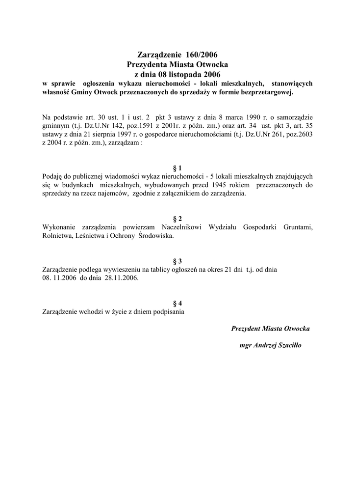 Zarządzenie 160/2006 Prezydenta Miasta Otwocka z dnia 08