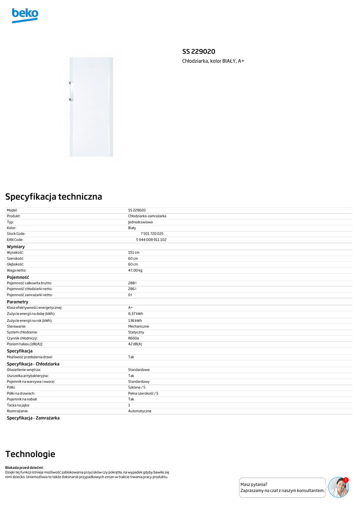 SS 229020 Chłodziarka, kolor BIAŁY, A+ Specyfikacja techniczna Model: SS 229020 Produkt: Chłodziarko-zamrażarka Typ: Jednodrzwiowa Kolor: Biały Stock Code: 7 501 720 025 EAN Code: 5 944 008 911 102 Wymiary Wysokość: 151 cm Szerokość: 60 cm Głębokość: 60 cm Waga netto: 47,00 kg Pojemność Pojemność całkowita brutto: 288 l Pojemność chłodziarki netto: 286 l Pojemność zamrażarki netto: 0l Parametry Klasa efektywności energetycznej: A+ Zużycie energii na dobę (kWh): 0,37 kWh Zużycie energii na rok (kWh): 136 kWh Sterowanie: Mechaniczne System chłodzenia: Statyczny Czynnik chłodniczy: R600a Poziom hałasu [dB(A)]: 42 dB(A) Specyfikacja Możliwość przełożenia drzwi: Tak Specyfikacja - Chłodziarka Oświetlenie wnętrza: Standardowe Uszczelka antybakteryjna: Tak Pojemnik na warzywa i owoce: Standardowy Półki: Szklane / 5 Półki na drzwiach: Pełna szerokość / 5 Pojemnik na nabiał: Tak Tacka na jajka: 1 Rozmrażanie: Automatyczne Specyfikacja - Zamrażarka Technologie Blokada przed dziećmi: Dzięki tej funkcji istnieje możliwość zablokowania przycisków czy pokrętła, na wypadek gdyby bawiło się nimi dziecko. Uniemożliwia to także dokonanie przypadkowych zmian w trakcie trwania pracy produktu. Masz pytania? Zapraszamy na czat z naszym konsultantem. 1
