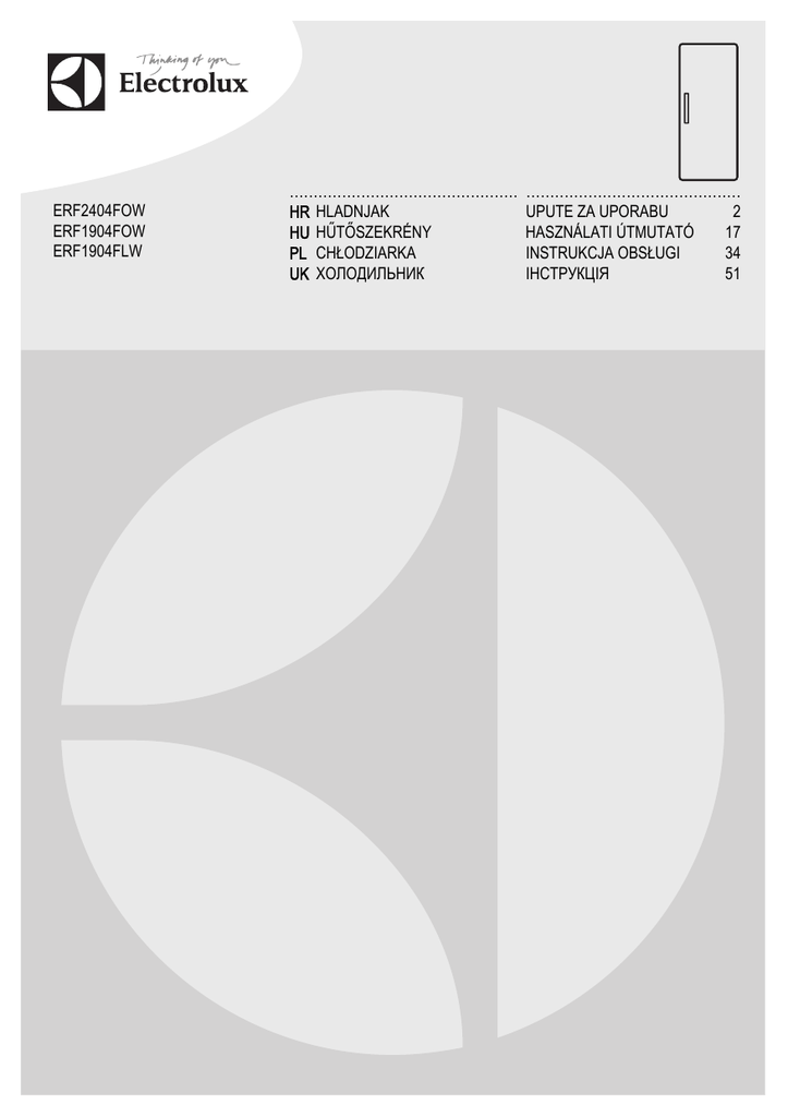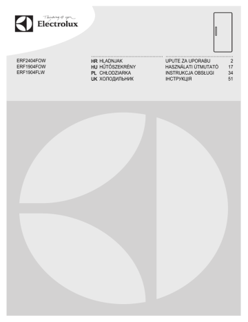ERF2404FOW ERF1904FOW ERF1904FLW ................................................ HR HLADNJAK HU HŰTŐSZEKRÉNY PL CHŁODZIARKA UK ХОЛОДИЛЬНИК ............................................. UPUTE ZA UPORABU 2 HASZNÁLATI ÚTMUTATÓ 17 INSTRUKCJA OBSŁUGI 34 ІНСТРУКЦІЯ 51 2 www.electrolux.com SADRŽAJ 1. 2. 3. 4. 5. 6. 7. 8. 9. SIGURNOSNE UPUTE . . . . . . . . . . . . . . . . . . . . . . . . . . . . . . . . . . . . . . . . . . . . . . . . . . . . . . . . . . . . . . . . . . 3 RAD UREĐAJA . . . . . . . . . . . . . . . . . . . . . . . . . . . . . . . . . . . . . . . . . . . . . . . . . . . . . . . . . . . . . . . . . . . . . . . . 5 PRVA UPORABA . . . . . . . . . . . . . . . . . . . . . . . . . . . . . . . . . . . . . . . . . . . . . . . . . . . . . . . . . . . . . . . . . . . . . . 5 SVAKODNEVNA UPORABA . . . . . . . . . . . . . . . . . . . . . . . . . . . . . . . . . . . . . . . . . . . . . . . . . . . . . . . . . . . . . 5 KORISNI SAVJETI I PREPORUKE . . . . . . . . . . . . . . . . . . . . . . . . . . . . . . . . . . . . . . . . . . . . . . . . . . . . . . . . 7 ČIŠĆENJE I ODRŽAVANJE . . . . . . . . . . . . . . . . . . . . . . . . . . . . . . . . . . . . . . . . . . . . . . . . . . . . . . . . . . . . . . 8 RJEŠAVANJE PROBLEMA . . . . . . . . . . . . . . . . . . . . . . . . . . . . . . . . . . . . . . . . . . . . . . . . . . . . . . . . . . . . . . 9 POSTAVLJANJE . . . . . . . . . . . . . . . . . . . . . . . . . . . . . . . . . . . . . . . . . . . . . . . . . . . . . . . . . . . . . . . . . . . . . 11 TEHNIČKI PODACI . . . . . . . . . . . . . . . . . . . . . . . . . . . . . . . . . . . . . . . . . . . . . . . . . . . . . . . . . . . . . . . . . . . 16 MISLIMO NA VAS Hvala vam što ste kupili Electrolux uređaj. Izabrali ste proizvod koji sa sobom donosi desetljeća profesionalnog iskustva i inovacija. Genijalan i elegantan, projektiran je s vama u mislima. Stoga, uvijek kada ga koristite, možete biti sigurni znajući da ćete svaki put dobiti izvrsne rezultate. Dobrodošli u Electrolux. Posjetite našu internetsku stranicu za: Dobivanje savjeta o korištenju, prospekata, rješavanju problema, servisnim informacija: www.electrolux.com Registriranje vašeg proizvoda za bolji servis: www.RegisterElectrolux.com Kupovinu dodatne opreme, potrošnog materijala i originalnih rezervnih dijelova za vaš uređaj: www.electrolux.com/shop BRIGA O KUPCIMA I SERVIS Preporučujemo uporabu originalnih rezervnih dijelova. Kada se obraćate servisu, provjerite da su Vam dostupni sljedeći podaci. Informacije možete pronaći na nazivnoj pločici. Model, PNC, serijski broj. Upozorenje / Oprez - sigurnosne informacije. Opće informacije i savjeti Informacije o zaštiti okoliša Zadržava se pravo na izmjene. HRVATSKI 1. 3 SIGURNOSNE UPUTE U interesu vaše sigurnosti i radi osiguravanja ispravne uporabe, prije postavljanja i prve upora‐ be uređaja, pročitajte pozorno upute sadržane u ovom priručniku, uključujući savjete i upozorenja. Kako bi se izbjegle nepotrebne greške i nezgo‐ de, važno je osigurati da su sve osobe koje kori‐ ste uređaj dobro upoznate s njegovim načinom rada i sigurnosnim pitanjima. Spremite ove upute i osigurajte se da prate uređaj u slučaju njegovog prenošenja ili prodaje, tako da su sve osobe koje koriste ovaj uređaj tijekom njegova radna vijeka prikladno informirane o načinu uporabe uređaja i o njegovim sigurnosnim pitanjima. Radi sigurnosti osoba i imovine, pridržavajte se mjera opreznosti iz ovih korisničkih uputa jer pro‐ izvođač nije odgovoran za štete nastale zbog propusta. • • • • 1.1 Sigurnost djece i slabijih osoba • Ovaj uređaj nije pogodan za uporabu od stra‐ ne osoba (uključujući djecu) smanjenih fi‐ zičkih, osjetnih ili mentalnih sposobnosti, od‐ nosno bez potrebnog iskustva i znanja, osim ako ih ne nadgleda ili uputi u uporabu uređaja osoba odgovorna za njihovu sigurnost. Treba paziti na djecu kako bi se osiguralo da se ne igraju s uređajem. • Držite svu ambalažu izvan dohvata djece. Po‐ stoji opasnost od gušenja. • Prilikom zbrinjavanja uređaja, izvucite utikač iz utičnice, odsijecite priključni kabel (što bliže uređaju) i demontirajte vrata kako biste spriječili da djeca za vrijeme igre zadobiju električni udar ili da se zatvore u uređaju. • Ako će ovaj uređaj s magnetskim brtvama na vratima zamijeniti stariji uređaj s bravom na vratima ili poklopcu, svakako onesposobite bravu prije zbrinjavanja starog uređaja. To će spriječiti da uređaj postane smrtonosna klopka za djecu. 1.2 Opća sigurnost UPOZORENJE Ventilacijski otvori na kućištu uređaja ili ugrad‐ nom elementu ne smiju biti blokirani. • Uređaj je namijenjen čuvanju namirnica i/ili pi‐ ća u kućanstvu i za upotrebe kao što su: – kuhinja za osoblje u prodavaonicama, ure‐ dima i drugim radnim prostorima, • – za farme i za goste hotela, motela i drugih vrsta smještaja, – za prenoćišta, – za catering i slične nekomercijalne primjene. Ne koristite mehanička pomagala niti bilo kakva druga sredstva za ubrzavanje procesa otapanja. Ne koristite električne uređaje (npr. aparate za pravljenje sladoleda) u uređajima za hlađenje, osim ako ih je proizvođač odobrio za tu namjenu. Pazite da ne oštetite sustav hlađenja. Sustav hlađenja uređaja sadrži izobutan (R600a), prirodni plin s visokim stupnjem ekološke kompatibilnosti, koji je usprkos tomu zapaljiv. Tijekom prijevoza i postavljanja uređaja pripa‐ zite da se ne ošteti nijedna komponenta su‐ stava hlađenja. Ako se sustav hlađenja ošteti: – izbjegavajte otvoreni plamen i izvore za‐ paljenja – dobro prozračite prostoriju u kojoj se uređaj nalazi Opasan je bilo kakav pokušaj izmjene speci‐ fikacija ili samog proizvoda. Bilo kakvo ošte‐ ćenje kabela može prouzročiti kratki spoj, po‐ žar i/ili strujni udar. UPOZORENJE Sve električne komponente (električni kabel, utikač, kompresor) mora zamijeniti ovlašt