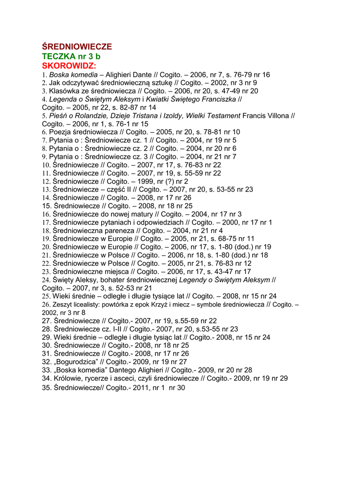 ŚREDNIOWIECZE TECZKA nr 3 b SKOROWIDZ: 1. Boska komedia – Alighieri Dante // Cogito. – 2006, nr 7, s. 76-79 nr 16 2. Jak odczytywać średniowieczną sztukę // Cogito. – 2002, nr 3 nr 9 3. Klasówka ze średniowiecza // Cogito. – 2006, nr 20, s. 47-49 nr 20 4. Legenda o Świętym Aleksym i Kwiatki Świętego Franciszka // Cogito. – 2005, nr 22, s. 82-87 nr 14 5. Pieśń o Rolandzie, Dzieje Tristana i Izoldy, Wielki Testament Francis Villona // Cogito. – 2006, nr 1, s. 76-1 nr 15 6. Poezja średniowiecza // Cogito. – 2005, nr 20, s. 78-81 nr 10 7. Pytania o : Średniowiecze cz. 1 // Cogito. – 2004, nr 19 nr 5 8. Pytania o : Średniowiecze cz. 2 // Cogito. – 2004, nr 20 nr 6 9. Pytania o : Średniowiecze cz. 3 // Cogito. – 2004, nr 21 nr 7 10. Średniowiecze // Cogito. – 2007, nr 17, s. 76-83 nr 22 11. Średniowiecze // Cogito. – 2007, nr 19, s. 55-59 nr 22 12. Średniowiecze // Cogito. – 1999, nr (?) nr 2 13. Średniowiecze – część II // Cogito. – 2007, nr 20, s. 53-55 nr 23 14. Średniowiecze // Cogito. – 2008, nr 17 nr 26 15. Średniowiecze // Cogito. – 2008, nr 18 nr 25 16. Średniowiecze do nowej matury // Cogito. – 2004, nr 17 nr 3 17. Średniowiecze pytaniach i odpowiedziach // Cogito. – 2000, nr 17 nr 1 18. Średniowieczna pareneza // Cogito. – 2004, nr 21 nr 4 19. Średniowiecze w Europie // Cogito. – 2005, nr 21, s. 68-75 nr 11 20. Średniowiecze w Europie // Cogito. – 2006, nr 17, s. 1-80 (dod.) nr 19 21. Średniowiecze w Polsce // Cogito. – 2006, nr 18, s. 1-80 (dod.) nr 18 22. Średniowiecze w Polsce // Cogito. – 2005, nr 21, s. 76-83 nr 12 23. Średniowieczne miejsca // Cogito. – 2006, nr 17, s. 43-47 nr 17 24. Święty Aleksy, bohater średniowiecznej Legendy o Świętym Aleksym // Cogito. – 2007, nr 3, s. 52-53 nr 21 25. Wieki średnie – odległe i długie tysiące lat // Cogito. – 2008, nr 15 nr 24 26. Zeszyt licealisty: powtórka z epok Krzyż i miecz – symbole średniowiecza // Cogito. – 2002, nr 3 nr 8 27. Średniowiecze // Cogito.- 2007, nr 19, s.55-59 nr 22 28. Średniowiecze cz. I-II // Cogito.- 2007, nr 20, s.53-55 nr 23 29. Wieki średnie – odległe i długie tysiąc lat // Cogito.- 2008, nr 15 nr 24 30. Średniowiecze // Cogito.- 2008, nr 18 nr 25 31. Średniowiecze // Cogito.- 2008, nr 17 nr 26 32. „Bogurodzica” // Cogito.- 2009, nr 19 nr 27 33. „Boska komedia” Dantego Alighieri // Cogito.- 2009, nr 20 nr 28 34. Królowie, rycerze i asceci, czyli średniowiecze // Cogito.- 2009, nr 19 nr 29 35. Średniowiecze// Cogito.- 2011, nr 1 nr 30