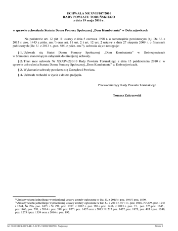 UCHWAŁA NR XVII/107/2016 RADY POWIATU TORUŃSKIEGO z dnia 19 maja 2016 r. w sprawie uchwalenia Statutu Domu Pomocy Społecznej „Dom Kombatanta” w Dobrzejewicach Na podstawie art. 12 pkt 11 ustawy z dnia 5 czerwca 1998 r. o samorządzie powiatowym (t.j. Dz. U. z 2015 r. poz. 1445 z późn. zm.1)) oraz art. 11 ust. 2 i art. 12 ust. 2 ustawy z dnia 27 sierpnia 2009 r. o finansach publicznych (Dz. U. z 2013 r., poz. 885, z późn. zm.2)), uchwala się co następuje: § 1. Uchwala się Statut Domu Pomocy Społecznej w brzmieniu stanowiącym załącznik do niniejszej uchwały. „Dom Kombatanta” w Dobrzejewicach § 2. Traci moc uchwała Nr XXXIV/220/10 Rady Powiatu Toruńskiego z dnia 15 października 2010 r. w sprawie uchwalenia Statutu Domu Pomocy Społecznej „Dom Kombatanta” w Dobrzejewicach. § 3. Wykonanie uchwały powierza się Zarządowi Powiatu. § 4. Uchwała wchodzi w życie z dniem podjęcia. Przewodniczący Rady Powiatu Toruńskiego Tomasz Zakrzewski 1) Zmiany tekstu jednolitego wymienionej ustawy zostały ogłoszone w Dz. U. z 2015 r. poz. 1045 i poz. 1890. tekstu jednolitego wymienionej ustawy zostały ogłoszone w Dz. U. z 2011 r. Nr 171, poz. 1016, Nr 209, poz. 1243 i 1244, Nr 226, poz. 1475 i Nr 291, poz. 1707, z 2012 r. poz. 986 i poz. 1456, z 2013 r. poz. 73, poz. 675,poz. 1645 , poz.1466, poz. 791, z 2014 r. poz. 598, poz. 877 i poz. 1457 oraz z 2015 Nr 217 poz. 1427, poz. 1873, poz. 493 i poz. 1240, poz. 1273 i poz. 1359 oraz z 2016 r. poz. 195. 2) Zmiany Id: D83E3BC4-0EF3-4B1A-8CF3-74898C0BE588. Podpisany Strona 1 Uzasadnienie W dniu 6 maja 2016 r. Dyrektor Domu Pomocy Społecznej „Dom Kombatanta” w Dobrzejewicach zwrócił się z wnioskiem o zmianę statutu w ww. Domu. Wprowadzone zmiany w strukturze organizacyjnej jednostki dotyczące likwidacji stanowiska Zastępcy dyrektora Domu oraz utworzenia stanowiska Kierownika Działu Administracyjno-Gospodarczego wymagają wprowadzenia zmian w Statucie jednostki. Ponadto w Statucie dokonano aktualizacji podstaw prawnych (§ 2 i § 8). W związku z powyższym przyjęcie powyższej uchwały jest zasadne. Id: D83E3BC4-0EF3-4B1A-8CF3-74898C0BE588. Podpisany Strona 2 Załącznik do Uchwały nr XVII/107/2016 Rady Powiatu Toruńskiego z dnia 19.05.2016 r. Statut Domu Pomocy Społecznej „Dom Kombatanta” w Dobrzejewicach I. Postanowienia ogólne § 1. 1. Dom Pomocy Społecznej „Dom Kombatanta” w Dobrzejewicach zwany dalej „Domem” jest jednostką organizacyjną Powiatu Toruńskiego. 2. Dom używa nazwy „Dom Pomocy Społecznej Dom Kombatanta w Dobrzejewicach”. 3. Dom ma siedzibę w Dobrzejewicach, gmina Obrowo. 4. Dom prowadzi Środowiskowy Dom Samopomocy w Osieku nad Wisłą (gmina Obrowo) stanowiący wewnętrzną jednostkę organizacyjną Domu, zwany dalej „ŚDS”. § 2. Dom w Dobrzejewicach działa na podstawie: 1) ustawy z dnia 12 marca 2004r. o pomocy społecznej (tj. Dz. U. z 2015 r., poz. 163, ze zm.) i rozporządzeń wynikających z ww. ustawy, 2) niniejszego Statutu, 3) regulaminu organizacyjnego Domu, 4) innych ustaw, stosownych rozporządzeń, a także odpowiednich uchwał i decyzji właściwych organów powiatu obowiązujących w prowadzeniu Domu. II. Przedmiot działalności § 3. 1. Przedmiotem działalności Domu jest zapewnienie mieszkańcom stałej opieki, warunków bezpiecznego i godnego życia, intymności i niezależności, rozwoju osobowości i samodzielności oraz podtrzymywanie i rozwijanie umiejętności niezbędnych do samodzielnego życia osób uczestniczących w zajęciach w ŚDS, z uwzględnieniem stopnia ich psychicznej i fizycznej sprawności. 2. Dom zapewnia całodobową opiekę oraz zaspokaja niezbędne potrzeby bytowe, opiekuńcze, wspomagające, edukacyjne, społeczne i religijne na poziomie obowiązującego standardu, w zakresie i formach wynikających z indywidualnych potrzeb osób w nim przebywających. Id: D83E3BC4-0EF3-4B1A-8CF3-74898C0BE588. Podpisany Strona 3 3. Uczestnikom zajęć w ŚDS Dom świadczy: trening umiejętności samoobsługi i zaradności życiowej, umiejętności społecznych i interpersonalnych, możliwość aktywnego spędzania wolnego czasu, terapię zajęciową, poradnictwo socjalne, prawne i psychologiczne, psychoedukację, konsultacje psychiatryczne i geriatryczne. 4. Dom umożliwia i organizuje mieszkańcom pomoc w korzystaniu ze świadczeń zdrowotnych przysługujących im na podstawie odrębnych przepisów oraz pokrywa opłaty ryczałtowe i częściową odpłatność do wysokości limitu ceny przewidzianych w przepisach o powszechnym ubezpieczeniu w Narodowym Funduszu Zdrowia. 5. Mieszkańcom Domu mogą być udzielane świadczenia zdrowotne nie przewidziane w niniejszym statucie, jeżeli wymagają tego potrzeby zdrowotne mieszkańców i pozwalają na to warunki Domu. 6. Dom prowadzi działania na rzecz osób niepełnosprawnych, w tym w zakresie rehabilitacji leczniczej i rehabilitacji społecznej oraz otacza szczególną opieką swych niepełnosprawnych mieszkańców i uczestników zajęć w ŚDS. 7. W celu integracji mieszkańców Domu ze środowiskiem lokalnym Dom może prowadzić działania oraz podejmować inicjatywy w zakresie aktywizacji różnych środowisk społecznych, szczególnie zagrożonych wykluczeniem społecznym w zakresie działalności oświatowej, edukacyjnej, kulturalnej, wychowawczej i profilaktycznej. § 4. 1. Dom jest domem stałego pobytu i świadczy usługi dla osób w podeszłym wieku. 2. Prawo do umieszczenia w Domu przysługuje osobie wymagającej całodobowej opieki z powodu wieku, choroby lub niepełnosprawności, niemogącej samodzielnie funkcjonować w codziennym życiu, której nie można zapewnić niezbędnej pomocy w formie usług opiekuńczych. 3. ŚDS jest ośrodkiem wsparcia pobytu dziennego dla osób z zaburzeniami psychicznymi. 4. Dom może prowadzić w ŚDS miejsca całodobowe okresowego pobytu. § 5. 1. Decyzje o skierowaniu do Domu i decyzje o odpłatności wydaje organ gminy właściwej dla tej oso