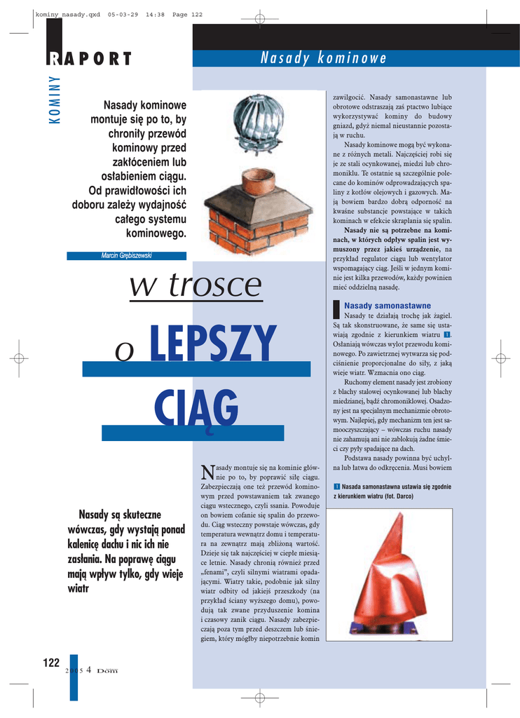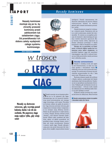 kominy_nasady.qxd 05-03-29 14:38 Page 122 Nasady kominowe KOMINY RAPORT Nasady kominowe montuje siê po to, by chroni³y przewód kominowy przed zak³óceniem lub os³abieniem ci¹gu. Od prawid³owoœci ich doboru zale¿y wydajnoœæ ca³ego systemu kominowego. Marcin Grêbiszewski w trosce o LEPSZY CIĄG asady montuje siê na kominie g³ównie po to, by poprawiæ si³ê ci¹gu. Zabezpieczaj¹ one te¿ przewód kominowym przed powstawaniem tak zwanego ci¹gu wstecznego, czyli ssania. Powoduje on bowiem cofanie siê spalin do przewodu. Ci¹g wsteczny powstaje wówczas, gdy temperatura wewn¹trz domu i temperatura na zewn¹trz maj¹ zbli¿on¹ wartoœæ. Dzieje siê tak najczêœciej w ciep³e miesi¹ce letnie. Nasady chroni¹ równie¿ przed „fenami”, czyli silnymi wiatrami opadaj¹cymi. Wiatry takie, podobnie jak silny wiatr odbity od jakiejœ przeszkody (na przyk³ad œciany wy¿szego domu), powoduj¹ tak zwane przyduszenie komina i czasowy zanik ci¹gu. Nasady zabezpieczaj¹ poza tym przed deszczem lub œniegiem, który móg³by niepotrzebnie komin N Nasady są skuteczne wówczas, gdy wystają ponad kalenicę dachu i nic ich nie zasłania. Na poprawę ciągu mają wpływ tylko, gdy wieje wiatr 122 2005 4 budujemy Dom zawilgociæ. Nasady samonastawne lub obrotowe odstraszaj¹ zaœ ptactwo lubi¹ce wykorzystywaæ kominy do budowy gniazd, gdy¿ niemal nieustannie pozostaj¹ w ruchu. Nasady kominowe mog¹ byæ wykonane z ró¿nych metali. Najczêœciej robi siê je ze stali ocynkowanej, miedzi lub chromoniklu. Te ostatnie s¹ szczególnie polecane do kominów odprowadzaj¹cych spaliny z kot³ów olejowych i gazowych. Maj¹ bowiem bardzo dobr¹ odpornoœæ na kwaœne substancje powstaj¹ce w takich kominach w efekcie skraplania siê spalin. Nasady nie s¹ potrzebne na kominach, w których odp³yw spalin jest wymuszony przez jakieœ urz¹dzenie, na przyk³ad regulator ci¹gu lub wentylator wspomagaj¹cy ci¹g. Jeœli w jednym kominie jest kilka przewodów, ka¿dy powinien mieæ oddzieln¹ nasadê. Nasady samonastawne Nasady te dzia³aj¹ trochê jak ¿agiel. S¹ tak skonstruowane, ¿e same siê ustawiaj¹ zgodnie z kierunkiem wiatru 1. Os³aniaj¹ wówczas wylot przewodu kominowego. Po zawietrznej wytwarza siê podciœnienie proporcjonalne do si³y, z jak¹ wieje wiatr. Wzmacnia ono ci¹g. Ruchomy element nasady jest zrobiony z blachy stalowej ocynkowanej lub blachy miedzianej, b¹dŸ chromoniklowej. Osadzony jest na specjalnym mechanizmie obrotowym. Najlepiej, gdy mechanizm ten jest samooczyszczaj¹cy – wówczas ruchu nasady nie zahamuj¹ ani nie zablokuj¹ ¿adne œmieci czy py³y spadaj¹ce na dach. Podstawa nasady powinna byæ uchylna lub ³atwa do odkrêcenia. Musi bowiem 1 Nasada samonastawna ustawia siê zgodnie z kierunkiem wiatru (fot. Darco) kominy_nasady.qxd 05-03-29 14:38 Page 123 RAPORT KOMINY zapewniaæ dostêp do przewodu – po to, by mo¿na go by³o wyczyœciæ. Nasady samonastawne mo¿na stosowaæ do przewodów zarówno dymowych, jak i spalinowych. Nasady obrotowe Tego rodzaju nasady obracaj¹ siê pod wp³ywem wiatru – jak dzieciêcy wiatraczek ustawiony poziomo 2. W przewodzie kominowym tworzy siê wówczas podciœnienie, które zwiêksza i stabilizuje ci¹g oraz zapobiega powstawaniu ci¹gu wstecznego. Podstawow¹ czêœci¹ takiej nasady jest lekka turbinka obrotowa. P³ynnoœæ jej ruchu zapewnia samosmaruj¹ce ³o¿ysko teflonowe. Turbinka jest osadzona na podstawie, któr¹ mo¿na montowaæ do komina na p³asko lub pod skosem. Prêdkoœæ ruchu turbinki, a wiêc i wartoœæ wytwarzanego podciœnienia, zale¿¹ od si³y wiatru. Nasady obrotowe s¹ mniej ni¿ samonastawne podatne na zablokowanie w wyniku zanieczyszczenia mechanizmu. Mo¿na je stosowaæ do przewodów dymowych i spalinowych. Daszki i nasady sta³e Daszki s¹ bardzo popularne 3. Montuje siê je po to, by zabezpiecza³y wylot komina przed opadami. Na si³ê ci¹gu nie maj¹ wiêkszego wp³ywu. Co wiêcej, wielu producentów ostrzega, ¿e mog¹ one zak³ócaæ poprawne odprowadzanie spalin, powoduj¹c ich zawirowania. Nasady sta³e os³aniaj¹ wylot komina. Gdy wieje wiatr, od ich strony zawietrznej tworzy siê podciœnienie wzmacniaj¹ce ci¹g. Niestety, nasady takie, w przeciwieñstwie do samonastawnych, nie mog¹ siê ustawiaæ tak, by przyj¹æ najkorzystniejsze po³o¿enie wzglêdem kierunku wiatru. Nie poprawiaj¹ wiêc stabilnoœci ci¹gu, a wzmacniaj¹ go tylko wtedy, gdy wiatr wieje dok³adnie od ich strony frontowej. Œrednica nasady nie mo¿e byæ mniejsza od œrednicy przewodu. Jak montowaæ nasady? Nasady ustawia siê na czapce kominowej, bezpoœrednio nad wylotem przewodu. W podstawie nasady znajduj¹ siê cztery otwory. Odznacza siê ich po³o¿enie na kominie (na przyk³ad o³ówkiem lub flamastrem). W oznaczonych miejscach wierci siê otwory œrednicy 8-10 mm. Nastêpnie umieszcza w nich plastikowe ko³ki, przystawia podstawê nasady i przykrê- ca j¹. Jeœli czapka kominowa jest krzywa, przed monta¿em trzeba j¹ wyrównaæ (na przyk³ad przeszlifowaæ). Nasady mo¿na te¿ montowaæ bezpoœrednio do przewodów kominowych. Podstawa jest wówczas niepotrzebna. Nasadê nak³ada siê na rurê przewodu i mocuje u¿ywaj¹c obejm zaciskowych. Czapki na kominie S¹ to betonowe p³yty stanowi¹ce zwieñczenie komina. Stosowano je powszechnie wówczas, gdy w piecach palono wêglem. Czapki mia³y zabezpieczaæ œcianki komina przed zabrudzeniem sadz¹. W nowoczesnych przewodach kominowych czapki nie s¹ konieczne. Niektórzy producenci systemów kominowych uwa¿aj¹, ¿e powoduj¹ one wrêcz zawirowania wokó³ komina, co pogarsza skutecznoœæ odprowadzania spalin. Kiedy trzeba, kiedy nie? 2 Nasada obrotowa obraca siê pod wp³ywem wiatru jak dzieciêcy wiatraczek (fot. Darco) 3 Daszki kominowe – a – (fot. Poujoulat) i nasady sta³e – b – (fot. Stamax) zabezpieczaj¹ wylot komina przed opadami a Rozporz¹dzenie Ministra Infrastruktury z dnia 12 kwietnia 2002 roku, w sprawie wymagañ
