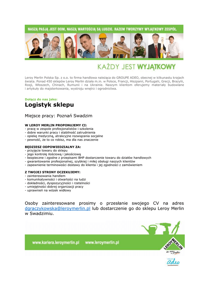 Leroy Merlin Polska Sp. z o.o. to firma handlowa należąca do GROUPE ADEO, obecnej w kilkunastu krajach świata. Ponad 450 sklepów Leroy Merlin działa m.in. w Polsce, Francji, Hiszpanii, Portugalii, Grecji, Brazylii, Rosji, Włoszech, Chinach, Rumunii i na Ukrainie. Naszym klientom oferujemy materiały budowlane i artykuły do majsterkowania, wystroju wnętrz i ogrodnictwa. Dołącz do nas jako: Logistyk sklepu Miejsce pracy: Poznań Swadzim W LEROY MERLIN PROPONUJEMY CI: - pracę w zespole profesjonalistów i szkolenia - dobre warunki pracy i stabilność zatrudnienia - opiekę medyczną, atrakcyjne rozwiązania socjalne - pewność, że to co robisz, ma dla nas znaczenie BĘDZIESZ ODPOWIEDZIALNY ZA: - przyjęcie towaru do sklepu - jego kontrolę ilościową i jakościową - bezpieczne i zgodne z przepisami BHP dostarczenie towaru do działów handlowych - gwarantowanie profesjonalnej, szybkiej i miłej obsługi naszych klientów - zapewnienie terminowości dostawy do klienta i jej zgodności z zamówieniem Z TWOJEJ STRONY OCZEKUJEMY: - zainteresowania handlem - komunikatywności i otwartości na ludzi - dokładności, dyspozycyjności i rzetelności - umiejętności dobrej organizacji pracy - uprawnień na wózek widłowy Osoby zainteresowane prosimy o przesłanie swojego CV na adres [email protected] lub dostarczenie go do sklepu Leroy Merlin w Swadzimiu.