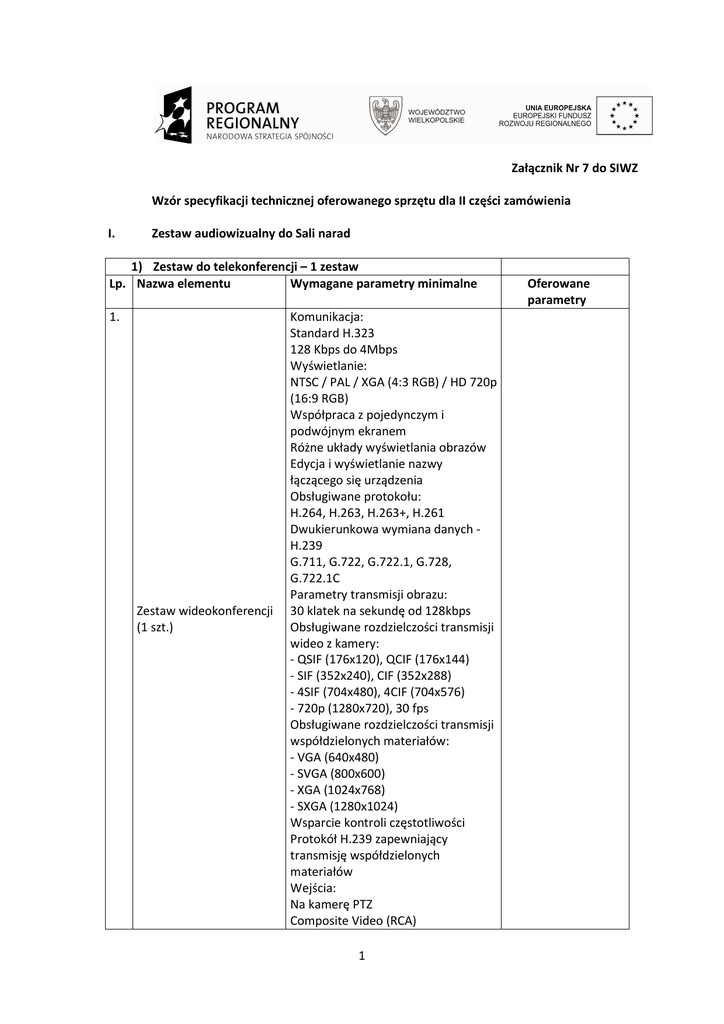 Załącznik Nr 7 do SIWZ Wzór specyfikacji technicznej oferowanego sprzętu dla II części zamówienia I. Zestaw audiowizualny do Sali narad 1) Zestaw do telekonferencji – 1 zestaw Lp. Nazwa elementu Wymagane parametry minimalne 1. Zestaw wideokonferencji (1 szt.) Komunikacja: Standard H.323 128 Kbps do 4Mbps Wyświetlanie: NTSC / PAL / XGA (4:3 RGB) / HD 720p (16:9 RGB) Współpraca z pojedynczym i podwójnym ekranem Różne układy wyświetlania obrazów Edycja i wyświetlanie nazwy łączącego się urządzenia Obsługiwane protokołu: H.264, H.263, H.263+, H.261 Dwukierunkowa wymiana danych H.239 G.711, G.722, G.722.1, G.728, G.722.1C Parametry transmisji obrazu: 30 klatek na sekundę od 128kbps Obsługiwane rozdzielczości transmisji wideo z kamery: - QSIF (176x120), QCIF (176x144) - SIF (352x240), CIF (352x288) - 4SIF (704x480), 4CIF (704x576) - 720p (1280x720), 30 fps Obsługiwane rozdzielczości transmisji współdzielonych materiałów: - VGA (640x480) - SVGA (800x600) - XGA (1024x768) - SXGA (1280x1024) Wsparcie kontroli częstotliwości Protokół H.239 zapewniający transmisję współdzielonych materiałów Wejścia: Na kamerę PTZ Composite Video (RCA) 1 Oferowane parametry 2. S-Video VGA (D-Sub 15) mini jack 3.5mm Wyjścia: 2 x VGA (D-Sub 15) Composite Video (RCA) S-Video mini jack 3.5mm Wbudowany głośnik 10 W Kamera obrotowa PTZ: Kamera o rozdzielczości 5 Megapikseli 7 krotny zoom optyczny Elektrycznie sterowany obrót, pochylenie i zoom (PTZ) Funkcje: Redukcja pogłosu Automatyczne wzmocnienie Redukcja szumów Wsparcie dla UPnP NAT Traversal Obsługa translacji adresów (Gatekeeper) oraz Firewall Traversal H.460 Sterowanie pozycją kamery ze zdalnej lokacji Aktualizacja oprogramowania przez sieć i USB Zapamiętuje do 10 ustawień pozycji kamery Aktualizacja i zarządzanie książką adresową przez internet Wykrywanie zagubionych pakietów Zawartość opakowania: Jednostka centralna Kamera PTZ o rozdzielczości HD Stacja komunikacyjna Mikrofon Pilot zdalnego sterowania Kable połączeniowe Tryby pracy: stereofoniczny; dwustrefowy powiązany; dwustrefowy indywidualny Funkcja przywoływania: dla pierwszej lub drugiej strefy Zdalne sterowanie poprzez łącze RS232 (typ SUB-D9, galwanicznie Wzmacniacz stereo (1 szt.) izolowane) Cyfrowa regulacja barwy: tony niskie: +/-14 dB przy 90 Hz; tony wysokie: +/14 dB przy 15 kHz Układ automatic loudness: podbicie +6 dB przy 90 Hz i +4 dB przy 15 kHz Moc wyjściowa (2 kanały 2 3. Głośniki ścienne (2szt.) 4. Spliter VGA 1:4 (1szt.) wysterowane): 2 x 50 W / 8 Ohm; 2 x 80 W / 4 Ohm Zakres przenoszonych częstotliwości: od 10 Hz do 40 kHz (-0,5 dB) Całkowite zniekształcenia harmoniczne (THD): <0,05% Zniekształcenia intermodulacyjne (IMD): <0,09% Stosunek sygnał / szum: >100 dB (Aważony) Wzmocnienie: 33 dB Współczynnik tłumienia: >100 Filtr górnoprzepustowy: przy 75 Hz, nachylenie 12 dB na oktawę Systemy zabezpieczeń: prądu stałego, termiczne, przeciw przesterowaniom, przeciw przepięciom, przeciw zwarciom Chłodzenie: konwekcyjne, brak wentylatora Pobór mocy: maksymalnie 170 W Parametry zasilania: prąd zmienny, 230-240 V, 50-60 Hz Dopuszczalne temperatury użytkowania: od 0 do 40 ºC Wymiary (wys. x szer. x głęb.): 88 x 430 (bez uchwytów) x 290 mm (320 mm z regulatorami) Wymiary opakowania: 530 x 380 x 170 mm Waga: 6,6 kg netto, 7,6 kg z opakowaniem 2-drożna kompaktowa kolumna wewnętrzna/zewnętrzna Pasmo przenoszenia (-10dB): 80Hz16kHz Moc muzyczna: 150W/8Ω Skuteczność: 88 dB SPL, 5.25" LF + 0.75" HF Kąt propagacji: 90° poz x 90° pion Głośnik wysokotowny: tytanowa kopułka 0.75 cala Głośnik niskotonowy: polipropylenowa membrana 5,25 cala Możliwość malowania obudowy Uchwyt kulowy w komplecie, mocowany na tylniej ścianie Waga: 2.3 kg Odporna na warunki atmosferyczne. Złącza: 5 sztuk DSUB15 HD Pasmo przenoszenia 350MHz 3 5. Wzmocnienie sygnału Video na dystansie do 65m Obsługuje DDC, DDC2, DDC2B (tylko 1 port) Obudowa metalowa Rozdzielczość maksymalna: 1920 x 1440 @ 60Hz Waga : 610g Wymiary : 20.00 x 7.50 x 4.50 cm Połka dostosowana do montażu Półka do wideokonferencji widekonferencji, wzmacniacz oraz (1szt.) odtwarzacza 6. Monitor LCD 46' (1 szt.) 7. Wieszak monitora Rodzaj panelu: S-PVA z podświetleniem CCFL Wielkość ekranu [cale/cm]: 46 / 117 Proporcje obrazu 16:9 Jasność [cd/m²]: 340, Kąty widzenia [°] 178 poziomo / 178 pionowo Czas reakcji [ms] 8 Częstotliwość odświeżania obrazu [Hz] 60 Wejścia wideo analogowe: 1 x D-sub 15 pin; 1 x S-Video; Composite (RCA); RGBHV (BNC) Wejścia wideo cyfrowe: 1 x DVI-D (z HDCP); 1 x HDMI 1.3 (HDCP); 1 x DisplayPort (HDCP) Wejścia audio analogowe: 2 x Cinch (RCA); 1 x 3,5 mm jack Wejścia audio cyfrowe: Interfejs DisplayPort; 1x HDMI Wyjścia wideo analogowe Composite (RCA) Wyjścia wideo cyfrowe 1 x DVI-D (HDCP) Wyjścia audio analogowe 3,5mm jack Rodzaj slot opcji: Podwójne gniazdo (STv1 + STv2); (STv2 kompatybilność z normą OPS) Pobór mocy [W] 165 wysyłka; 300 (maks.) Tryb Power Save [W] < 0,5 (tryb czuwania EKO); < 1 Zarządzanie energią VESA DPMS Pamięć ustawień matrycy Sprzętowa kalibracja barw Zaawansowane sterowanie wentylatorem Dopuszczalny rozmiar TV w calach: 4 (1szt.) 8. Gwarancja 30”...50” Odległość od ściany: 80 mm Standard mocowania: VESA Nośność: do 60 kg Pochylenie pion: ± 15° Wymiary: 765 x 530 x 80 mm Masa własna:6.4 kg 5 lat gwarancji, w tym przynajmniej 3 lata producenta ( w tym okresie serwis urządzenia musi być realizowany przez producenta lub autoryzowanego partnera serwisowego producenta) 2) Telewizor oraz odtwarzacz DVD – 1 zestaw Lp. Nazwa elementu Wymagane parametry minimalne 1. Monitor LCD 46' (1 szt.) Rodzaj panelu: S-PVA z podświetleniem CCFL Wielkość ekranu [cale/cm]: 46 / 117 Proporcje obrazu 16:9 Jasność [cd/m²]: 340, Kąty widzenia [°] 178 poziomo / 178 pionowo Czas reakcji [ms] 8 Częstotliwość odświeżania obrazu [Hz] 60 Wejścia wideo analogowe: 1 x D-sub 