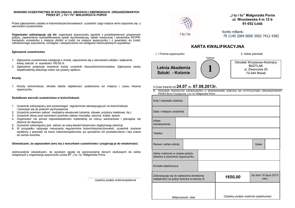 WARUNKI UCZESTNICTWA W KOLONIACH, OBOZACH I ZIMOWISKACH ORGANIZOWANYCH PRZEZ BT „I TU I TU” MAŁGORZATA POROS „i tu i tu” Małgorzata Poros ul. Wrocławska 4 m 12 b 91-052 Łódź Przed zgłoszeniem udziału w kolonii/obozie/zimowiskach uczestnik i jego rodzice winni zapoznać się z warunkami uczestnictwa: Konto mBank: 79 1140 2004 0000 3502 7412 4382 Organizator zobowiązuje się do: organizacji wypoczynku zgodnie z przedstawionym programem pobytu, zapewnienia wykwalifikowanej opieki wychowawczej, opieki medycznej i ratowników WOPR, transportu uczestnika z miejsca zbiórki w Łodzi na miejsce wypoczynku i z powrotem do Łodzi, całodziennego wyżywienia, noclegów i ubezpieczenia od następstw nieszczęśliwych wypadków. KARTA KWALIFIKACYJNA Zgłoszenie uczestnictwa 2. Adres placówki I. 1.Forma wypoczynku 1. Zgłoszenie uczestnictwa następuje z chwilą zapoznania się z warunkami udziału i wpłacenia kwoty zaliczki w wysokości 100,00 zł. 2. Zgłoszenie podpisuje osobiście każdy uczestnik obozu/kolonii/zimowiska. Zgłoszenia osoby niepełnoletniej dokonuje rodzic lub prawny opiekun. turnus Letnia Akademia Sztuki - Kolonie 1 Ośrodek Wczasowo-Kolonijny BAZYLAK ul. Dworcowa 25 72-344 Rewal Koszty 1. Koszty kolonii/obozu określa tabela odpłatności uzależniona od miejsca i czasu trwania wypoczynku. 3.Czas trwania od 24.07 do 07.08.2013r. II. WNIOSEK RODZICÓW (OPIEKUNÓW) O SKIEROWANIE DZIECKA NA WYPOCZYNEK ORGANIZOWANY PRZEZ Biuro Turystyczne „i tu i tu” Małgorzata Poros Dodatkowe warunki uczestnictwa w kolonii/obozie Imię i nazwisko dziecka 1. Uczestnik zobowiązany jest przestrzegać regulaminów obowiązujących na kolonii/obozie i stosować się do poleceń wychowawców 2. Uczestnik powinien zabrać niezbędny ekwipunek (ubrania, obuwie, przybory toaletowe, itp.) 3. Uczestnik obozu pod namiotami powinien zabrać menażkę, sztućce, kubek, śpiwór. 4. Organizator nie ponosi odpowiedzialności materialnej za rzeczy wartościowe i pieniądze nie złożone do depozytu. 5. Uczestnik zobowiązany jest zabrać ze sobą dowód tożsamości (legitymację szkolną) 6. W przypadku rażącego naruszania regulaminów kolonii/obozów/zimowisk, uczestnik zostanie wydalony z placówki na koszt rodziców/opiekunów, po uprzednim ich powiadomieniu i bez prawa do zwrotu kosztów. Oświadczam, że zapoznałam (em) się z warunkami uczestnictwa i przyjmuję je do wiadomości. Jednocześnie oświadczam, że wyrażam zgodę na wykorzystanie danych osobowych do celów związanych z organizacją wypoczynku przez BT „i tu i tu” Małgorzata Poros Data i miejsce urodzenia Adres zamieszkania Telefon Nazwa i adres szkoły klasa Adres rodziców w czasie pobytu dziecka w placówce wypoczynku Kontakt telefoniczny ................................................................... czytelny podpis rodzica/opiekuna Zobowiązuję się do wpłacenia określonej odpłatności za pobyt dziecka w kwocie zł: Miejscowość, data 1650,00 do dnia 10 lipca 2013 roku Czytelny podpis rodziców (opiekunów) ................................................................................................................................................................. ................................................................................................................................................................. Organizator zobowiązuje się poinformować rodziców o leczeniu ambulatoryjnym lub hospitalizacji dziecka podczas pobytu na placówce. KARTA KWALIFIKACYJNA WYPOCZYNEK DZIECI I MŁODZIEŻY „i tu i tu” Małgorzata Poros ................................................................. pieczęć adresowa szkoły I. .............................................. ......................................................................... miejscowość, data podpis lekarza lub pielęgniarki placówki wypoczynku Imię i nazwisko dziecka ..................................................................................................................... data urodzenia ..........................................................................., klasa ............................................ II. INFORMACJA RODZICÓW (OPIEKUNÓW) O STANIE ZDROWIA DZIECKA 1. Przebyte choroby: ospa, różyczka, świnka, szkarlatyna, żółtaczka zakaźna, choroby nerek (jakie?) .....................................................,choroby reumatyczne, astma, padaczka, choroby serca (jakie?) .................................................................., inne choroby.................................................................. 2. Uczulenie (podać na co)..................................................................................................................... 3. Szczepienia ochronne (podać rok): tężec:...................., błonica:......................, dur: ......................... inne : ................................................................................................................................................. 4. Stałe przyjmowanie leków (jakich , w jakich dawkach ?)..................................................................... 5. U dziecka występują: choroba lokomocyjna , omdlenia, częste bóle głowy, lęki nocne, moczenie nocne, częste bóle brzucha, wymioty, krwawienie z nosa, duszności, szybkie męczenie się, niedosłuch, jąkanie, przewlekły kaszel, inne ...................................................................................... 6. Inne ważne informacje o zdrowiu dziecka ........................................................................................................................................................... .............................................................................................................………………………………… …………………………………………………….………………....................……………………………… V. INFORMACJA O DZI
