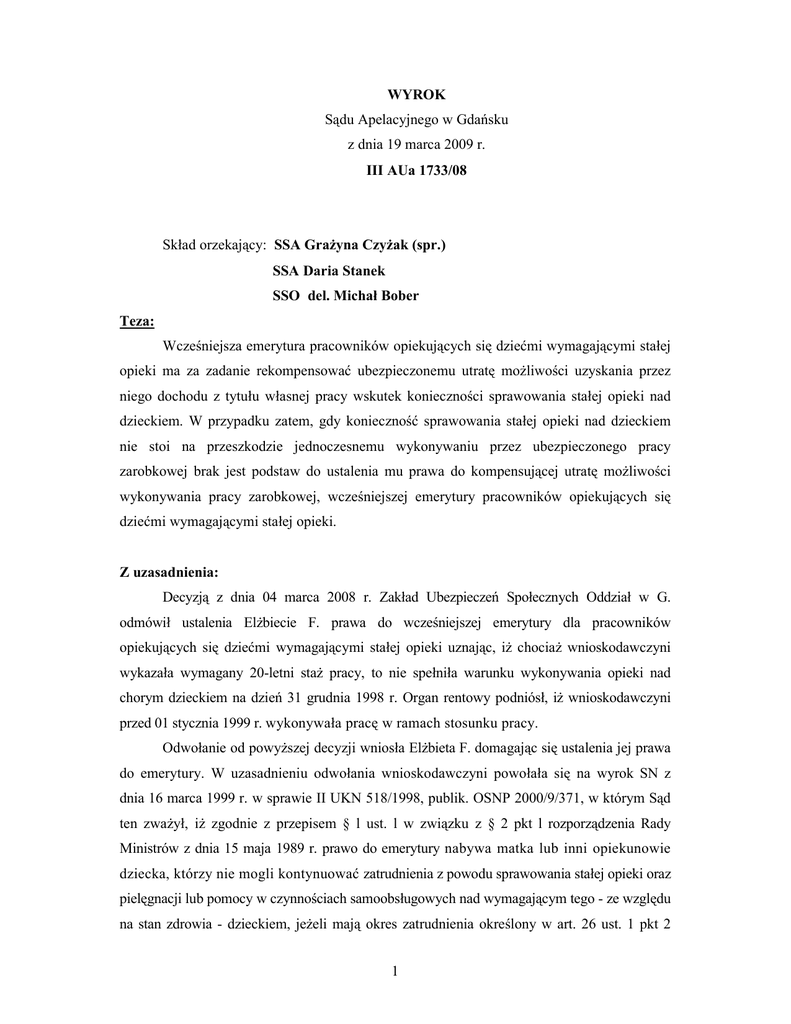WYROK Sądu Apelacyjnego w Gdańsku z dnia 19 marca 2009 r. III AUa 1733/08 Skład orzekający: SSA GraŜyna CzyŜak (spr.) SSA Daria Stanek SSO del. Michał Bober Teza: Wcześniejsza emerytura pracowników opiekujących się dziećmi wymagającymi stałej opieki ma za zadanie rekompensować ubezpieczonemu utratę moŜliwości uzyskania przez niego dochodu z tytułu własnej pracy wskutek konieczności sprawowania stałej opieki nad dzieckiem. W przypadku zatem, gdy konieczność sprawowania stałej opieki nad dzieckiem nie stoi na przeszkodzie jednoczesnemu wykonywaniu przez ubezpieczonego pracy zarobkowej brak jest podstaw do ustalenia mu prawa do kompensującej utratę moŜliwości wykonywania pracy zarobkowej, wcześniejszej emerytury pracowników opiekujących się dziećmi wymagającymi stałej opieki. Z uzasadnienia: Decyzją z dnia 04 marca 2008 r. Zakład Ubezpieczeń Społecznych Oddział w G. odmówił ustalenia ElŜbiecie F. prawa do wcześniejszej emerytury dla pracowników opiekujących się dziećmi wymagającymi stałej opieki uznając, iŜ chociaŜ wnioskodawczyni wykazała wymagany 20-letni staŜ pracy, to nie spełniła warunku wykonywania opieki nad chorym dzieckiem na dzień 31 grudnia 1998 r. Organ rentowy podniósł, iŜ wnioskodawczyni przed 01 stycznia 1999 r. wykonywała pracę w ramach stosunku pracy. Odwołanie od powyŜszej decyzji wniosła ElŜbieta F. domagając się ustalenia jej prawa do emerytury. W uzasadnieniu odwołania wnioskodawczyni powołała się na wyrok SN z dnia 16 marca 1999 r. w sprawie II UKN 518/1998, publik. OSNP 2000/9/371, w którym Sąd ten zwaŜył, iŜ zgodnie z przepisem § l ust. l w związku z § 2 pkt l rozporządzenia Rady Ministrów z dnia 15 maja 1989 r. prawo do emerytury nabywa matka lub inni opiekunowie dziecka, którzy nie mogli kontynuować zatrudnienia z powodu sprawowania stałej opieki oraz pielęgnacji lub pomocy w czynnościach samoobsługowych nad wymagającym tego - ze względu na stan zdrowia - dzieckiem, jeŜeli mają okres zatrudnienia określony w art. 26 ust. 1 pkt 2 1 ustawy z dnia 14 grudnia 1982 r. o zaopatrzeniu emerytalnym pracowników i ich rodzin (Dz. U. Nr 40, poz. 267 ze zm.). Wnioskodawczyni podniosła, iŜ prawidłowe zastosowanie przepisu § l rozporządzenia wymaga oceny tego, czy i jakie prace podjąć moŜe zainteresowany, który - co nie stanowi kwestii spornej - kaŜdego dnia, opiekuje się osobiście chorym dzieckiem. Dopiero ogół działań - opiekunów szkolnych i ubezpieczonej - prowadzi bowiem do pomocy dziecku w jego rozwoju fizycznym i intelektualnym (por. wyrok Sądu NajwyŜszego z dnia 20 stycznia 1998 r. w sprawie II UKN 454/97, publik. OSNAPiUS 1998 Nr 24, poz. 722). W odpowiedzi na odwołanie organ rentowy wniósł o jego oddalenie, podtrzymując stanowisko wyraŜone w uzasadnieniu zaskarŜonej decyzji. Wyrokiem z dnia 30 czerwca 2008 r. w sprawie VIII U 1496/08 Sąd Okręgowy Sąd Ubezpieczeń Społecznych w G. z siedzibą w G. zmienił zaskarŜoną decyzję Zakładu Ubezpieczeń Społecznych Oddział w G. z dnia 04 marca 2008 r. w ten sposób, Ŝe ustalił ElŜbiecie F. prawo do emerytury poczynając od dnia 04 grudnia 2007 r. Podstawę tego rozstrzygnięcia stanowiły następujące ustalenia i wnioski Sądu I instancji: W dniu 04 grudnia 2007 r. wnioskodawczyni, urodzona w dniu 19 sierpnia 1955 r., złoŜyła do ZUS/O w G. wniosek o ustalenie jej prawa do emerytury dla pracowników opiekujących się dziećmi wymagającymi stałej opieki. W toku postępowania przed organem rentowym wnioskodawczyni udowodniła łącznie 30 lat 2 miesiące i 11 dni okresów składkowych i nieskładkowych. Orzeczeniem lekarza orzecznika ZUS z dnia 28 stycznia 2008 r. córka wnioskodawczyni Aleksandra F. została uznana z niezdolną do samodzielnej egzystencji z powodu stanów chorobowych wymienionych w rozporządzeniu Rady Ministrów z dnia 15 maja 1989 r. (Dz. U. z 1989 r., Nr 29 poz. 1490) w sprawie uprawnień do wcześniejszej emerytury pracowników opiekujących się dziećmi wymagającymi stałej opieki. Niezdolność ta -zgodnie z opinią Lekarza Orzecznika ZUS jest trwała i powstała od dzieciństwa. W dniu 27 lipca 2007 r. organ ubezpieczeniowy wydał decyzję, w której stwierdził, iŜ wnioskodawczyni nie spełnia warunków do ustalenia jej prawa do wcześniejszej emerytury z tytułu opieki nad dzieckiem wymagającym stałej opieki. Wnioskodawczyni w okresie od 02 listopada 1992 r. do 24 czerwca 1993 r. oraz od 01 września 1993 r. do 31 sierpnia 1994 r. była zatrudniona w zespole Szkół Ogólnokształcących nr 8 w G. na stanowisku kierownika świetlicy. Począwszy od 01 września 1994 r. wykonywała pracę, w tej samej szkole na stanowisku pomocy nauczyciela w świetlicy integracyjnej i w w/w okresach opiekowała się dziećmi wymagającymi opieki, w tym 2 swoją córką. Do zakresu obowiązków wnioskodawczyni naleŜały w szczególności takie czynności, jak: spełnienie czynności opiekuńczych i obsługowych, ubieranie i rozbieranie dzieci, pomoc w zajęciach. Córka wnioskodawczyni Aleksandra F. była w okresie od 01 września 1990 r. do 19 czerwca 1998 r. uczennicą Szkoły Podstawowej nr 5 w G. mieszczącej się w Zespole Szkół Ogólnokształcących nr 8 w G. Następnie od września 1998 r. córka jest uczestniczką Warsztatu Terapii Zajęciowej „Tratwa" w G. Opiekę nad córką sprawuje matka przygotowując dziecko do wyjścia z domu oraz odbiera w momencie przywozu. (...). W ocenie Sądu I instancji odwołanie ubezpieczonej jest zasadne i podlegało uwzględnieniu. Sąd ten wskazał, Ŝe aktualnie obowiązująca ustawa z dnia 17 grudnia 1998 r. o emeryturach i rentach z Funduszu Ubezpieczeń Społecznych (tekst jedn. Dz. U. z 2004 r. Nr 39, poz. 353 ze zm.) nie przewiduje prawa do świadczenia emerytalnego z tytułu opieki nad dzieckiem. Jednak w myśl przepisów przejściowych tejŜe ustawy (art. 186 ust. 3 ustawy) do wniosków osób, które do dnia wejścia jej w Ŝy