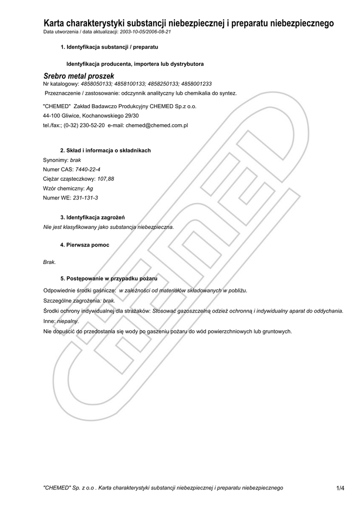 Karta charakterystyki substancji niebezpiecznej i preparatu niebezpiecznego Data utworzenia / data aktualizacji: 2003-10-05/2006-08-21 1. Identyfikacja substancji / preparatu Identyfikacja producenta, importera lub dystrybutora Srebro metal proszek Nr katalogowy: 4858050133; 4858100133; 4858250133; 4858001233 Przeznaczenie / zastosowanie: odczynnik analityczny lub chemikalia do syntez. "CHEMED" Zakład Badawczo Produkcyjny CHEMED Sp.z o.o. 44-100 Gliwice, Kochanowskiego 29/30 tel./fax:; (0-32) 230-52-20 e-mail: [email protected] 2. Skład i informacja o składnikach Synonimy: brak Numer CAS: 7440-22-4 Ciężar cząsteczkowy: 107,88 Wzór chemiczny: Ag Numer WE: 231-131-3 3. Identyfikacja zagrożeń Nie jest klasyfikowany jako substancja niebezpieczna. 4. Pierwsza pomoc Brak. 5. Postępowanie w przypadku pożaru Odpowiednie środki gaśnicze: w zależności od materiałów składowanych w pobliżu. Szczególne zagrożenia: brak. Środki ochrony indywidualnej dla strażaków: Stosować gazoszczelną odzież ochronną i indywidualny aparat do oddychania. Inne: niepalny. Nie dopuścić do przedostania się wody po gaszeniu pożaru do wód powierzchniowych lub gruntowych. "CHEMED" Sp. z o.o . Karta charakterystyki substancji niebezpiecznej i preparatu niebezpiecznego 1/4 Srebro metal proszek 6. Postępowanie w przypadku niezamierzonego uwolnienia do środowiska Unikać pylenia i wdychania pyłów. Ostrożnie zebrać na sucho, przekazać do odzysku. Oczyścić zanieczyszczony teren. Nie dopuścić do dostania się do wód, ścieków i gleby. 7. Postępowanie z substancją / preparatem i jej / jego magazynowanie Obchodzenie się z substancją: Zapewnić skuteczną wymianę powietrza (wentylacja). Postępować zgodnie z zasadami dobrej praktyki przemysłowej oraz ogólnymi zasadami bezpieczeństwa i higieny pracy z substancjami chemicznymi. Stosować środki ochrony osobistej zgodnie z pkt.8. Nie opróżniać do kanalizacji. Magazynowanie: szczelne opakowania. 8. Kontrola narażenia i środki ochrony indywidualnej Parametry kontroli (NDS, NDSCh, NDSP): NDS: 0,05 mg/m3). Stosować odpowiednią wentylację wywiewną, miejscową i ogólną zapewniającą utrzymanie stężenia produktu w powietrzu poniżej określonych limitów (minimum 10-krotna wymiana powietrza na godzinę). Zaleca się wyposażenie miejsca pracy w wodny natrysk do płukania oczu oraz prysznic. Środki ochrony indywidualnej powinny być tak zaprojektowane i wykonane aby wykluczały zagrożenie i inne niedogodności w przewidywanych warunkach użytkowania, chroniące przed chemikaliami. Dz. U. nr 217, Rozporządzenie z dnia 29 listopada 2002 (poz. 1833); Dz. U. nr 80, Rozporządzenie z dnia 31 marca 2003 (poz. 725), Dz. U. nr212(poz. 1769), Rozporządzenie Ministra Gospodarki i Pracy z dnia 10 października 2005 Środki ochrony indywidualnej: ochrona dróg oddechowych: niekonieczna ochrona oczu: niekonieczna ochrona rąk: niekonieczna ochrona ciała: niekonieczna środki ochronne i higieny: wymyć ręce po pracy z tą substancją. 9. Własności fizykochemiczne Forma: ciało stałe lepkość dynamiczna: Kolor: srebrzysto-szary lepkość kinematyczna: Zapach: bez zapachu Ciśnienie par: nie dotyczy pH: nie dotyczy Gęstość: 10,5 g/cm3 (20°C) Temperatura topnienia: 961,9°C Ciężar nasypowy: brak danych Temperatura wrzenia: 2212°C Rozpuszczalność: Temperatura samozapłonu: nie dotyczy w wodzie: nierozpuszczalne Temperatura zapłonu: nie dotyczy w rozpuszczalnikach organicznych: nierozpuszczalne Granice wybuchowości: nie dotyczy log P(w/o): dolna: górna: "CHEMED" Sp. z o.o . Karta charakterystyki substancji niebezpiecznej i preparatu niebezpiecznego 2/4 Srebro metal proszek 10. Stabilność i reaktywność Warunki których należy unikać: brak. Materiały których należy unikać: azydki, tlenek etylenu, substancje nadtlenkowe. Niebezpieczne produkty rozkładu: brak danych. Następne dane: czuły na światło. 11. Informacje toksykologiczne Informacje toksykologiczne: brak Pozostałe dane: brak. 12. Informacje ekologiczne Nie dotyczy. 13. Postępowanie z odpadami ZBP CHEMED przyjmuje do likwidacji substancje i opakowania po tych substancjach zakupione w ZBP CHEMED. Utylizacją odpadów powinny zająć się wyspecjalizowane firmy. Opakowanie jednorazowego ubytku traktować jak odpad i przekazać odbiorcy odpadów. Sposób likwidacji zebranych odpadów uzgodnić z właściwym terenowo wydziałem ochrony środowiska. Ustawy z dnia 27.04.2001 (Dz. U. nr 62, poz. 628), z dnia 11.05.2001 (Dz. U. nr 63 poz. 638)z poźn. zm. Rozporządzenie z dnia 27.09.2001 (Dz. U. nr 112, poz. 1206) 14. Informacje o transporcie Klasa ADR i grupa pakowania: nie jest przedmiotem przepisów transportowych Numer UN: nie dotyczy Nazwa materiału (wg UN): nie dotyczy "CHEMED" Sp. z o.o . Karta charakterystyki substancji niebezpiecznej i preparatu niebezpiecznego 3/4 Srebro metal proszek 15. Informacje dotyczące przepisów prawnych Symbol i oznaczenie zagrożenia produktu: nie dotyczy. R: nie dotyczy. S: nie dotyczy. Oznakowanie WE. Dz. U. nr 171, Rozporządzenie z dnia 2 września 2003 (poz. 1666), Dz. U. nr 169, Obwieszczenie z dnia 28 sierpnia 2003 (poz. 1650), Dz. U. nr 173, Rozporządzenie z dnia 2 września 2003 (poz. 1679), Dz. U. nr 168, Rozporządzenie z dnia 5 lipca 2004 (poz. 1762), Dz. U. nr 260, Rozporządzenie z dnia 9 listopada 2004 (poz. 2595), Dz. U. nr 2, Rozporządzenie z dnia 14 grudnia 2004 (poz. 8), Dz. U. nr 140, Rozporządzenie z dnia 3 lipca 2002 (poz. 1171), Dz. U. nr 243, Rozporządzenie z dnia 29 października 2004 (poz. 2440), Dz. U. nr11, Ustawa z dnia 11 stycznia 2001 (poz. 84) z poźn. zm. Dz. U. nr142, Ustawa z dnia 5 lipca 2002 (poz. 1187), Dz. U. nr 201, Rozporządzenie z dnia 28 września 2005 (poz. 1674) 16. Inne informacje Informacje oparte są na naszym aktualnym stanie wiedzy i doświadczeniu. Należy je traktować wyłącznie jako pomoc dla bezpiecznego stosowania produktu. Główne źródła danych: ULMANN'S EN