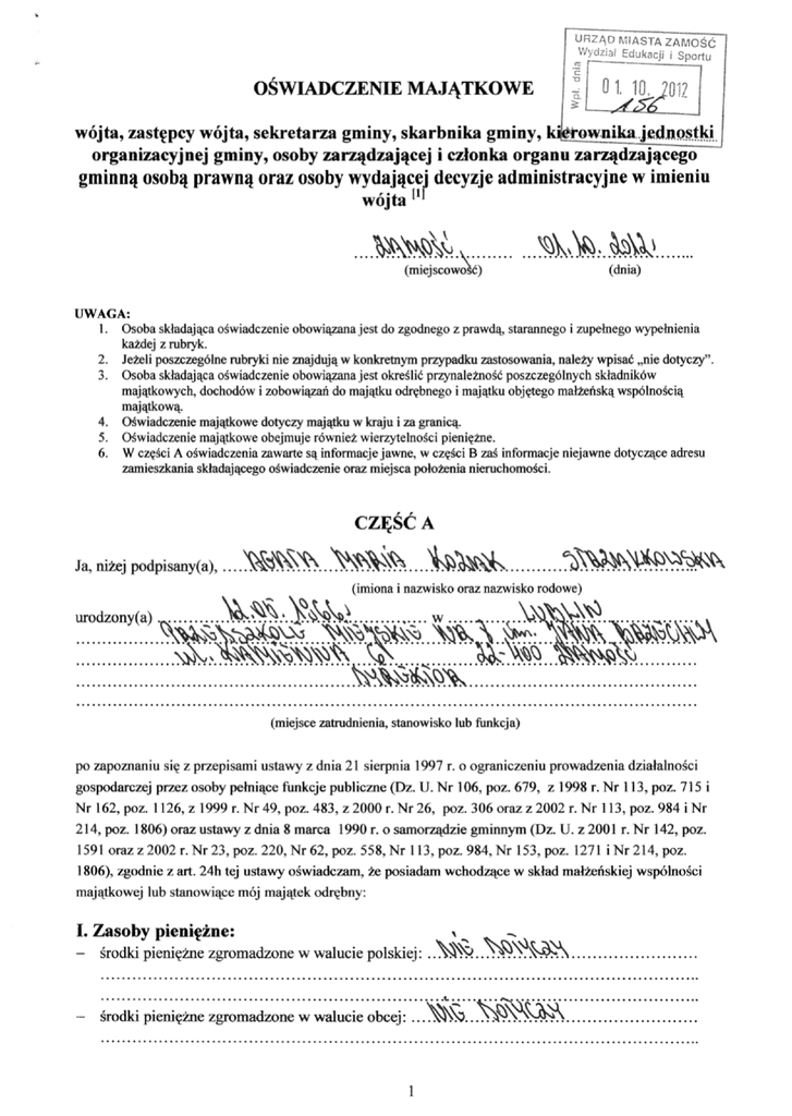 URZĄD MIASTA ZAMOŚĆ Wydział Edukacji i Sportu OŚWIADCZENIE MAJĄTKOWE 01.JU012 wójta, zastępcy wójta, sekretarza gminy, skarbnika gminy, kierownika jednostki organizacyjnej gminy, osoby zarządzającej i członka organu zarządzającego gminną osobą prawną oraz osoby wydającej decyzje administracyjne w imieniu wójta'' (miejscowość) (dnia) UWAGA: 1. Osoba składająca oświadczenie obowiązana jest do zgodnego z prawdą, starannego i zupełnego wypełnienia każdej z rubryk. 2. Jeżeli poszczególne rubryki nie znajdują w konkretnym przypadku zastosowania, należy wpisać „nie dotyczy' 3. Osoba składająca oświadczenie obowiązana jest określić przynależność poszczególnych składników majątkowych, dochodów i zobowiązań do majątku odrębnego i majątku objętego małżeńską wspólnością majątkową. 4. Oświadczenie majątkowe dotyczy majątku w kraju i za granicą. 5. Oświadczenie majątkowe obejmuje również wierzytelności pieniężne. 6. W części A oświadczenia zawarte są informacje jawne, w części B zaś informacje niejawne dotyczące adresu zamieszkania składającego oświadczenie oraz miejsca położenia nieruchomości. CZĘŚĆ A Ja, niżej podpisany(a), . . . .^^W^. . .^ (imiona i nazwisko oraz nazwisko rodowe) urodzonWai ui \j\j£-i\jitj y *•*/ *f (miejsce zatrudnienia, stanowisko lub funkcja) po zapoznaniu się z przepisami ustawy z dnia 21 sierpnia 1997 r. o ograniczeniu prowadzenia działalności gospodarczej przez osoby pełniące funkcje publiczne (Dz. U. Nr 106, póz. 679, z 1998 r. Nr 1 13, póz. 715 i Nr 162, póz. 1 126, z 1999 r. Nr 49, póz. 483, z 2000 r. Nr 26, póz. 306 oraz z 2002 r. Nr 113, póz. 984 i Nr 214, póz. 1806) oraz ustawy z dnia 8 marca 1990 r. o samorządzie gminnym (Dz. U. z 200 1 r. Nr 142, póz. 1591 oraz z 2002 r. Nr 23, póz. 220, Nr 62, póz. 558, Nr 1 13, póz. 984, Nr 153, póz. 1271 i Nr 214, póz. 1 806), zgodnie z art. 24h tej ustawy oświadczam, że posiadam wchodzące w skład małżeńskiej wspólności majątkowej lub stanowiące mój majątek odrębny: L Zasoby pieniężne: - środki pieniężne zgromadzone w walucie polskiej : - środki pieniężne zgromadzone w walucie obcej: - papiery wartościowe:..]x?fYO. ........................................................ t\ fs. na kwotę: ........................ . \\ l . Dom o powierzchni: ..... /j^A ........ m2, o wartości: .KiY^ \;rr.i.\.t tytuł prawny: vp ^.Sti^teK^....^^ c^c\ f\r^\ / ^ 2. Mieszkanie o powierzchni: . . . ^......m2. o wartości: ^3y.«. NWA*... tytuł prawny: te.ŚSs§S*^^ 3. Gospodarstwo rolne: rodzaj gospodarstwa: siTO..Vaiv.\SWt\.., powierzchnia: o wartości: ....................................... rodzaj zabudowy: tytuł prawny: Z tego tytułu osiągnąłem(ęłam) w roku ubiegłym przychód i dochód d c h ó d w wysokości: wysokości: ....... ...... 4. Inne memchomości:owierzchmaa:..m^ owartości: tytuł prawny : III. Posiadam udziały w spółkach handlowych ^ należy podać liczbę i emitenta udziałów: udziały te stanowią pakiet większy niż 1 0% udziałów w spółce: . \0i . . Z tego tytułu osiągnąłem(ęłam) w roku ubiegłym dochód w wysokości: IV. Posiadam akcje w spółkach handlowych - należy podać liczbę i emitenta akcji: akcje te stanowią pakiet większy niż 10% akcji w spółce: Z tego tytułu osiągnąłem(ęłam) w roku ubiegłym dochód w wysokości: V. Nabyłem(am) (nabył mój małżonek, z wyłączeniem mienia przynależnego do jego majątku odrębnego) od Skarbu Państwa, innej państwowej osoby prawnej, jednostek samorządu terytorialnego, ich związków lub od komunalnej osoby prawnej następujące mienie, które podlegało zbyciu w Brodze przetargu - należy podać opis mienia i datę nabycia, od kogo: .. VI. l. Prowadzę działalność gospodarczą1 ^ (należy podaćjbrmę prawną i przedmiot działalności): .\. •K: - osobiście ....mNł....\^\^ft5l\ > ...., , A v Ł» \ ^Sv CN.\^.\ ^ *^ v • - wspólnie z innymi osobami \Sx§..AWN./iSJ^\ Z tego tytułu osiągnąłem(ęłam) w roku ubiegłwi rjrzychód i dochód w wysokości: 2. Zarządzam działalnością gospodarczą lub jestem przedstawicielem, pełnomocnikiem takiej działalności (należy podać formę prawną i przedmiot działalności): - wspólnie z innymi osobami. .1. Z tego tytułu osiągnąłem(ęłam) w roku ubiegłym dochód w wysokości: VII. 1. W spółkach handlowych (nazwa, siedziba spółki): - jestem członkiem zarządu (od kiedy): Nk' - jestem członkiem rady nadzorczej (od kiedy): - jestem członkiem komisji rewizyjnej (od kiedy) \ Z tego tytułu osiągnałem(ęłam) w roku ubiegłym dochód w wysokości: . . .^iVO. . . A^.^SH A 2. W spółdzielniach: ... - jestem członkiem zarządu (od kiedy): - jestem członkiem rady nadzorczej[3] (od kiedy): - jestem członkiem komisji rewizyjnej (od kiedy): ....^.>W... Z tego tytułu osiągnąłem(ęłam) w roku ubiegłym dochód w wysokości: 3. W fundacjach prowadzących działalność gospodarczą: - jestem członkiem zarządu (od kiedy):....x - jestem członkiem rady nadzorczej (odkiedy): - jestem członkiem komisji rewizyjnej (odkiedy):. Z tego tytułu osiągnąłem(ełam) w roku ubiegłym dochód w wysokości: VIII. Inne dochody osiągane z tytułu zatrudnienia lub innej działalności zarobkowej lub zajęć, z wot uzyskiwanych z każdego tytułu: ..., * .,....„.. x. * Cv\... y\ Ł ¥ ........v*. K \ IX. Składniki mienia ruchomego o wartości powyżej 10 000 złotych (w przypadku pojazdów mechaniznch,należ oodać markę, jjiodel i rok fifodukcji): ...., .r...^ŁA..7 SS»\H& X. Zobowiązania pieniężne o wartości powyżej 10 000 złotych, w tym zaciągnięte kredyty i pożyczki oraz warunki,* na jakicKzostały udzielone (wobec kogo, w związku z jakim zdarzeniem, w ^ ~ ^ ' jakiej wysokości):
