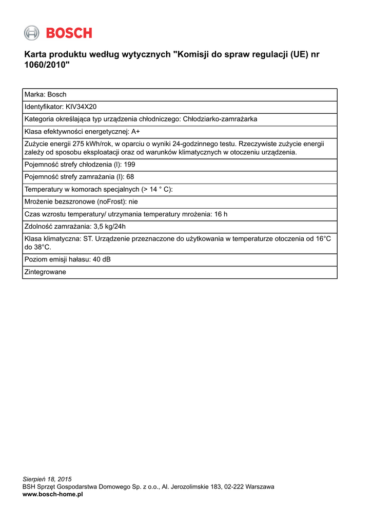 Karta produktu według wytycznych "Komisji do spraw regulacji (UE) nr 1060/2010" Marka: Bosch Identyfikator: KIV34X20 Kategoria określająca typ urządzenia chłodniczego: Chłodziarko-zamrażarka Klasa efektywności energetycznej: A+ Zużycie energii 275 kWh/rok, w oparciu o wyniki 24-godzinnego testu. Rzeczywiste zużycie energii zależy od sposobu eksploatacji oraz od warunków klimatycznych w otoczeniu urządzenia. Pojemność strefy chłodzenia (l): 199 Pojemność strefy zamrażania (l): 68 Temperatury w komorach specjalnych (> 14 ° C): Mrożenie bezszronowe (noFrost): nie Czas wzrostu temperatury/ utrzymania temperatury mrożenia: 16 h Zdolność zamrażania: 3,5 kg/24h Klasa klimatyczna: ST. Urządzenie przeznaczone do użytkowania w temperaturze otoczenia od 16°C do 38°C. Poziom emisji hałasu: 40 dB Zintegrowane Sierpień 18, 2015 BSH Sprzęt Gospodarstwa Domowego Sp. z o.o., Al. Jerozolimskie 183, 02-222 Warszawa www.bosch-home.pl