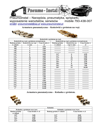 Pneumoinstal – Narzędzia, pneumatyka, sprężarki, wyposażenie warsztatów, serwisów mobile 793-438-007 em@il: [email protected] www.pneumoinstal.pl Armatura pneumatyczna – Końcówki z gwintem na wąż. Końcówki z gwintem na wąż. Końcówki na wąż z gwintem zewnętrznym Końcówki na wąż z gwintem wewnętrznym Rodzaj gwintu Końcówka na wąż Cena brutto w Rodzaj gwintu Końcówka na Cena brutto w w calach w mm zł w calach wąż w mm zł M5 2 4,54 ------------------------------M5 4 4,00 ------------------------------1/8” 6 3,50 ------------------------------1/8” 8 3,50 ------------------------------1/4" 6 4,00 1/4" 6 4,50 1/4" 8 4,00 1/4" 8 5,00 1/4" 10 4,00 1/4" 10 6,00 1/4" 13 4,50 1/4" 12 5,00 3/8” 6 4,50 3/8” 6 4,50 3/8” 8 4,50 3/8” 8 7,00 3/8” 10 5,00 3/8” 10 7,00 3/8” 13 5,00 3/8” 13 10,50 3/8” 16 5,66 ------------------------------1/2" 6 5,00 ------------------------------1/2" 8 5,66 ------------------------------1/2" 10 5,66 ------------------------------1/2" 13 7,00 ------------------------------1/2" 16 7,00 ------------------------------1/2" 19 9,00 ------------------------------3/4" 16 13,00 ------------------------------3/4" 19 13,00 ------------------------------3/4" 25 13,00 ------------------------------1” 25 16,00 ------------------------------- Armatura pneumatyczna – Kolanko z gwintem. Kolanko Kolanko z gwintem wew./zew. Rodzaj gwintu Cena brutto w zł w calach 1/8” 5,00 1/4" 6,00 3/8” 8,00 1/2" 10,00 Kolanko z gwintem wew./wew. Rodzaj gwintu w calach Cena brutto w zł 1/4" 3/8” 1/2" 3/4" 8,00 10,00 10,00 12,00 Pneumoinstal – Narzędzia, pneumatyka, sprężarki, wyposażenie warsztatów, serwisów mobile 793-438-007 em@il: [email protected] www.pneumoinstal.pl Armatura pneumatyczna – Rozgałęźniki bez szybkozłączek. Rozgałęźniki Rozgałęźniki typ ”Y” - Trójnik Rodzaj gwintu Cena brutto w zł w calach 1/4" 8,00 3/8” 14,00 1/2" 17,00 Rozgałęźnik typ ”T” - Trójnik Rodzaj gwintu Cena brutto w zł w calach 1/4” 6,00 3/8” 9,00 1/2" 12,00 Rozgałęźniki typ ”Y” - Czwórnik Rodzaj gwintu Cena brutto w zł w calach 1/4" -----------3/8” 27,00 1/2" 30,00 Rozgałęźnik typ ”T” - Czwórnik Rodzaj gwintu Cena brutto w zł w calach 1/4” 12,00 3/8” 18,00 1/2" 28,00 Armatura pneumatyczna – Rozgałęźniki z szybkozłączkami. Rozgałęźniki Rozgałęźniki typ ”Y” - Trójnik Rodzaj gwintu Cena brutto w zł w calach 1/4" 35,00 3/8” 43,00 1/2" 44,00 Rozgałęźniki typ ”Y” - Czwórnik Rodzaj gwintu Cena brutto w zł w calach 1/4" -----------3/8” 67,00 1/2" 70,00 Pneumoinstal – Narzędzia, pneumatyka, sprężarki, wyposażenie warsztatów, serwisów mobile 793-438-007 em@il: [email protected] www.pneumoinstal.pl Armatura pneumatyczna – Kostki aluminiowe i rozdzielacze. Rozgałęźniki Kostka aluminiowa - Trójnik Rodzaj gwintu Cena brutto w zł w calach 3x1/8” 16,00 3x1/4" 21,00 3x3/8” 26,00 3x1/2" 30,00 3x3/4” 45,00 Rozdzielacz aluminiowy - Trójnik Rodzaj gwintu Cena brutto w zł w calach 2x3/8”x3x1/4” 40,00 Kostka aluminiowa - Czwórnik Rodzaj gwintu Cena brutto w zł w calach 4x1/8” 17,00 4x1/4" 19,00 4x3/8” 27,00 4x1/2" 30,00 4x3/4” 50,00 Rozdzielacz aluminiowy - Czwórnik Rodzaj gwintu Cena brutto w zł w calach 2x3/8”x4x1/4” 52,00 Armatura pneumatyczna – Złączki obrotowe i grodziowe. Rodzaj gwintu w calach -----------1/4" 3/8” 1/2" 3/4" Złączki obrotowe i grodziowe Złączki obrotowe Cena brutto w zł Rodzaj gwintu w calach -----------1/8” 8,00 1/4" 10,50 3/8” 8,50 -----------12,00 ------------ Złączki grodziowe Cena brutto w zł 6,50 11,00 16,00 ----------------------- Pneumoinstal – Narzędzia, pneumatyka, sprężarki, wyposażenie warsztatów, serwisów mobile 793-438-007 em@il: [email protected] www.pneumoinstal.pl Armatura pneumatyczna – Redukcje z/w i w/z. Redukcje Redukcje z gwintem z/w Rodzaj gwintu Cena brutto w zł w calach 1/4"z / 1/8”w 2,00 3/8”z / 1/4”w 2,50 1/2"z / 3/8”w 2,50 3/4"z / 1/2"w 3,50 1”z / 3/4 ”w 9,00 3/8”z / 1/8”w 4,00 1/2”z / 1/4"w 4,00 1”z / 1/2"w 7,00 Redukcje z gwintem w/z Rodzaj gwintu Cena brutto w zł w calach 1/4"w / 1/8”z 3,00 3/8”w / 1/4"z 4,00 1/2”w / 1/4”z 6,50 1/2"w / 3/8”z 7,00 3/4"w / 1/2"z 7,00 ------------------------------------------------------------------- Armatura pneumatyczna – Mufy i mufy redukcyjne w/w. Rodzaj gwintu w calach 1/8"w / 1/8”w 1/4”w / 1/4”w 3/8"w / 3/8”w 1/2"w / 1/2"w 3/4”w / 3/4 ”w 1”w / 1”w Mufy i mufy redukcyjne w/w Mufy z gwintem w/w Mufy Redukcyjne z gwintem w/w Cena brutto w zł Rodzaj gwintu Cena brutto w zł w calach 2,70 1/4"w / 1/8”w 3,50 3,50 3/8”w / 1/4"w 4,00 4,00 1/2"w / 1/4”w 6,50 5,50 1/2"w / 3/8”w 5,50 5,50 3/4"w / 1/2"w 5,50 8,50 1”w / 3/4"w 8,00 Pneumoinstal – Narzędzia, pneumatyka, sprężarki, wyposażenie warsztatów, serwisów mobile 793-438-007 em@il: [email protected] www.pneumoinstal.pl Armatura pneumatyczna – Nyple i nyple redukcyjne. Nyple i nyple redukcyjne z/z Nyple z gwintem z/z Nyple Redukcyjne z gwintem z/z Rodzaj gwintu Cena brutto w zł Rodzaj gwintu Cena brutto w zł w calach w calach 1/8"z / 1/8”z 2,50 1/4"z / 1/8”z 3,50 1/4”z / 1/4”z 3,00 3/8”z / 1/4"z 3,50 3/8"z / 3/8”z 3,00 1/2"z / 1/4”z 6,00 1/2"z / 1/2”z 3,50 1/2"z / 3/8”z 3,50 3/4”z / 3/4 ”z 4,50 3/4"z / 1/2"z 4,50 1”z / 1”z 8,00 1”z / 3/4"z 8,00 Armatura pneumatyczna – Zatyczka – Korek. Zatyczka - korek Zatyczka sześciokątna z gwintem Rodzaj gwintu Cena brutto w zł w calach 1/8”z 2,50 1/4”z 2,50 3/8”z 4,00 1/2”z 5,00 3/4”z 5,00 Zatyczka na imbus z gwintem w/w Rodzaj gwintu Cena brutto w zł w calach 1/8”z 3,00 1/4”z 3,50 3/8”z 4,00 1/2”z 5,00 3/4”z ------------ Pneumoinstal – Narzędzia, pneumatyka, sprężarki, wyposażenie warsztatów, serwisów mobile 793-438-007 em@il: [email protected] www.pneumoinstal.pl Armatura pneumatyczna – Tłumiki. Tłumiki T
