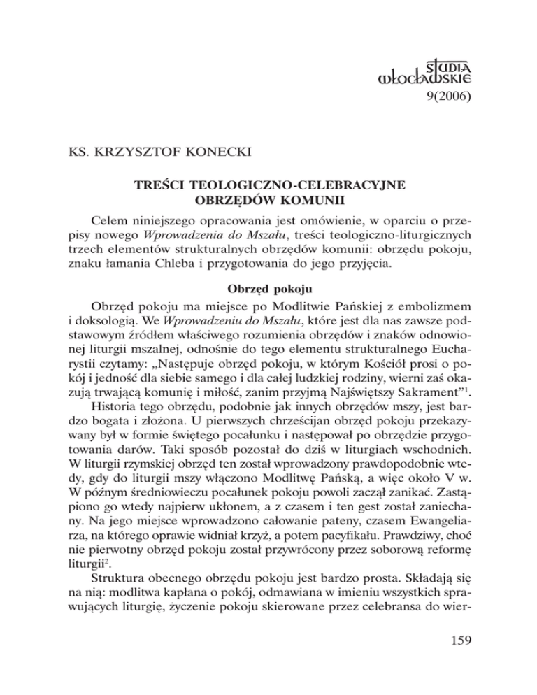 9(2006) KS. KRZYSZTOF KONECKI TREŚCI TEOLOGICZNO-CELEBRACYJNE OBRZĘDÓW KOMUNII Celem niniejszego opracowania jest omówienie, w oparciu o przepisy nowego Wprowadzenia do Mszału, treści teologiczno-liturgicznych trzech elementów strukturalnych obrzędów komunii: obrzędu pokoju, znaku łamania Chleba i przygotowania do jego przyjęcia. Obrzęd pokoju Obrzęd pokoju ma miejsce po Modlitwie Pańskiej z embolizmem i doksologią. We Wprowadzeniu do Mszału, które jest dla nas zawsze podstawowym źródłem właściwego rozumienia obrzędów i znaków odnowionej liturgii mszalnej, odnośnie do tego elementu strukturalnego Eucharystii czytamy: „Następuje obrzęd pokoju, w którym Kościół prosi o pokój i jedność dla siebie samego i dla całej ludzkiej rodziny, wierni zaś okazują trwającą komunię i miłość, zanim przyjmą Najświętszy Sakrament”1. Historia tego obrzędu, podobnie jak innych obrzędów mszy, jest bardzo bogata i złożona. U pierwszych chrześcijan obrzęd pokoju przekazywany był w formie świętego pocałunku i następował po obrzędzie przygotowania darów. Taki sposób pozostał do dziś w liturgiach wschodnich. W liturgii rzymskiej obrzęd ten został wprowadzony prawdopodobnie wtedy, gdy do liturgii mszy włączono Modlitwę Pańską, a więc około V w. W późnym średniowieczu pocałunek pokoju powoli zaczął zanikać. Zastąpiono go wtedy najpierw ukłonem, a z czasem i ten gest został zaniechany. Na jego miejsce wprowadzono całowanie pateny, czasem Ewangeliarza, na którego oprawie widniał krzyż, a potem pacyfikału. Prawdziwy, choć nie pierwotny obrzęd pokoju został przywrócony przez soborową reformę liturgii2. Struktura obecnego obrzędu pokoju jest bardzo prosta. Składają się na nią: modlitwa kapłana o pokój, odmawiana w imieniu wszystkich sprawujących liturgię, życzenie pokoju skierowane przez celebransa do wier- 159 nych i ich odpowiedź oraz przekazanie sobie nawzajem przez wiernych znaku pokoju. Modlitwa o pokój skierowana jest do Chrystusa i składa się niejako z dwóch części: zaproszenia do modlitwy i następującej po nim właściwej modlitwy. Polska edycja mszału podaje warianty pierwszej części tej modlitwy, dostosowane do poszczególnych okresów roku liturgicznego i uroczystości3. Z treści tych modlitw, jak również ze znaczenia biblijnego i liturgicznego terminu „pokój”, wynika, że nie chodzi tu o pokój, który może nam zaofiarować świat, ale chodzi o pokój Chrystusowy, który jest darem Ducha Świętego. Ten zaś jest czymś znacznie więcej niż pokój, który rozumiemy w potocznym tego słowa znaczeniu. Pokój, o który prosi Chrystusa Kościół, wskazuje nie tylko na brak wojen w świecie, ale oznacza wszelką możliwą pomyślność i szczęśliwość. W znaczeniu biblijnym pokój oznacza dobrobyt codziennej egzystencji, stan człowieka, który żyje w doskonałej harmonii z przyrodą, ze sobą i z Bogiem. Konkretnie jest on błogosławieństwem, odpoczynkiem, chwałą, bogactwem, zbawieniem i życiem. Dla chrześcijanina pokój jest owocem Ducha Świętego, a zatem bezpośrednim skutkiem lub nawet istotnym atrybutem miłości (Gal 5, 22). Ten, kto posiada miłość i kocha Boga, pozostaje w pokoju, którego nic nie może zamącić. Ten, kto posiada miłość, jest dobry, cierpliwy, wyrozumiały, chętnie przebaczający, zapominający o tym, co złe, i wskutek tego rozsiewa pokój wokół siebie (Mt 5, 9; Łk 6, 27–36; J 15, 12–17). Po zaniesieniu do Boga prośby o dar pokoju celebrans życzy go wszystkim, mówiąc: „Pokój Pański niech zawsze będzie z wami”. Lud odpowiada: „I z duchem twoim”. Następnie diakon lub jeden z koncelebransów dodaje: „Przekażcie sobie znak pokoju”. Wówczas wszyscy w ustalony sposób okazują sobie miłość braterską, która ma panować wśród nich. „Ci, którzy stoją bliżej głównego celebransa, od niego otrzymują znak pokoju, przed diakonem”4. Należy jednak pamiętać, że gest pojednania, który wykonują wierni jest nie tylko znakiem ludzkiej serdeczności i życzliwości, ale – powtórzmy to jeszcze raz – darem Boga. Gest ten zawiera głębokie życzenie, które należy odczytać w sytuacji sakramentalnej komunii oraz eschatologicznej jedności. W chrześcijaństwie bowiem nie ma prawdziwej komunii z Bogiem z pominięciem człowieka. Przeciwnie, najkrótsza droga do Boga prowadzi przez drugiego człowieka. Na koniec słowo o sposobie przekazywania tego znaku. Podobnie jak wszystkie znaki i gesty we mszy, tak i ten zastrzeżony jest poszczególnym konferencjom episkopatu. One to, biorąc pod uwagą mentalność ludzi i lokalne zwyczaje, mają prawo decydowania i określenia, jak ten obrzęd 160 ma wyglądać5. U nas w Polsce we mszach z ogółem wiernych znak ten przekazywany jest przez ukłon w stronę najbliżej stojących uczestników liturgii lub przez podanie im ręki. Ten gest wykonuje się w milczeniu lub wypowiada słowa: „Pokój Pański niech zawsze będzie z tobą” albo: „Pokój z tobą”, na co przyjmujący odpowiada: „Amen”, nigdy zaś, jak w przypadku pozdrowienia celebransa: „I z duchem Twoim”. Dla podkreślenia jednak charakteru wspólnotowego liturgii należy zachować jednolitość znaku w danym zgromadzeniu liturgicznym. Nie wolno używać formuły: „Pokój nam wszystkim”. Kapłan może przekazywać znak pokoju usługującym, zawsze jednak pozostaje w prezbiterium, aby nie zakłócać celebracji i nie czynić zamieszania. Niech uczyni podobnie, to znaczy pozostanie w prezbiterium, jeśli dla słusznej przyczyny pragnie przekazać znak pokoju niektórym wiernym. Wypada, aby każdy z umiarem przekazywał znak pokoju tylko osobom najbliżej stojącym6. Wszystko to podyktowane jest troską, aby znak pokoju był czytelny, prosty, wykonany z godnością i pomagający przeżywaniu liturgii, a nie wprowadzał niepotrzebnego rozproszenia i zamieszania. Łamanie Chleba Po obrzędzie poko