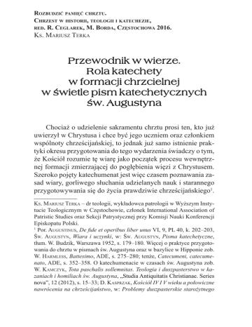 Rozbudzić pamięć chrztu. Chrzest w historii, teologii i katechezie, red. R. Ceglarek, M. Borda, Częstochowa 2016. Ks. Mariusz Terka Przewodnik w wierze. Rola katechety w formacji chrzcielnej w świetle pism katechetycznych św. Augustyna Chociaż o udzielenie sakramentu chrztu prosi ten, kto już uwierzył w Chrystusa i chce być jego uczniem oraz członkiem wspólnoty chrześcijańskiej, to jednak już samo istnienie praktyki okresu przygotowania do tego wydarzenia świadczy o tym, że Kościół rozumie tę wiarę jako początek procesu wewnętrznej formacji zmierzającej do pogłębienia więzi z Chrystusem. Szeroko pojęty katechumenat jest więc czasem poznawania zasad wiary, gorliwego słuchania udzielanych nauk i starannego przygotowywania się do życia prawdziwie chrześcijańskiego1. Ks. Mariusz Terka – dr teologii, wykładowca patrologii w Wyższym Instytucie Teologicznym w Częstochowie, członek International Association of Patristic Studies oraz Sekcji Patrystycznej przy Komisji Nauki Konferencji Episkopatu Polski. 1 Por. Augustinus, De fide et operibus liber unus VI, 9, PL 40, k. 202–203, Św. Augustyn, Wiara i uczynki, w: Św. Augustyn, Pisma katechetyczne, tłum. W. Budzik, Warszawa 1952, s. 179–180. Więcej o praktyce przygotowania do chrztu w pismach św. Augustyna oraz w bazylice w Hipponie zob. W. Harmless, Battesimo, ADE, s. 275–280; tenże, Catecumeni, catecumenato, ADE, s. 352–358. O katechumenacie w czasach św. Augustyna zob. W. Kamczyk, Tota paschalis sollemnitas. Teologia i duszpasterstwo w kazaniach i homiliach św. Augustyna, „Studia Antiquitatis Christianae. Series nova”, 12 (2012), s. 15–33; D. Kasprzak, Kościół IV I V wieku a połowiczne nawrócenia na chrześcijaństwo, w: Problemy duszpasterskie starożytnego 224 Ks. Mariusz Terka Tym bowiem, co istotne w nim i co nadaje mu odpowiedni kierunek, jest takie ukształtowanie serca (instruere mentis) ucznia poprzez karmienie go pokarmem słowa Bożego2, by mógł on trzymać się chrześcijańskiej wiary i sposobu życia3. W świetle powyższych założeń można zauważyć, że ów proces kształtowania serca realizuje się na dwóch płaszczyznach i dotyczy zarówno nauczania prawd wiary, jak i poprawy życia, czyli uzgodnienia własnego postępowania z Bożymi przykazaniami. Te dwie drogi są jednak względem siebie współzależne, a nawet wzajemnie się warunkują, tak jak miłość Boga nie może istnieć bez miłości bliźniego, ani też nie można prawdziwie kochać bliźniego, nie miłując Boga4. Stąd też Hippończyk podkreśla za św. Pawłem Apostołem (1 Tm 1, 5), że ostatecznym celem katechumenatu nie jest nic innego jak miłość płynąca z czystego sumienia i wiary nieobłudnej5. Zasadę tę ujmuje on w następujących słowach: „To tedy umiłowanie wziąwszy sobie jako cel, do którego to wszystko, co mówisz masz odnosić, cokolwiek wykładasz, wykładaj tak, aby uczeń słuchając – wierzył, wierząc – miał nadzieję, a mając nadzieję – miłował”6. Kościoła, red. J. Pałucki, P. Szczur, M. Szram, M. Wysocki, Lublin 2009, s. 167–176; F. van der Meer, Augustinus der Seelsorger, Köln 1951, s. 414–423. O praktyce katechumenatu przed św. Augustynem oraz w kościołach wschodnich zob. H. Pietras, Początki teologii Kościoła, Kraków 2007, s. 55–64; F. Drączkowski, Sakramentologia patrystyczna w zarysie, Pelplin 2014, s. 13–28. 2 Por. Augustinus, De catechizandis rudibus liber unus XIV, 22, CCL 46, ed. I.B. Bauer, Turnholti 1969, s. 146, Św. Augustyn, Początkowe nauczanie religii, w: Św. Augustyn, Pisma katechetyczne, s. 28. 3 Por. tamże I, 1, CCL 46, s. 121, Św. Augustyn, Pisma katechetyczne, s. 1. 4 Por. tenże, De fide et operibus XII, 20, PL 40, k. 210–211, Św. Augustyn, Pisma katechetyczne, s. 194; W. Kamczyk, Tota paschalis sollemnitas…, dz. cyt., s. 267. 5 Por. Augustinus, De catechizandis rudibus III, 6, CCL 46, s. 125, Św. Augustyn, Pisma katechetyczne, s. 5. 6 Tamże IV, 8, CCL 46, s. 129: „Hac ergo dilectione tibi tamquam fine pro- Przewodnik w wierze... 225 Ta naczelna zasada i cel nauczania wiary, jaką jest miłość7, podkreśla właśnie konieczność osobistego zaangażowania się ucznia w proces własnego przygotowania do przyjęcia chrztu świętego, bo przecież nie chodzi w nim tylko o przekazanie zasad i norm moralnych, lecz o wspomniane wyżej ukształtowanie serca. Do tego jednak, by mogło ono nastąpić, konieczny jest jeszcze jeden element procesu formacji, a mianowicie katecheta. To bowiem do niego skierowane są przytoczone wyżej słowa o konieczności rozbudzenia miłości w sercu ucznia, do niego też należy nauczanie o dobrych obyczajach i wzywanie do ich zachowania8 oraz przekazywanie tajemnic wiary. To on jest także tym, kto winien ukazywać katechumenom drogi wiary i być dla nich przewodnikiem. Proces formacji serca ma więc w swoim podstawowym założeniu dopomóc uczniowi w nawiązaniu relacji z Chrystusem9. Oznacza to, że wydarzenie dojrzewania w wierze rozgrywa się wewnątrz relacji, jaka zachodzi pomiędzy nauczycielem i uczniem. Niemniej jednak, by ten proces należycie zrozumieć, należy rozważyć warunki możliwości kształtowania serc posito, quo referas omnia quae dicis, quidquid narras ita narra, ut ille cui loqueris audiendo credat, credendo speret, sperando amet”, Św. Augustyn, Pisma katechetyczne, s. 9–10. Por. tenże, Enchiridion ad Lautentium sive de fide, spe et caritate liber unus V, 1, PL 40, k. 233, Św. Augustyn, Podręcznik dla Wawrzyńca, czyli o wierze, nadziei i miłości, w: Św. Augustyn, Pisma katechetyczne, s. 79. 7 Por. tenże, De Symbolo sermo ad catechumenos II, 4, PL 40, k. 629, Św. Augustyn, Kazanie do katechumenów o wyznaniu wiary, w: Św. Augustyn, Pisma katechetyczne, s. 62; tenże, Enchiridion ad Lautentium V, 1, PL 40, k. 233, Św. Augustyn, Pisma katechetyczne, s. 79; W. Kamczyk, Tota paschalis sollemnitas…, dz. cyt., s. 262–271. 8 P