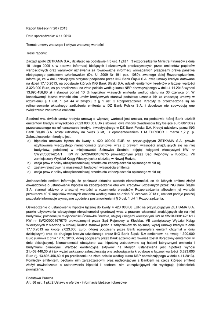 Raport bieżący nr 20 / 2013 Data sporządzenia: 4.11.2013 Temat: umowy znaczące i aktywa znacznej wartości Treść raportu: Zarząd spółki ZETKAMA S.A., działając na podstawie § 5 ust. 1 pkt 1 i 3 rozporządzenia Ministra Finansów z dnia 19 lutego 2009 r. w sprawie informacji bieżących i okresowych przekazywanych przez emitentów papierów wartościowych oraz warunków uznawania za równoważne informacji wymaganych przepisami prawa państwa niebędącego państwem członkowskim (Dz. U. 2009 Nr 191 poz. 1080), zwanego dalej Rozporządzeniem, informuje, że w dniu dzisiejszym otrzymał podpisane przez ING Bank Śląski S.A. dwie umowy kredytu datowane na dzień 17.10.2013, na podstawie których ING Bank Śląski S.A. udzielił emitentowi kredytów o łącznej wartości 3.323.000 Euro, co po przeliczeniu na złote polskie według kursu NBP obowiązującego w dniu 4.11.2013 wynosi 13.895.456,80 zł i stanowi ponad 10 % kapitałów własnych emitenta według stanu na 30 czerwca br. W konsekwencji łączna wartość obu umów kredytowych stanowi podstawę uznania ich za znaczącą umowę w rozumieniu § 1 ust. 1 pkt 44 w związku z § 1 ust. 2 Rozporządzenia. Kredyty te przeznaczone są na refinansowanie aktualnego zadłużenia emitenta w DZ Bank Polska S.A. i docelowo nie spowodują one zwiększenia zadłużenia emitenta. Spośród ww. dwóch umów kredytu umową o większej wartości jest umowa, na podstawie której Bank udzielił emitentowi kredytu w wysokości 2.023 000,00 EUR ( słownie: dwa miliony dwadzieścia trzy tysiące euro 00/100) ) przeznaczonego na refinansowanie kredytu inwestycyjnego w DZ Bank Polska S.A. Kredyt udzielony przez ING Bank Śląski S.A. został udzielony na okres 3 lat, z oprocentowaniem 1 M EURIBOR + marża 1,2 p. p. Zabezpieczeniem kredytu jest: a) hipoteka umowna łączna do kwoty 4 420 000,00 EUR na przysługującym ZETKAMA S.A. prawie użytkowania wieczystego nieruchomości gruntowej wraz z prawem własności znajdujących się na niej budynków, położonej w miejscowości Ścinawka Średnia, objętej księgami wieczystymi KW nr SW2K/00014251/1 i KW nr SW2K/00016767/5 prowadzonymi przez Sąd Rejonowy w Kłodzku, VII zamiejscowy Wydział Ksiąg Wieczystych z siedzibą w Nowej Rudzie, b) cesja praw z polisy ubezpieczeniowej przedmiotu zabezpieczenia opisanego w pkt a), c) zastaw rejestrowy na maszynach będących własnością emitenta, d) cesja praw z polisy ubezpieczeniowej przedmiotu zabezpieczenia opisanego w pkt c); Jednocześnie emitent informuje, że ponieważ aktualna wartość nieruchomości, co do których emitent złożył oświadczenie o ustanowieniu hipoteki na zabezpieczenie obu ww. kredytów udzielanych przez ING Bank Śląski S.A. stanowi aktywo o znacznej wartości w rozumieniu przepisów Rozporządzenia albowiem jej wartość przekracza 10 % kapitałów własnych emitenta według stanu na dzień 30 czerwca 2013 r., emitent podaje poniżej pozostałe informacje wymagane zgodnie z postanowieniami § 5 ust. 1 pkt 1 Rozporządzenia. Oświadczenie o ustanowieniu hipoteki łącznej do kwoty 4 420 000,00 EUR na przysługującym ZETKAMA S.A. prawie użytkowania wieczystego nieruchomości gruntowej wraz z prawem własności znajdujących się na niej budynków, położonej w miejscowości Ścinawka Średnia, objętej księgami wieczystymi KW nr SW2K/00014251/1 i KW nr SW2K/00016767/5 prowadzonymi przez Sąd Rejonowy w Kłodzku, VII zamiejscowy Wydział Ksiąg Wieczystych z siedzibą w Nowej Rudzie stanowi jeden z załączników do opisanej wyżej umowy kredytu z dnia 17.10.2013 na kwotę 2.023.000 Euro, (której podpisany przez Bank egzemplarz emitent otrzymał w dniu dzisiejszym) oraz do drugiego kredytu udzielonego przez ING Bank Śląski S.A emitentowi na kwotę 1.300.000 Euro (umowa z dnia 17.10.2013, której podpisany przez Bank egzemplarz również został doręczony emitentowi w dniu dzisiejszym). Nieruchomości obciążane ww. hipoteką zabudowane są halami fabrycznymi emitenta i budynkami biurowymi. Wartość ewidencyjna aktywów na których ustanawiana jest hipoteka wynosi 21.408.440,30 zł i jak wyżej wskazano zabezpieczają one zobowiązania kredytowe o łącznej wartości 3.323.000 Euro (tj. 13.895.456,80 zł po przeliczeniu na złote polskie według kursu NBP obowiązującego w dniu 4.11.2013). Pomiędzy emitentem, osobami nim zarządzającymi oraz nadzorującym a Bankiem na rzecz którego emitent złożył oświadczenie o ustanowienia hipoteki i osobami nim zarządzającymi nie występują jakiekolwiek powiązania. Podstawa Prawna Art. 56 ust. 1 pkt 2 Ustawy o ofercie - informacje bieżące i okresowe