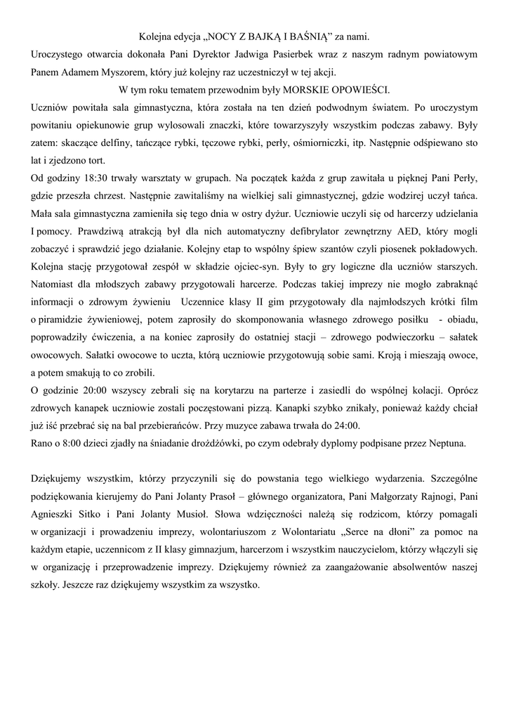 Kolejna edycja „NOCY Z BAJKĄ I BAŚNIĄ” za nami. Uroczystego otwarcia dokonała Pani Dyrektor Jadwiga Pasierbek wraz z naszym radnym powiatowym Panem Adamem Myszorem, który już kolejny raz uczestniczył w tej akcji. W tym roku tematem przewodnim były MORSKIE OPOWIEŚCI. Uczniów powitała sala gimnastyczna, która została na ten dzień podwodnym światem. Po uroczystym powitaniu opiekunowie grup wylosowali znaczki, które towarzyszyły wszystkim podczas zabawy. Były zatem: skaczące delfiny, tańczące rybki, tęczowe rybki, perły, ośmiorniczki, itp. Następnie odśpiewano sto lat i zjedzono tort. Od godziny 18:30 trwały warsztaty w grupach. Na początek każda z grup zawitała u pięknej Pani Perły, gdzie przeszła chrzest. Następnie zawitaliśmy na wielkiej sali gimnastycznej, gdzie wodzirej uczył tańca. Mała sala gimnastyczna zamieniła się tego dnia w ostry dyżur. Uczniowie uczyli się od harcerzy udzielania I pomocy. Prawdziwą atrakcją był dla nich automatyczny defibrylator zewnętrzny AED, który mogli zobaczyć i sprawdzić jego działanie. Kolejny etap to wspólny śpiew szantów czyli piosenek pokładowych. Kolejna stację przygotował zespół w składzie ojciec-syn. Były to gry logiczne dla uczniów starszych. Natomiast dla młodszych zabawy przygotowali harcerze. Podczas takiej imprezy nie mogło zabraknąć informacji o zdrowym żywieniu Uczennice klasy II gim przygotowały dla najmłodszych krótki film o piramidzie żywieniowej, potem zaprosiły do skomponowania własnego zdrowego posiłku - obiadu, poprowadziły ćwiczenia, a na koniec zaprosiły do ostatniej stacji – zdrowego podwieczorku – sałatek owocowych. Sałatki owocowe to uczta, którą uczniowie przygotowują sobie sami. Kroją i mieszają owoce, a potem smakują to co zrobili. O godzinie 20:00 wszyscy zebrali się na korytarzu na parterze i zasiedli do wspólnej kolacji. Oprócz zdrowych kanapek uczniowie zostali poczęstowani pizzą. Kanapki szybko znikały, ponieważ każdy chciał już iść przebrać się na bal przebierańców. Przy muzyce zabawa trwała do 24:00. Rano o 8:00 dzieci zjadły na śniadanie drożdżówki, po czym odebrały dyplomy podpisane przez Neptuna. Dziękujemy wszystkim, którzy przyczynili się do powstania tego wielkiego wydarzenia. Szczególne podziękowania kierujemy do Pani Jolanty Prasoł – głównego organizatora, Pani Małgorzaty Rajnogi, Pani Agnieszki Sitko i Pani Jolanty Musioł. Słowa wdzięczności należą się rodzicom, którzy pomagali w organizacji i prowadzeniu imprezy, wolontariuszom z Wolontariatu „Serce na dłoni” za pomoc na każdym etapie, uczennicom z II klasy gimnazjum, harcerzom i wszystkim nauczycielom, którzy włączyli się w organizację i przeprowadzenie imprezy. Dziękujemy również za zaangażowanie absolwentów naszej szkoły. Jeszcze raz dziękujemy wszystkim za wszystko.