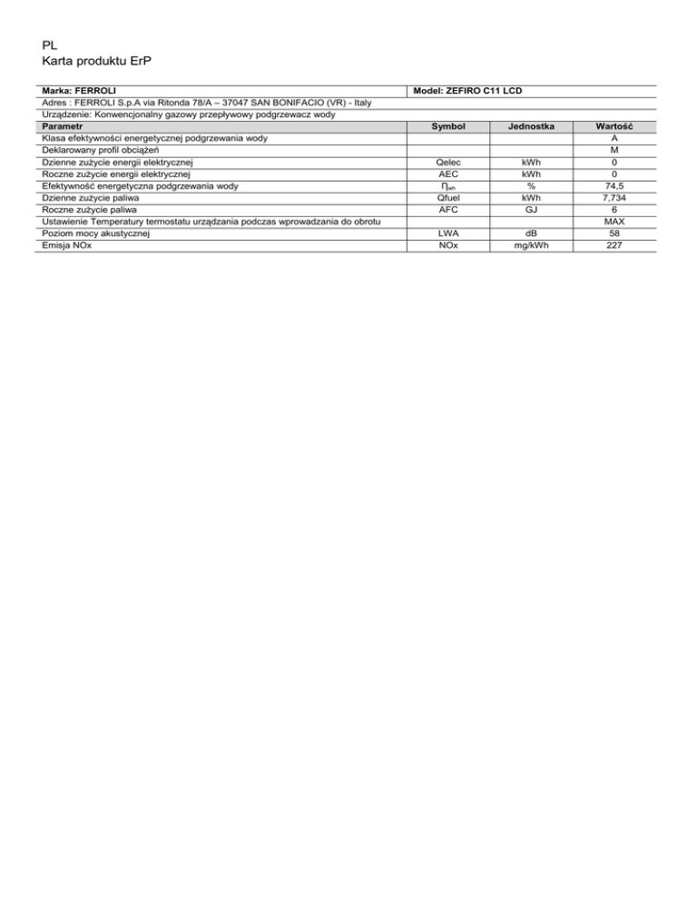 PL Karta produktu ErP Marka: FERROLI Adres : FERROLI S.p.A via Ritonda 78/A – 37047 SAN BONIFACIO (VR) - Italy Urządzenie: Konwencjonalny gazowy przepływowy podgrzewacz wody Parametr Klasa efektywności energetycznej podgrzewania wody Deklarowany profil obciążeń Dzienne zużycie energii elektrycznej Roczne zużycie energii elektrycznej Efektywność energetyczna podgrzewania wody Dzienne zużycie paliwa Roczne zużycie paliwa Ustawienie Temperatury termostatu urządzania podczas wprowadzania do obrotu Poziom mocy akustycznej Emisja NOx Model: ZEFIRO C11 LCD Symbol Jednostka Qelec AEC Ƞwh Qfuel AFC kWh kWh % kWh GJ LWA NOx dB mg/kWh Wartość A M 0 0 74,5 7,734 6 MAX 58 227 PL Karta produktu ErP Marka: FERROLI Adres : FERROLI S.p.A via Ritonda 78/A – 37047 SAN BONIFACIO (VR) - Italy Urządzenie: Konwencjonalny gazowy przepływowy podgrzewacz wody Parametr Klasa efektywności energetycznej podgrzewania wody Deklarowany profil obciążeń Dzienne zużycie energii elektrycznej Roczne zużycie energii elektrycznej Efektywność energetyczna podgrzewania wody Dzienne zużycie paliwa Roczne zużycie paliwa Ustawienie Temperatury termostatu urządzania podczas wprowadzania do obrotu Poziom mocy akustycznej Emisja NOx Model: ZEFIRO C14 LCD Symbol Jednostka Qelec AEC Ƞwh Qfuel AFC kWh kWh % kWh GJ LWA NOx dB mg/kWh Wartość A M 0 0 72,1 8,081 6 MAX 59 196