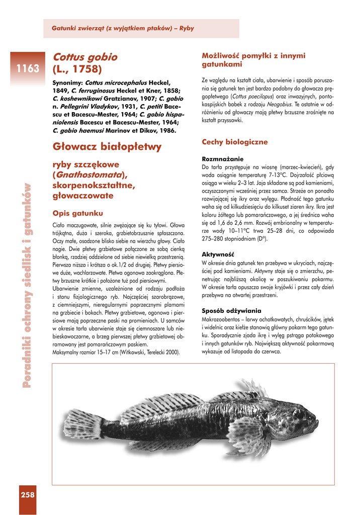 Gatunki zwierzàt (z wyjàtkiem ptaków) – Ryby 1163 Cottus gobio (L., 1758) Mo˝liwoÊç pomy∏ki z innymi gatunkami Synonimy: Cottus microcephalus Heckel, 1849, C. ferruginosus Heckel et Kner, 1858; C. koshewnikowi Gratzianov, 1907; C. gobio n. Pellegrini Vladykov, 1931, C. petiti Bacescu et Bacescu-Mester, 1964; C. gobio hispaniolensis Bacescu et Bacescu-Mester, 1964; C. gobio haemusi Marinov et Dikov, 1986. Ze wzgl´du na kszta∏t cia∏a, ubarwienie i sposób poruszania si´ gatunek ten jest bardzo podobny do g∏owacza pr´gop∏etwego (Cottus poecilopus) oraz inwazyjnych, pontokaspijskich babek z rodzaju Neogobius. Te ostatnie w odró˝nieniu od g∏owaczy majà p∏etwy brzuszne zroÊni´te na kszta∏t przyssawki. Poradniki ochrony siedlisk i gatunków G∏owacz bia∏op∏etwy 258 ryby szcz´kowe (Gnathostomata), skorpenokszta∏tne, g∏owaczowate Opis gatunku Cia∏o maczugowate, silnie zw´˝ajàce si´ ku ty∏owi. G∏owa trójkàtna, du˝a i szeroka, grzbietobrzusznie sp∏aszczona. Oczy ma∏e, osadzone blisko siebie na wierzchu g∏owy. Cia∏o nagie. Dwie p∏etwy grzbietowe po∏àczone ze sobà cienkà b∏onkà, rzadziej oddzielone od siebie niewielkà przestrzenià. Pierwsza ni˝sza i krótsza o ok.1/2 od drugiej. P∏etwy piersiowe du˝e, wachlarzowate. P∏etwa ogonowa zaokràglona. P∏etwy brzuszne krótkie i po∏o˝one tu˝ pod piersiowymi. Ubarwienie zmienne, uzale˝nione od rodzaju pod∏o˝a i stanu fizjologicznego ryb. Najcz´Êciej szarobràzowe, z ciemniejszymi, nieregularnymi poprzecznymi plamami na grzbiecie i bokach. P∏etwy grzbietowe, ogonowa i piersiowe majà poprzeczne paski na promieniach. U samców w okresie tar∏a ubarwienie staje si´ ciemnoszare lub niebieskawoczarne, a brzeg pierwszej p∏etwy grzbietowej obramowany jest pomaraƒczowym paskiem. Maksymalny rozmiar 15–17 cm (Witkowski, Terelecki 2000). Cechy biologiczne Rozmna˝anie Do tar∏a przyst´puje na wiosn´ (marzec–kwiecieƒ), gdy woda osiàgnie temperatur´ 7-13ºC. Dojrza∏oÊç p∏ciowà osiàga w wieku 2–3 lat. Jaja sk∏adane sà pod kamieniami, oczyszczonymi wczeÊniej przez samca. Strze˝e on ponadto rozwijajàcej si´ ikry oraz wyl´gu. P∏odnoÊç tego gatunku waha si´ od kilkudziesi´ciu do kilkuset ziaren ikry. Ikra jest koloru ˝ó∏tego lub pomaraƒczowego, a jej Êrednica waha si´ od 1,6 do 2,6 mm. Rozwój embrionalny w temperaturze wody 10–11ºC trwa 25–28 dni, co odpowiada 275–280 stopniodniom (Dº). AktywnoÊç W okresie dnia gatunek ten przebywa w ukryciach, najcz´Êciej pod kamieniami. Aktywny staje si´ o zmierzchu, penetrujàc najbli˝szà okolic´ w poszukiwaniu pokarmu. W okresie tar∏a opuszcza swoje kryjówki i przez ca∏y dzieƒ przebywa na otwartej przestrzeni. Sposób od˝ywiania Makrozoobentos – larwy ochotkowatych, chruÊcików, j´tek i widelnic oraz kie∏˝e stanowià g∏ówny pokarm tego gatunku. Sporadycznie zjada ikr´ i wyl´g pstràga potokowego i innych gatunków ryb. Najwi´kszà aktywnoÊç pokarmowà wykazuje od listopada do czerwca. tytu∏ rozdzia∏u (nazwa G∏owacz ryby bia∏op∏etwy gatunku) Cechy ekologiczne Siedliska G∏owacz bia∏op∏etwy zasiedla g∏ównie Êrodkowy bieg podgórskich rzek (krain´ lipienia i brzany), zawsze poni˝ej strefy wyst´powania g∏owacza pr´gop∏etwego. Spotykany bywa równie˝ w nizinnych i morenowych strumieniach charakteryzujàcych si´ wi´kszym spadkiem, dobrze natlenionà wodà, rzadko osiàgajàcà 24ºC. Najcz´Êciej przebywa na ˝wirowato-kamienistym, rzadziej na piaszczystm dnie. W rzekach preferuje p∏ytsze, przybrze˝ne partie o g∏´bokoÊci 10–50 cm. Gatunek szeroko rozprzestrzeniony w ca∏ej Europie. Wyst´puje od Uralu po Pireneje. Brak go na Pó∏wyspie Pirenejskim (z wyjàtkiem pó∏nocno-wschodniej Hiszpanii), Peloponeskim, po∏udniowej cz´Êci Pó∏wyspu Apeniƒskiego i Ba∏kaƒskiego, pó∏nocnej Jutlandii, Pó∏wyspie Kolskim, pó∏nocnej Skandynawii, Szkocji oraz Irlandii. Mapa rozmieszczenia w Polsce Na terenie Polski zasiedla wi´kszoÊç sudeckich i karpackich dop∏ywów Odry, Wis∏y, ¸aby i Dunaju. W Êrodkowym pasie spotykany jest rzadko. Wyraênie liczniejszy w rzekach przymorskich, Pomorza Zachodniego, Warmii, Mazur i Suwalszczyzny. 14 A 1 2 15 3 4 16 5 6 17 7 8 18 9 19 20 21 22 23 24 10 11 12 13 14 15 16 17 18 19 20 21 A B B C C D D E E F F 54 54 53 53 G G H H I I 52 52 J J K K L L M M N N 51 51 O 1 O 2 1 3 4 5 16 2 6 50 7 17 P P A 1Bf a bc e f Bd g h i R R j k l 0 C 20 40 60 80 100km S S Przemiany i stan populacji w skali kraju, potencjalne zagro˝enia Rozwój i stan populacji Gatunek relatywnie cz´sto spotykany. Nale˝y jednak spodziewaç si´ zaniku wielu stanowisk w wyniku antropogenicznych oddzia∏ywaƒ. Potencjalne zagro˝enia Zanieczyszczenia, regulacje oraz brak dro˝noÊci cieków (z racji s∏abych zdolnoÊci lokomotorycznych) stanowià g∏ówne zagro˝enie dla tego gatunku. Propozycje dzia∏aƒ ochronnych Rozmieszczenie geograficzne 49 Status gatunku Gatunek odnotowany jest na terenach lub w otulinie parków narodowych i krajobrazowych (m.in. Pieniƒski, Gor- 1163 Propozycje wzgl´dem siedliska gatunku Nale˝y powstrzymaç antropogeniczne oddzia∏ywania na ekosystemy drobnych potoków, a ponadto dà˝yç do ich renaturyzacji. Zabiegi te przyniosà pozytywny efekt tak˝e dla kilku chronionych i wskaênikowych gatunków ryb (m.in. strzebla potokowa, pstràg potokowy, lipieƒ). Propozycje wzgl´dem gatunku Gatunek obj´ty Êcis∏à ochronà gatunkowà, umieszczony ponadto na czerwonej liÊcie s∏odkowodnej ichtiofauny Polski – co powinno zagwarantowaç mu bezpiecznà egzystencj´. Propozycje wzgl´dem populacji Bezwzgl´dnie nale˝y ograniczyç prace regulacyjne, zaniechaç poboru kruszywa z dna cieków oraz udro˝niç ciàg∏oÊç rzek. DoÊwiadczenia i kierunki badaƒ Ze wzgl´du na odnotowane znaczne zró˝nicowanie morfologiczne populacji wyst´pujàcych na terenie Polski (pó∏nocno-wschodnie a p