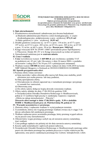 ŚWIĘTOKRZYSKI OŚRODEK DORADZTWA ROLNICZEGO W MODLISZEWICACH Ogłasza przetarg pisemny nieograniczony na sprzedaŜ prawa własności do budynków oraz prawa uŜytkowania wieczystego do gruntów połoŜonych w Pińczowie woj. świętokrzyskie przy ulicy Batalionów Chłopskich 5A I. Opis nieruchomości: 1. Przedmiotowa nieruchomość zabudowana jest dwoma budynkami: a) Budynek administracyjno-biurowy cztero kondygnacyjny, w części dwukondygnacyjny, podpiwniczony o pow. uŜytkowej 871,31 m2 b) Boks garaŜowy o pow. uŜytkowej 16,93 m2 2. Działki gruntowe oznaczone są : nr 67/1 o pow. 134 m kw, nr 67/7 o pow. 197 m kw, nr 67/12 o pow. 203 m kw, nr 67/14 o pow. 305 m kw, nr 67/10 o pow. 51 m kw, nr 66/3 o pow. 50 m kw. Razem pow. 940,0 m2 3. Księgi wieczyste KW Nr 29189 i 10667 prowadzone przez Sąd Rejonowy w Pińczowie. Działy III i IV w/w Ksiąg wieczystych są wolne od wpisów. 4. Nieruchomość połoŜona jest w centrum miasta. II. Cena i wadium. 1. Cena wywoławcza wynosi: 1 469 800 zł. jest zwolniona z podatku VAT na podstawie art. 43 ust.1 pkt 10a ustawy z dnia 24 marca 2004 r o podatku od towarów i usług (Dz.U.Nr 54 poz.535 z późniejszymi zmianami) 2. Wadium wynosi 100 000 zł, które naleŜy wpłacić do dnia 14.06.2010 na konto NBP Oddział Okręgowy w Kielcach nr 20101012380858181341000000. III. Sposób przygotowania ofert. 1.Pisemna oferta winna zawierać: a) Imię nazwisko i adres oferenta albo nazwę lub firmę oraz siedzibę, jeŜeli oferentem jest osoba prawna lub inny podmiot, b) Datę sporządzenia oferty, c) Oświadczenie Ŝe oferent zapoznał się z warunkami przetargu i przyjmuje te warunki bez zastrzeŜeń, d) Oferowaną cenę e) Do oferty naleŜy dołączyć kopię dowodu wniesienia wadium. 2. Oferty naleŜy składać do dnia 17.06.2010 do godziny 9.00 w Świętokrzyskim Ośrodku Doradztwa Rolniczego w Modliszewicach, pokój nr 13 osobiście bądź pocztą w zamkniętej kopercie z napisem „Oferta na zakup nieruchomości – Pińczów”. Otwarcie ofert nastąpi w dniu 17.06.2010 o godz. 9.30 w siedzibie ŚODR w Modliszewicach przy ul. Piotrkowskiej 30, pokój nr 13. IV. Warunki uczestnictwa w przetargu. 1. ZłoŜenie oferty i wpłacenie wadium w wyŜej podanym terminie. 2. Uczestnikom, którzy nie wygrają przetargu wadium zwraca się w ciągu 3-ch dni po odwołaniu lub zamknięciu przetargu. 3. Wadium wpłacone przez uczestnika przetargu, który przetarg wygrał zalicza się na poczet ceny nieruchomości. 4. Oferent który wygra przetarg a uchyli się od zawarcia umowy notarialnej, traci wadium. 7. Cena podlega zapłacie nie później niŜ do dnia zawarcia umowy notarialnej . 8. Koszty opłat notarialnych i sądowych ponosi nabywca. 9. Świętokrzyski Ośrodek Doradztwa Rolniczego w Modliszewicach zastrzega sobie prawo do odwołania przetargu bez podania przyczyn w trybie właściwym dla ogłoszenia, oraz prawo zamknięcia przetargu bez wyboru którejkolwiek z ofert. V. Dodatkowe informacje o przetargu pod tel. 0 41 372 22 84 lub na stronie internetowej www.sodr.pl Więcej informacji: Nieruchomość połoŜona jest na obszarze, na którym Miasto i Gmina Pińczów posiada aktualny plan miejscowy zagospodarowania przestrzennego, w/g którego działki połoŜone są na obszarze zabudowy mieszkalnej, usługowej, biurowej i handlowej. PołoŜenie nieruchomości z dogodnym dojazdem i moŜliwością parkowania samochodów. Opis stanu techniczno-uŜytkowego budynków Budynek wybudowany wg technologii tradycyjnej. Jest obiektem czterokondygnacyjnym (trzypiętrowym). całkowicie podpiwniczonym. Fundamenty Ŝelbetowe, wylewane. Ściany piwnic z cegły pełnej palonej. Ściany nadziemia z cegły pełnej palonej i kratówki. Ściany wypełniające pod oknami z bloczków gazobetonowych. Stropy prefabrykowane typu DZ-3 i DZ-5. Stropodach wentylowany, kryty papą na lepiku. Obróbki dachu z blachy ocynkowanej. Ścianki działowe z cegły dziurawki. Schody wewnętrzne Ŝelbetowe wylewane. Tynki wewnętrzne i zewnętrzne cementowo wapienne. Tynki zewnętrzne nakrapiane teraboną. Stolarka okienna i drzwiowa typowa, okna zespolone, drzwi płytowe. Podłogi i posadzki zróŜnicowane; lastriko wylewane, klepka bukowa, płytki PCV. W łazienkach i w sanitariatach posadki z płytek terakota, ściany wyłoŜone płytkami glazura do wysokości 2.0 m. Budynek wyposaŜony w następujące instalacje: - wodociągowo-kanalizacyjną (istniejące sieci miejskie), - wentylacji mechanicznej i grawitacyjnej - elektryczną siły i światła - radiofoniczną i telefoniczną - centralnego ogrzewania Dane techniczno-uŜytkowe budynku: - powierzchnia zabudowy - 350.24 m2 - powierzchnia uŜytkowa - 939.68 m2 - wykupione mieszkanie o pow. 68.37 m2 - powierzchnia uŜytkowa - 871.31 m2 - kubatura - 3.798.00 m3 - rok budowy - 1969 r Opis techniczno-uŜytkowy garaŜu: GaraŜ konstrukcji murowanej z jednospadowym dachem. GaraŜ nie posiada kanału naprawczego. Brama wjazdowa drewniana obita blachą ocynkowaną, posadzki betonowe. Brak instalacji. Dojazd od garaŜu z ul. Bednarskiej. Dane techniczno-uŜytkowe: - powierzchnia uŜytkowa: 16.93 m2 - rok budowy: 1969 r Stan techniczny zgodny z latami eksploatacji.