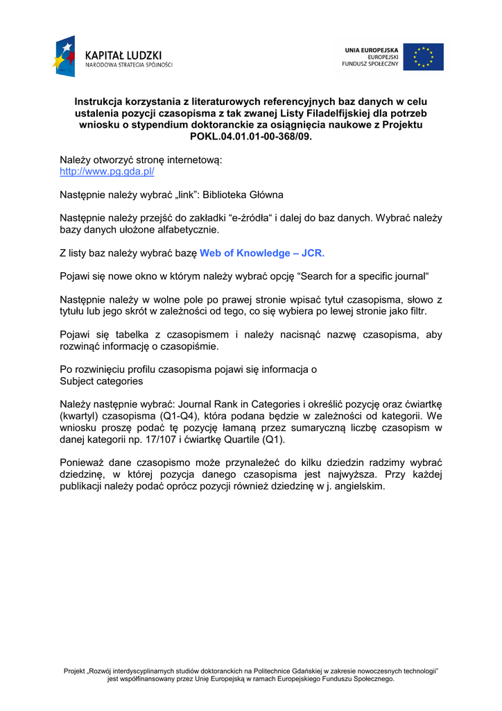 Instrukcja korzystania z literaturowych referencyjnych baz danych w celu ustalenia pozycji czasopisma z tak zwanej Listy Filadelfijskiej dla potrzeb wniosku o stypendium doktoranckie za osiągnięcia naukowe z Projektu POKL.04.01.01-00-368/09. Należy otworzyć stronę internetową: http://www.pg.gda.pl/ Następnie należy wybrać „link”: Biblioteka Główna Następnie należy przejść do zakładki “e-źródła“ i dalej do baz danych. Wybrać należy bazy danych ułożone alfabetycznie. Z listy baz należy wybrać bazę Web of Knowledge – JCR. Pojawi się nowe okno w którym należy wybrać opcję “Search for a specific journal“ Następnie należy w wolne pole po prawej stronie wpisać tytuł czasopisma, słowo z tytułu lub jego skrót w zależności od tego, co się wybiera po lewej stronie jako filtr. Pojawi się tabelka z czasopismem i należy nacisnąć nazwę czasopisma, aby rozwinąć informację o czasopiśmie. Po rozwinięciu profilu czasopisma pojawi się informacja o Subject categories Należy następnie wybrać: Journal Rank in Categories i określić pozycję oraz ćwiartkę (kwartyl) czasopisma (Q1-Q4), która podana będzie w zależności od kategorii. We wniosku proszę podać tę pozycję łamaną przez sumaryczną liczbę czasopism w danej kategorii np. 17/107 i ćwiartkę Quartile (Q1). Ponieważ dane czasopismo może przynależeć do kilku dziedzin radzimy wybrać dziedzinę, w której pozycja danego czasopisma jest najwyższa. Przy każdej publikacji należy podać oprócz pozycji również dziedzinę w j. angielskim. Projekt „Rozwój interdyscyplinarnych studiów doktoranckich na Politechnice Gdańskiej w zakresie nowoczesnych technologii” jest współfinansowany przez Unię Europejską w ramach Europejskiego Funduszu Społecznego.