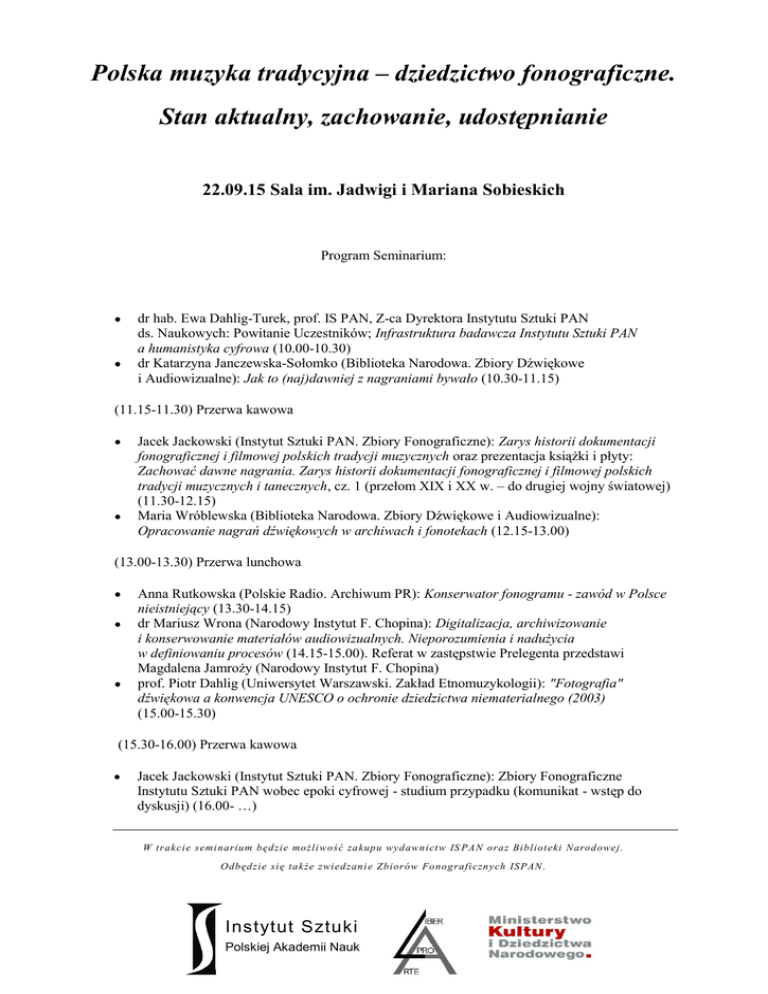 Polska muzyka tradycyjna – dziedzictwo fonograficzne. Stan aktualny, zachowanie, udostępnianie 22.09.15 Sala im. Jadwigi i Mariana Sobieskich Program Seminarium: dr hab. Ewa Dahlig-Turek, prof. IS PAN, Z-ca Dyrektora Instytutu Sztuki PAN ds. Naukowych: Powitanie Uczestników; Infrastruktura badawcza Instytutu Sztuki PAN a humanistyka cyfrowa (10.00-10.30) dr Katarzyna Janczewska-Sołomko (Biblioteka Narodowa. Zbiory Dźwiękowe i Audiowizualne): Jak to (naj)dawniej z nagraniami bywało (10.30-11.15) (11.15-11.30) Przerwa kawowa Jacek Jackowski (Instytut Sztuki PAN. Zbiory Fonograficzne): Zarys historii dokumentacji fonograficznej i filmowej polskich tradycji muzycznych oraz prezentacja książki i płyty: Zachować dawne nagrania. Zarys historii dokumentacji fonograficznej i filmowej polskich tradycji muzycznych i tanecznych, cz. 1 (przełom XIX i XX w. – do drugiej wojny światowej) (11.30-12.15) Maria Wróblewska (Biblioteka Narodowa. Zbiory Dźwiękowe i Audiowizualne): Opracowanie nagrań dźwiękowych w archiwach i fonotekach (12.15-13.00) (13.00-13.30) Przerwa lunchowa Anna Rutkowska (Polskie Radio. Archiwum PR): Konserwator fonogramu - zawód w Polsce nieistniejący (13.30-14.15) dr Mariusz Wrona (Narodowy Instytut F. Chopina): Digitalizacja, archiwizowanie i konserwowanie materiałów audiowizualnych. Nieporozumienia i nadużycia w definiowaniu procesów (14.15-15.00). Referat w zastępstwie Prelegenta przedstawi Magdalena Jamroży (Narodowy Instytut F. Chopina) prof. Piotr Dahlig (Uniwersytet Warszawski. Zakład Etnomuzykologii): "Fotografia" dźwiękowa a konwencja UNESCO o ochronie dziedzictwa niematerialnego (2003) (15.00-15.30) (15.30-16.00) Przerwa kawowa Jacek Jackowski (Instytut Sztuki PAN. Zbiory Fonograficzne): Zbiory Fonograficzne Instytutu Sztuki PAN wobec epoki cyfrowej - studium przypadku (komunikat - wstęp do dyskusji) (16.00- …) tak W trakcie seminarium będzie możliwość zakupu wydawnictw IS PAN oraz Biblioteki Narodowej. Odbędzie się także zwiedzani e Zbiorów Fonograficznych ISPAN . Instytut Sztuki Polskiej Akademii Nauk