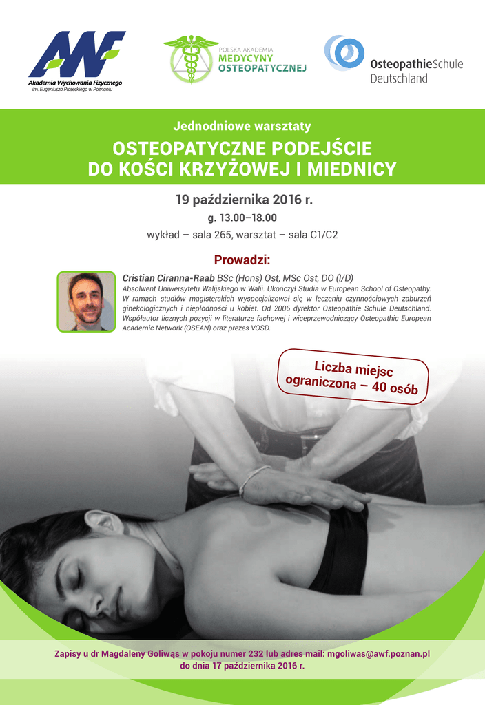 Akademia Wychowania Fizycznego im. Eugeniusza Piaseckiego w Poznaniu Jednodniowe warsztaty OSTEOPATYCZNE PODEJŚCIE DO KOŚCI KRZYŻOWEJ I MIEDNICY 19 października 2016 r. g. 13.00–18.00 wykład – sala 265, warsztat – sala C1/C2 Prowadzi: Cristian Ciranna-Raab BSc (Hons) Ost, MSc Ost, DO (I/D) Absolwent Uniwersytetu Walijskiego w Walii. Ukończył Studia w European School of Osteopathy. W ramach studiów magisterskich wyspecjalizował się w leczeniu czynnościowych zaburzeń ginekologicznych i niepłodności u kobiet. Od 2006 dyrektor Osteopathie Schule Deutschland. Współautor licznych pozycji w literaturze fachowej i wiceprzewodniczący Osteopathic European Academic Network (OSEAN) oraz prezes VOSD. Zaproszenie Liczba miejsc ograniczona – 40 osób Zapisy u dr Magdaleny Goliwąs w pokoju numer 232 lub adres mail: [email protected] do dnia 17 października 2016 r.