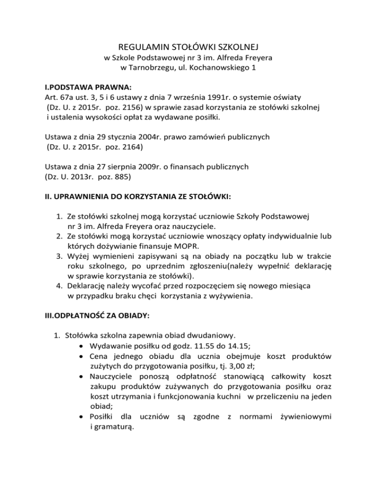 REGULAMIN STOŁÓWKI SZKOLNEJ w Szkole Podstawowej nr 3 im. Alfreda Freyera w Tarnobrzegu, ul. Kochanowskiego 1 I.PODSTAWA PRAWNA: Art. 67a ust. 3, 5 i 6 ustawy z dnia 7 września 1991r. o systemie oświaty (Dz. U. z 2015r. poz. 2156) w sprawie zasad korzystania ze stołówki szkolnej i ustalenia wysokości opłat za wydawane posiłki. Ustawa z dnia 29 stycznia 2004r. prawo zamówieo publicznych (Dz. U. z 2015r. poz. 2164) Ustawa z dnia 27 sierpnia 2009r. o finansach publicznych (Dz. U. 2013r. poz. 885) II. UPRAWNIENIA DO KORZYSTANIA ZE STOŁÓWKI: 1. Ze stołówki szkolnej mogą korzystad uczniowie Szkoły Podstawowej nr 3 im. Alfreda Freyera oraz nauczyciele. 2. Ze stołówki mogą korzystad uczniowie wnoszący opłaty indywidualnie lub których dożywianie finansuje MOPR. 3. Wyżej wymienieni zapisywani są na obiady na początku lub w trakcie roku szkolnego, po uprzednim zgłoszeniu(należy wypełnid deklarację w sprawie korzystania ze stołówki). 4. Deklarację należy wycofad przed rozpoczęciem się nowego miesiąca w przypadku braku chęci korzystania z wyżywienia. III.ODPŁATNOŚD ZA OBIADY: 1. Stołówka szkolna zapewnia obiad dwudaniowy. Wydawanie posiłku od godz. 11.55 do 14.15; Cena jednego obiadu dla ucznia obejmuje koszt produktów zużytych do przygotowania posiłku, tj. 3,00 zł; Nauczyciele ponoszą odpłatnośd stanowiącą całkowity koszt zakupu produktów zużywanych do przygotowania posiłku oraz koszt utrzymania i funkcjonowania kuchni w przeliczeniu na jeden obiad; Posiłki dla uczniów są zgodne z normami żywieniowymi i gramaturą. 2. Opłaty za obiady pobierane są od pierwszego dnia miesiąca do 5-go dnia miesiąca bieżącego(w uzasadnionych przypadkach do 10-go dnia po uprzednim uzgodnieniu z kierownikiem świetlicy). Opłata po wyznaczonym terminie skutkowad będzie naliczeniem ustawowych odsetek. 3. W sytuacjach wzrostu kosztu produktów w trakcie roku szkolnego dopuszcza się możliwośd zmiany wysokości odpłatności, po uprzednim poinformowaniu korzystających ze stołówki z miesięcznym wyprzedzeniem. 4. Wpłat za żywienie należy dokonad przelewem bankowym lub w kasie w MOZE. 5. Wpłat na konto bankowe można dokonywad do 5 –go każdego miesiąca lub gotówką w kasie w MOZE . 6. Numer konta, na który należy dokonad opłat za obiad: Szkoła Podstawowa nr 3 im. Alfreda Freyera ul. Kochanowskiego 1 39-400 Tarnobrzeg nr 53 1240 2744 1111 0000 3991 5610 7. Przykład tytułu przelewu(ważne zachowanie właściwej kolejności) – miesiąc, nazwisko i imię, klasa(np. IX, Kowalski Jan, kl. I A). 8. Opłaty za wyżywienie dotyczą tylko pełnych, całomiesięcznych abonamentów. Po dokonaniu opłaty należy dostarczyd niezwłocznie dowód opłaty za wyżywienie do kierownika świetlicy w celu wydania karty abonamentowej (pokój nr 16). 9. Dni nieobecności i zwroty za niewykorzystane, odwołane obiady rodzice odliczają po wcześniejszym skontaktowaniu telefonicznym lub osobiście z kierownikiem świetlicy. 10. Informacja o kwocie do zapłaty na dany miesiąc i godzinach wydawania kart abonamentowych wywieszana jest na drzwiach pokoju nr 16 każdego miesiąca. 11. Odwołanie obiadu należy zgłosid osobiście lub telefonicznie pod nr tel. 15 823 35 11 do godz. 8.30. 12. Obiady dla uczniów szkoły podstawowej wydawane są na podstawie kart abonamentowych, które otrzymują każdorazowo w pokoju nr 16). IV. ZWROTY ZA OBIADY: 1. Zwrot poniesionych kosztów może nastąpid z powodu choroby, wycieczki, lub innych przyczyn losowych, jeżeli nieobecnośd ucznia wynosi jeden dzieo lub dłużej. Należy daną nieobecnośd odnotowad w sekretariacie szkoły lub u kierownika świetlicy. 2. Nieobecnośd musi byd zgłoszona osobiście lub telefonicznie najpóźniej do godz. 8.30 danego dnia. Tylko na tej podstawie powstała nadpłata może byd zaliczona na poczet opłaty na następny miesiąc. 3. Przed dokonaniem przelewu należy skontaktowad się z kierownikiem świetlicy lub sekretariatem szkolnym i uzgodnid kwotę odliczeo(musi byd zgodna z wcześniejszym zgłoszeniem). 4. Odliczenie kwoty odpisu następuje z odpłatności w następnym miesiącu. 5. W przypadku odstąpienia dziecka od chęci korzystania ze szkolnej stołówki ale mającego odpisy z poprzedniego miesiąca, następuje zwrot nadpłaconej kwoty na podane konto. 6. Nie można wpłacad dowolnej kwoty za obiady tj. pomniejszad kwotę samodzielnie. Pomniejszyd kwotę można tylko w formie odpisu po wcześniejszym zgłoszeniu(z dołu). V. WYDAWANIE POSIŁKÓW: 1. Posiłki wydawane są w godz. 11.55 – 14.15 (wyjątek stanowią dzieci z klas pierwszych przyprowadzane do stołówki przez opiekuna przed przerwą śródlekcyjną). 2. Przy stołówce wywieszany jest jadłospis na dany tydzieo zatwierdzony przez p. intendentkę. 3. Posiłki przygotowywane są zgodnie z zasadami racjonalnego żywienia i kalkulacją kosztów. VI. ZASADY ZACHOWANIA W STOŁÓWCE: 1. Należy stosowad się do poleceo nauczycieli dyżurujących oraz personelu stołówki. 2. Po stołówce należy poruszad się spokojnie(nie wolno biegad, przepychad się w kolejce, przenosid się do innych stolików). 3. Należy zachowad porządek przy odbiorze dania oraz przy oddawaniu naczyo(nie wolno podchodzid po danie lub oddawad naczynia bez kolejki, w razie konieczności należy podnieśd rękę, tym samym sygnalizując problem). 4. Należy zachowad porządek podczas spożywania posiłku(nie rozmawiad głośno, nie używad wulgaryzmów, obrzydzających jedzenie słów, gestów i odgłosów). 5. Należy zostawid po sobie porządek(odnieśd talerz, zostawid czyste miejsce na stoliku i pod nim, przysunąd krzesło do stolika). 6. Po skooczonym posiłku należy bezzwłocznie opuścid stołówkę. 7. Należy szanowad naczynia, sztudce i nakrycie stołu(blaty). 8. Obowiązkiem jest naprawid szkodę uczynioną w stołówce(za szkody spowodowane w stołówce odpowiada uczeo, a finansowo jego rodzice). 9. Podczas wydawania obiadów zabrania się 