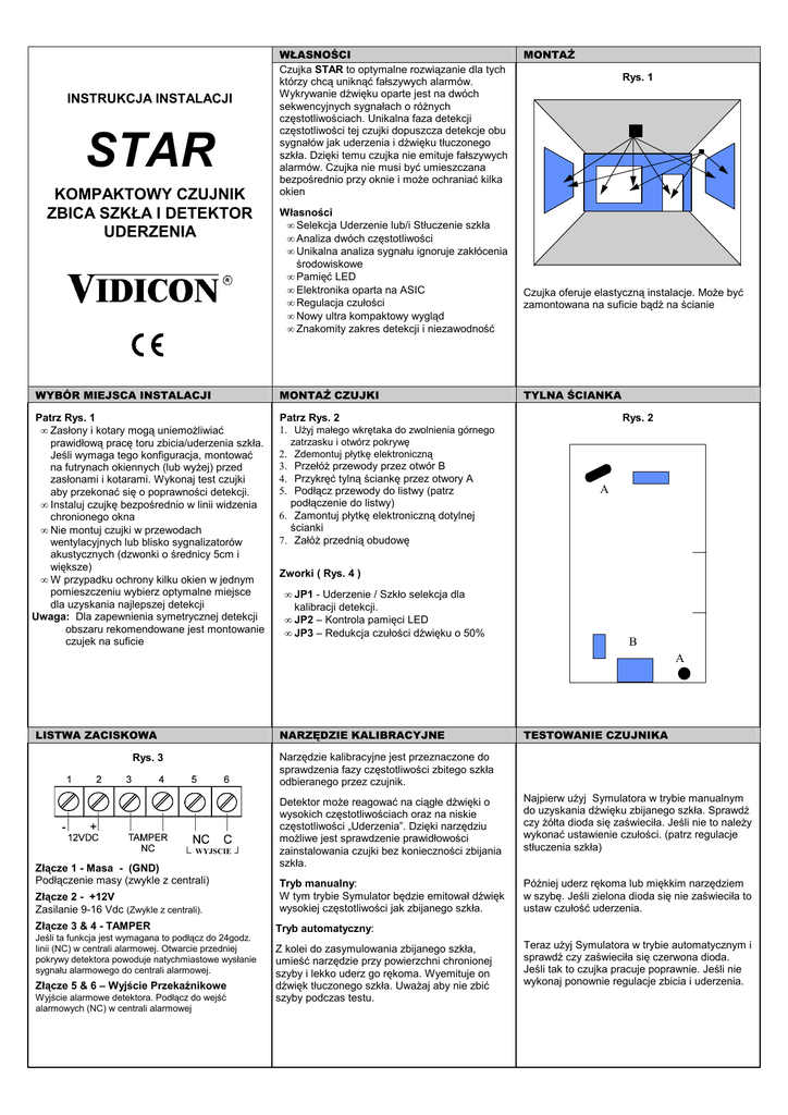 INSTRUKCJA INSTALACJI STAR KOMPAKTOWY CZUJNIK ZBICA SZKŁA I DETEKTOR UDERZENIA WYBÓR MIEJSCA INSTALACJI Patrz Rys. 1 • Zasłony i kotary mogą uniemoŜliwiać prawidłową pracę toru zbicia/uderzenia szkła. Jeśli wymaga tego konfiguracja, montować na futrynach okiennych (lub wyŜej) przed zasłonami i kotarami. Wykonaj test czujki aby przekonać się o poprawności detekcji. • Instaluj czujkę bezpośrednio w linii widzenia chronionego okna • Nie montuj czujki w przewodach wentylacyjnych lub blisko sygnalizatorów akustycznych (dzwonki o średnicy 5cm i większe) • W przypadku ochrony kilku okien w jednym pomieszczeniu wybierz optymalne miejsce dla uzyskania najlepszej detekcji Uwaga: Dla zapewnienia symetrycznej detekcji obszaru rekomendowane jest montowanie czujek na suficie WŁASNOŚCI Czujka STAR to optymalne rozwiązanie dla tych którzy chcą uniknąć fałszywych alarmów. Wykrywanie dźwięku oparte jest na dwóch sekwencyjnych sygnałach o róŜnych częstotliwościach. Unikalna faza detekcji częstotliwości tej czujki dopuszcza detekcje obu sygnałów jak uderzenia i dźwięku tłuczonego szkła. Dzięki temu czujka nie emituje fałszywych alarmów. Czujka nie musi być umieszczana bezpośrednio przy oknie i moŜe ochraniać kilka okien Własności • Selekcja Uderzenie lub/i Stłuczenie szkła • Analiza dwóch częstotliwości • Unikalna analiza sygnału ignoruje zakłócenia środowiskowe • Pamięć LED • Elektronika oparta na ASIC • Regulacja czułości • Nowy ultra kompaktowy wygląd • Znakomity zakres detekcji i niezawodność MONTAś CZUJKI MONTAś Rys. 1 Czujka oferuje elastyczną instalacje. MoŜe być zamontowana na suficie bądź na ścianie TYLNA ŚCIANKA Patrz Rys. 2 1. UŜyj małego wkrętaka do zwolnienia górnego 2. 3. 4. 5. Rys. 2 zatrzasku i otwórz pokrywę Zdemontuj płytkę elektroniczną PrzełóŜ przewody przez otwór B Przykręć tylną ściankę przez otwory A Podłącz przewody do listwy (patrz podłączenie do listwy) 6. Zamontuj płytkę elektroniczną dotylnej ścianki 7. ZałóŜ przednią obudowę A Zworki ( Rys. 4 ) • JP1 - Uderzenie / Szkło selekcja dla kalibracji detekcji. • JP2 – Kontrola pamięci LED • JP3 – Redukcja czułości dźwięku o 50% B A LISTWA ZACISKOWA NARZĘDZIE KALIBRACYJNE TESTOWANIE CZUJNIKA Narzędzie kalibracyjne jest przeznaczone do sprawdzenia fazy częstotliwości zbitego szkła odbieranego przez czujnik. Rys. 3 WYJSCIE Złącze 1 - Masa - (GND) Podłączenie masy (zwykle z centrali) Złącze 2 - +12V Zasilanie 9-16 Vdc (Zwykle z centrali). Złącze 3 & 4 - TAMPER Jeśli ta funkcja jest wymagana to podłącz do 24godz. linii (NC) w centrali alarmowej. Otwarcie przedniej pokrywy detektora powoduje natychmiastowe wysłanie sygnału alarmowego do centrali alarmowej. Złącze 5 & 6 – Wyjście Przekaźnikowe Wyjście alarmowe detektora. Podłącz do wejść alarmowych (NC) w centrali alarmowej Detektor moŜe reagować na ciągłe dźwięki o wysokich częstotliwościach oraz na niskie częstotliwości „Uderzenia”. Dzięki narzędziu moŜliwe jest sprawdzenie prawidłowości zainstalowania czujki bez konieczności zbijania szkła. Najpierw uŜyj Symulatora w trybie manualnym do uzyskania dźwięku zbijanego szkła. Sprawdź czy Ŝółta dioda się zaświeciła. Jeśli nie to naleŜy wykonać ustawienie czułości. (patrz regulacje stłuczenia szkła) Tryb manualny: W tym trybie Symulator będzie emitował dźwięk wysokiej częstotliwości jak zbijanego szkła. Później uderz rękoma lub miękkim narzędziem w szybę. Jeśli zielona dioda się nie zaświeciła to ustaw czułość uderzenia. Tryb automatyczny: Z kolei do zasymulowania zbijanego szkła, umieść narzędzie przy powierzchni chronionej szyby i lekko uderz go rękoma. Wyemituje on dźwięk tłuczonego szkła. UwaŜaj aby nie zbić szyby podczas testu. Teraz uŜyj Symulatora w trybie automatycznym i sprawdź czy zaświeciła się czerwona dioda. Jeśli tak to czujka pracuje poprawnie. Jeśli nie wykonaj ponownie regulacje zbicia i uderzenia. REGULACJA STŁUCZENIA SZKŁA REGULACJA UDERZENIA Do regulacji stłuczenia szkła (ustawienia czułości) umieść zworkę JP1 zgodnie z oznaczeniem GLASS (patrz rys 4, podłączenie środkowego i górnego pina) Zielona dioda powinna się świecić. MoŜna teraz wykonać regulację poprzez obracanie potencjometrem oznaczonym jako GLASS Operuj Symulatorem i ustawiaj potencjometr w stronę zgodną do obrotu wskazówek zegara do zwiększenia czułości i odwrotnie do jej zmniejszenia aŜ do zaświecenia się śółtej diody. Pamiętaj Ŝe regulacja nie przyniesie efektu bez podłączenia zworki do górnego i środkowego pina Aby ustawić poziom uderzenia umieść zworkę JP1 zgodnie z oznaczeniem SHOCK . (połączenie środkowego pina z dolnym)-patrz rys 4. śółta dioda powinna się świecić. MoŜesz ustawić teraz wymaganą czułość poprzez obracanie potencjometru oznaczonego SHOCK. Uderz delikatnie w szybę i ustaw potencjometr w stronę zgodną z obrotem wskazówek zegara do zwiększenia czułości lub odwrotnie do jej zmniejszenia aŜ do zaświecenia się Zielonej diody. Pamiętaj Ŝe regulacja nie przyniesie efektu bez podłączenia zworki do dolnego i środkowego pina Uwaga Jeśli zworka jest ustawiona na GLASS to tylko odbiera wysokie częstotliwości (tłuczenie szkła) TESTY KOŃCOWE • Uwaga Jeśli zworka jest ustawiona na SHOCK to tylko odbiera niskie częstotliwości poprzedzające zbijanie szkła (uderzenie) UKŁAD PŁYTKI Funkcja pamięci alarmu umoŜliwia identyfikacje alarmów z wielu czujek połączonych do tej samej linii w centrali alarmowej. Aby ją załączyć umieść zworkę JP2 (MEM) w oba piny - patrz rys 4 W przypadku alarmu, Czerwona dioda będzie się świecić, aŜ do zresetowania pamięci. Aby zresetować pamięć, wyłącz (rozłącz) zasilanie (+12V) z listwy połączeniowej na min. 15s, a potem włącz zasilanie (moŜe zostać do tego uŜyty klucz 