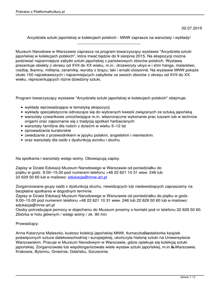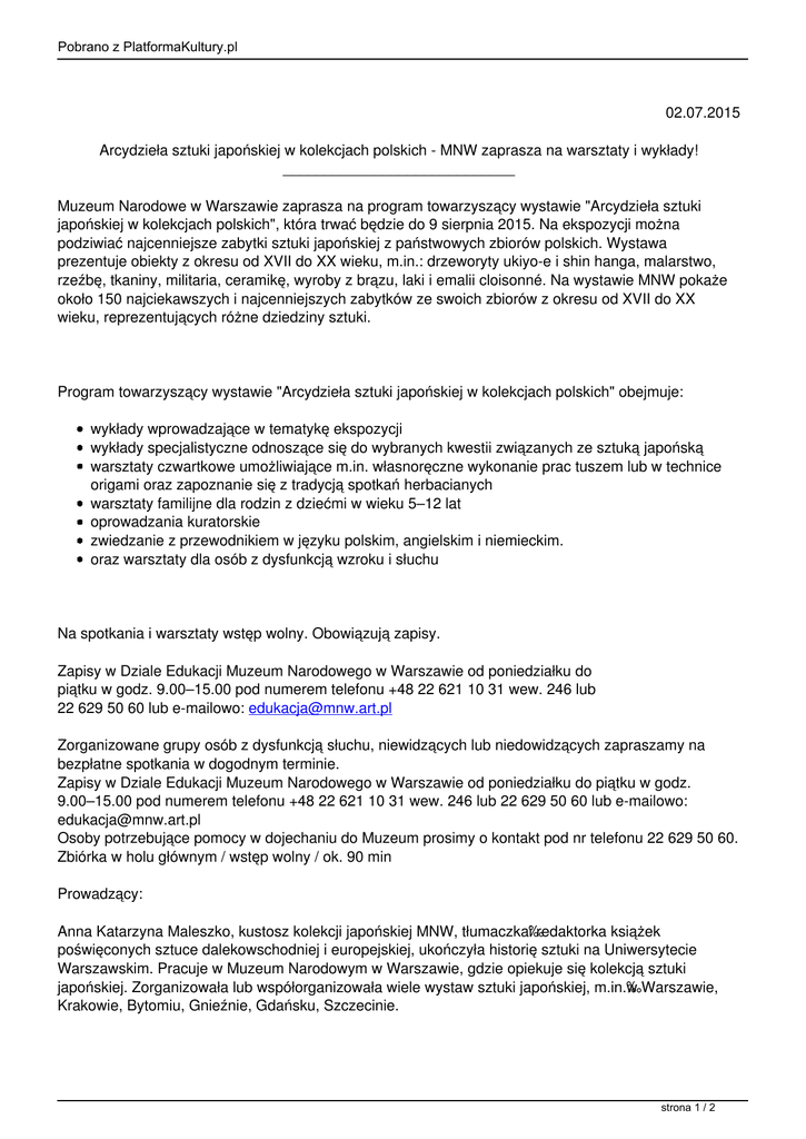 Pobrano z PlatformaKultury.pl 02.07.2015 Arcydzieła sztuki japońskiej w kolekcjach polskich - MNW zaprasza na warsztaty i wykłady! ____________________________ Muzeum Narodowe w Warszawie zaprasza na program towarzyszący wystawie "Arcydzieła sztuki japońskiej w kolekcjach polskich", która trwać będzie do 9 sierpnia 2015. Na ekspozycji można podziwiać najcenniejsze zabytki sztuki japońskiej z państwowych zbiorów polskich. Wystawa prezentuje obiekty z okresu od XVII do XX wieku, m.in.: drzeworyty ukiyo-e i shin hanga, malarstwo, rzeźbę, tkaniny, militaria, ceramikę, wyroby z brązu, laki i emalii cloisonné. Na wystawie MNW pokaże około 150 najciekawszych i najcenniejszych zabytków ze swoich zbiorów z okresu od XVII do XX wieku, reprezentujących różne dziedziny sztuki. Program towarzyszący wystawie "Arcydzieła sztuki japońskiej w kolekcjach polskich" obejmuje: wykłady wprowadzające w tematykę ekspozycji wykłady specjalistyczne odnoszące się do wybranych kwestii związanych ze sztuką japońską warsztaty czwartkowe umożliwiające m.in. własnoręczne wykonanie prac tuszem lub w technice origami oraz zapoznanie się z tradycją spotkań herbacianych warsztaty familijne dla rodzin z dziećmi w wieku 5–12 lat oprowadzania kuratorskie zwiedzanie z przewodnikiem w języku polskim, angielskim i niemieckim. oraz warsztaty dla osób z dysfunkcją wzroku i słuchu Na spotkania i warsztaty wstęp wolny. Obowiązują zapisy. Zapisy w Dziale Edukacji Muzeum Narodowego w Warszawie od poniedziałku do piątku w godz. 9.00–15.00 pod numerem telefonu +48 22 621 10 31 wew. 246 lub 22 629 50 60 lub e-mailowo: [email protected] Zorganizowane grupy osób z dysfunkcją słuchu, niewidzących lub niedowidzących zapraszamy na bezpłatne spotkania w dogodnym terminie. Zapisy w Dziale Edukacji Muzeum Narodowego w Warszawie od poniedziałku do piątku w godz. 9.00–15.00 pod numerem telefonu +48 22 621 10 31 wew. 246 lub 22 629 50 60 lub e-mailowo: [email protected] Osoby potrzebujące pomocy w dojechaniu do Muzeum prosimy o kontakt pod nr telefonu 22 629 50 60. Zbiórka w holu głównym / wstęp wolny / ok. 90 min Prowadzący: Anna Katarzyna Maleszko, kustosz kolekcji japońskiej MNW, tłumaczka i redaktorka książek poświęconych sztuce dalekowschodniej i europejskiej, ukończyła historię sztuki na Uniwersytecie Warszawskim. Pracuje w Muzeum Narodowym w Warszawie, gdzie opiekuje się kolekcją sztuki japońskiej. Zorganizowała lub współorganizowała wiele wystaw sztuki japońskiej, m.in. w Warszawie, Krakowie, Bytomiu, Gnieźnie, Gdańsku, Szczecinie. strona 1 / 2 Pobrano z PlatformaKultury.pl prof. dr hab. Agnieszka Kozyra, profesor Uniwersytetu Warszawskiego w Zakładzie Japonistyki i Koreanistyki, profesor Uniwersytetu Jagiellońskiego w Zakładzie Japonistyki i Sinologii. Specjalizuje się w dziedzinie religii i filozofii Japonii. Opublikowała między innymi: Samurajskie chrześcijaństwo (1995), Filozofia zen (2004), Filozofia Nicości Nishidy Kitarō (2007), Estetyka zen (2010), Mitologia japońska (2011). Małgorzata Martini, wieloletni kustosz zbiorów sztuki Dalekiego Wschodu w Muzeum Narodowym w Krakowie (w tym kolekcji Feliksa „Mangghi” Jasieńskiego), obecnie pracuje w Muzeum Sztuki i Techniki Japońskiej Manggha. Autorka wielu wystaw i publikacji na temat sztuki japońskiej. dr hab. Iwona Kordzińska-Nawrocka, absolwentka japonistyki Uniwersytetu Warszawskiego oraz Uniwersytetu Shinshū (Japonia), obecnie zatrudniona w Zakładzie Japonistyki i Koreanistyki UW. Specjalizuje się w klasycznej literaturze oraz kulturze japońskiej. Opublikowała między innymi: Japońską miłość dworską (2005), Japońską kulturę kulinarną (2008) Ulotny świat ukiyo. Obraz kultury mieszczańskiej w twórczości Ihary Saikaku (2010), Klasyczny język japoński (2013). Lech Żurkowski (Ame no Otto), maluje techniką sumi-e malarstwa tuszowego. Miał swoje indywidualne wystawy w Muzeum Sztuki i Techniki Japońskiej Manggha, Muzeum Azji i Pacyfiku w Warszawie, Muzeum Okręgowym w Toruniu, Muzeum Literatury w Warszawie. W 2014 r. w Muzeum Azji i Pacyfiku współorganizował wystawę „Echo Orientu” oraz „Mniej znaczy więcej" podczas Dni Kultury Japońskiej w Bibliotece Uniwersytetu Warszawskiego. Szczegółowe informacje dotyczące programu MNW znajdują się na stronie Muzeum. Koordynator programu edukacyjnego: Sylwia Betcher / Dział Edukacji MNW. strona 2 / 2