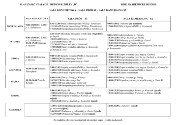 PLAN ZAJĘĆ STAŁYCH BUDYNEK ŻÓŁTY „B” ROK AKADEMICKI 2015/2016 SALA KONCERTOWA – SALA PRÓB S1 – SALA KAMERALNA S2 SALA KONCERTOWA SALA PRÓB S1 SALA KAMERALNA S2 9.00-13.00 BIG BAND p. L. Kułakowski 8.45-12.00 Praca z choreografem (WIII) p. Semeńczuk 12.15-16.55 Taniec musicalowy (WIII) p. Różankiewicz 17.30-20.30 Interpretacja musicalu (WIII) p. Szydłowska 9.00-13.00 BIG BAND p. L. Kułakowski 13.30-17.30 Orkiestra p. Rychert 8.45-10.15 Metodyka nauczania rytmiki (co 2 tygodnie) p. Kupsik 10.30-12.00 Chór p. Fiebig, p. Kozorys 12.15-20.00 Wydz. III: 12.15-16.15 Praca nad rolą p. Morawski 17.00-20.00 Sceny wokalno-aktorskie p. Morawski, p. Janiak, p. Troć 8.00-10.30 Audycje szkolne p. Tamulis 10.30-12.00 Chór p. Kozorys, p. Fiebig 12.00-13.30 Podstawy gry aktorskiej p. Goetel 13.45-15.15 Dykcja i recytacja p. Goetel 18.00-21.00 Międzywydziałowe Koło Naukowe Tutti e Solo p. Batarowska 9.30-13.30 Orkiestra p. Rychert 9.00-13.45 Zespoły wokalne (WIII) p. Stanisławski 14.00-18.30 Gra aktorska p. Kolak 19.00-21.00 Taniec współczesny p. Gidel 10.00-11.45 Zespół wokalny (Jazz mgr) p. Kuchtyk, 12.00-13.30 Zespół wokalny (Jazz lic.) p. Kuchtyk, p. Kosmalski 13.45-15.15 Interpretacja piosenki p. Goetel 15.30-17.00 Interpretacja piosenki p. Goetel, p. Janiak 9.00-13.45 Zespoły wokalne (WIII) p. Stanisławski 14.00-17.00 Piosenka aktorska p. Kolak, p. Kosmalski 18.00-21.10 Taniec współczesny p. Gidel 11.30-13.00 Zespół wokalny (Jazz mgr) p. Kuchtyk, p. Kosmalski 13.30-15.30 Literatura wokalna (WIII) p. Rappé 15.30-21.00 Katedra wokalistyki 9.00-10.30 Chór p. Fiebig, p. Kozorys 10.35-12.50 Gra aktorska p. Boć 13.00-17.45 Gra aktorska p. Jankowski 18.00-21.00 Interpretacja musicalu p. Nanowski 9.00-10.30 Chór p. Kozorys, p. Fiebig 14.00-15.30 Propedeutyka muzyki współczesnej p. Nowicki 12.50-13.35 Improwizacja p. Knitter, p. Wojtczak (zjazd) 13.35-14.20 Improwizacja p. Wojtczak, p. Knitter (zjazd) SOBOTA 9.00-15.00 Wydz. III 15.00-16.30 Emisja głosu p. Kuchtyk (zjazd) 17.00-19.15 Zespoły wokalne p. Kuchtyk, p. Kosmalski (zjazd) 19.30-21.00 Chór p. Kuchtyk, p. Kosmalski (zjazd) 10.00-21.00 p. Nahorny (zjazd) NIEDZIELA 13.00-14.30 Interpretacja piosenki p. Goetel, p. Paciorek (zjazd) 14.45-16.15 Podstawy gry aktorskiej p. Goetel (zjazd) 16.30-18.00 Dykcja i recytacja p. Goetel (zjazd) PONIEDZIAŁEK WTOREK ŚRODA CZWARTEK PIĄTEK 14.00-21.00 Katedra Fortepianu 10.30-16.00 Zespoły Rytmiki 9.00-16.00 p. Nahorny (po zjazdach) 17.00-20.10 Wiersz i proza (WIII) p. Szymaniak Ze względów edycyjnych zestawienie nie zawiera stopni i tytułów naukowych