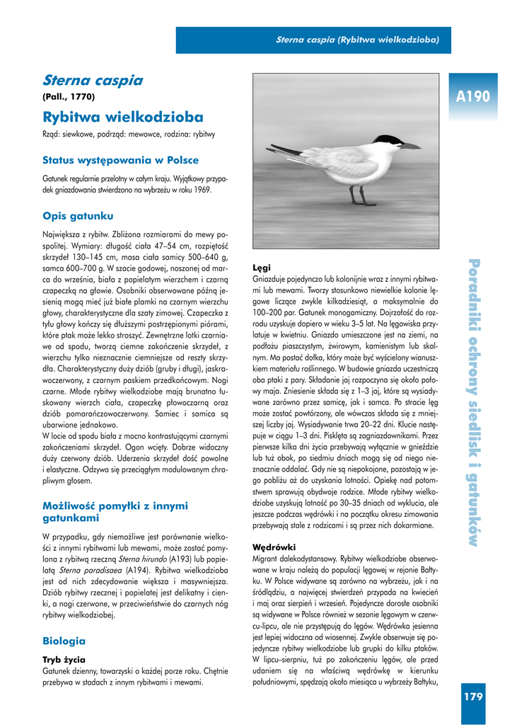 Sterna caspia (Rybitwa wielkodzioba) Sterna caspia A190 (Pall., 1770) Rybitwa wielkodzioba Rzàd: siewkowe, podrzàd: mewowce, rodzina: rybitwy Status wyst´powania w Polsce Gatunek regularnie przelotny w ca∏ym kraju. Wyjàtkowy przypadek gniazdowania stwierdzono na wybrze˝u w roku 1969. Opis gatunku Mo˝liwoÊç pomy∏ki z innymi gatunkami W przypadku, gdy niemo˝liwe jest porównanie wielkoÊci z innymi rybitwami lub mewami, mo˝e zostaç pomylona z rybitwà rzecznà Sterna hirundo (A193) lub popielatà Sterna paradisaea (A194). Rybitwa wielkodzioba jest od nich zdecydowanie wi´ksza i masywniejsza. Dziób rybitwy rzecznej i popielatej jest delikatny i cienki, a nogi czerwone, w przeciwieƒstwie do czarnych nóg rybitwy wielkodziobej. Biologia Tryb ˝ycia Gatunek dzienny, towarzyski o ka˝dej porze roku. Ch´tnie przebywa w stadach z innym rybitwami i mewami. L´gi Gniazduje pojedynczo lub kolonijnie wraz z innymi rybitwami lub mewami. Tworzy stosunkowo niewielkie kolonie l´gowe liczàce zwykle kilkadziesiàt, a maksymalnie do 100–200 par. Gatunek monogamiczny. Dojrza∏oÊç do rozrodu uzyskuje dopiero w wieku 3–5 lat. Na l´gowiska przylatuje w kwietniu. Gniazdo umieszczone jest na ziemi, na pod∏o˝u piaszczystym, ˝wirowym, kamienistym lub skalnym. Ma postaç do∏ka, który mo˝e byç wyÊcielony wianuszkiem materia∏u roÊlinnego. W budowie gniazda uczestniczà oba ptaki z pary. Sk∏adanie jaj rozpoczyna si´ oko∏o po∏owy maja. Zniesienie sk∏ada si´ z 1–3 jaj, które sà wysiadywane zarówno przez samic´, jak i samca. Po stracie l´g mo˝e zostaç powtórzony, ale wówczas sk∏ada si´ z mniejszej liczby jaj. Wysiadywanie trwa 20–22 dni. Klucie nast´puje w ciàgu 1–3 dni. Piskl´ta sà zagniazdownikami. Przez pierwsze kilka dni ˝ycia przebywajà wy∏àcznie w gnieêdzie lub tu˝ obok, po siedmiu dniach mogà si´ od niego nieznacznie oddalaç. Gdy nie sà niepokojone, pozostajà w jego pobli˝u a˝ do uzyskania lotnoÊci. Opiek´ nad potomstwem sprawujà obydwoje rodzice. M∏ode rybitwy wielkodziobe uzyskujà lotnoÊç po 30–35 dniach od wyklucia, ale jeszcze podczas w´drówki i na poczàtku okresu zimowania przebywajà stale z rodzicami i sà przez nich dokarmiane. W´drówki Migrant dalekodystansowy. Rybitwy wielkodziobe obserwowane w kraju nale˝à do populacji l´gowej w rejonie Ba∏tyku. W Polsce widywane sà zarówno na wybrze˝u, jak i na Êródlàdziu, a najwi´cej stwierdzeƒ przypada na kwiecieƒ i maj oraz sierpieƒ i wrzesieƒ. Pojedyncze doros∏e osobniki sà widywane w Polsce równie˝ w sezonie l´gowym w czerwcu-lipcu, ale nie przyst´pujà do l´gów. W´drówka jesienna jest lepiej widoczna od wiosennej. Zwykle obserwuje si´ pojedyncze rybitwy wielkodziobe lub grupki do kilku ptaków. W lipcu–sierpniu, tu˝ po zakoƒczeniu l´gów, ale przed udaniem si´ na w∏aÊciwà w´drówk´ w kierunku po∏udniowymi, sp´dzajà oko∏o miesiàca u wybrze˝y Ba∏tyku, Poradniki ochrony siedlisk i gatunków Najwi´ksza z rybitw. Zbli˝ona rozmiarami do mewy pospolitej. Wymiary: d∏ugoÊç cia∏a 47–54 cm, rozpi´toÊç skrzyde∏ 130–145 cm, masa cia∏a samicy 500–640 g, samca 600–700 g. W szacie godowej, noszonej od marca do wrzeÊnia, bia∏a z popielatym wierzchem i czarnà czapeczkà na g∏owie. Osobniki obserwowane póênà jesienià mogà mieç ju˝ bia∏e plamki na czarnym wierzchu g∏owy, charakterystyczne dla szaty zimowej. Czapeczka z ty∏u g∏owy koƒczy si´ d∏u˝szymi postrz´pionymi piórami, które ptak mo˝e lekko stroszyç. Zewn´trzne lotki czarniawe od spodu, tworzà ciemne zakoƒczenie skrzyde∏, z wierzchu tylko nieznacznie ciemniejsze od reszty skrzyd∏a. Charakterystyczny du˝y dziób (gruby i d∏ugi), jaskrawoczerwony, z czarnym paskiem przedkoƒcowym. Nogi czarne. M∏ode rybitwy wielkodziobe majà brunatno ∏uskowany wierzch cia∏a, czapeczk´ p∏owoczarnà oraz dziób pomaraƒczowoczerwony. Samiec i samica sà ubarwione jednakowo. W locie od spodu bia∏a z mocno kontrastujàcymi czarnymi zakoƒczeniami skrzyde∏. Ogon wci´ty. Dobrze widoczny du˝y czerwony dziób. Uderzenia skrzyde∏ doÊç powolne i elastyczne. Odzywa si´ przeciàg∏ym modulowanym chrapliwym g∏osem. 179 Ptaki (cz´Êç II) A190 z dala od kolonii l´gowych. We wrzeÊniu wi´kszoÊç ptaków zaczyna si´ stopniowo przesuwaç na po∏udnie systemem du˝ych rzek, pokonujàc nie wi´cej ni˝ kilkadziesiàt kilometrów dziennie. Niektóre ptaki w tym czasie docierajà ju˝ do regionu Êródziemnomorskiego, podczas gdy wiele jest nadal obserwowanych nad Ba∏tykiem. Na Êródlàdziu zatrzymujà si´ nad rzekami, stawami rybnymi, jeziorami i zbiornikami zaporowymi. W´drujà w dzieƒ, pojedynczo, rodzinami lub w niewielkich grupach. Poradniki ochrony siedlisk i gatunków Zimowanie Rybitwy wielkodziobe przylatujà na obszary zimowania w Afryce w paêdzierniku i listopadzie, a opuszczajà je w marcu. Cz´Êç m∏odych ptaków pozostaje tam przez nast´pne lato. Pokarm Pokarm stanowià przede wszystkim ryby niewielkich rozmiarów, o niewielkim znaczeniu gospodarczym, zwykle poni˝ej 15–20 cm d∏ugoÊci, rzadko do 30 cm. Wyjàtkowo chwytane sà bezkr´gowce. Rybitwa wielkodzioba ˝eruje pojedynczo, ale na ryby w ∏awicach mo˝e polowaç w towarzystwie innych rybitw lub mew. Lata nad wodà z dziobem skierowanym pionowo w dó∏. Pikuje do wody z wysokoÊci 10–20 m. Czasem odbiera zdobycz mewom lub innym gatunkom rybitw. Po∏yka ryb´ w locie bezpoÊrednio po schwytaniu. WÊród ofiar rybitw wielkodziobych sà: p∏oç, ukleja, okoƒ, kràp, jazgarz, szczupak, w´gorz, ∏ososiowate, Êledziowate, flàdrowate. ˚eruje najaktywniej z rana, w odleg∏oÊci do 10–12 km od kolonii l´gowej. Piskl´ta sà karmione przez samca i samic´. Pokarm jest przynoszony w dziobie i nie ró˝ni si´ od pokarmu osobników doros∏ych. Piskl´ta nie prze∏ykajà tylko najwi´kszych ryb o d∏ugoÊci powy˝ej 25 cm. Wyst´powanie