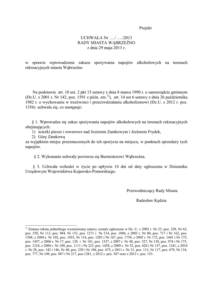 Projekt UCHWAŁA Nr …./ …./2013 RADY MIASTA WĄBRZEŹNO z dnia 29 maja 2013 r. w sprawie wprowadzenia zakazu spożywania napojów alkoholowych na terenach rekreacyjnych miasta Wąbrzeźno Na podstawie art. 18 ust. 2 pkt 15 ustawy z dnia 8 marca 1990 r. o samorządzie gminnym (Dz.U. z 2001 r. Nr 142, poz. 1591 z późn. zm.1)), art. 14 ust 6 ustawy z dnia 26 października 1982 r. o wychowaniu w trzeźwości i przeciwdziałaniu alkoholizmowi (Dz.U. z 2012 r. poz. 1356) uchwala się, co następuje: § 1. Wprowadza się zakaz spożywania napojów alkoholowych na terenach rekreacyjnych obejmujących: 1) ścieżki piesze i rowerowe nad Jeziorem Zamkowym i Jeziorem Frydek, 2) Górę Zamkową za wyjątkiem miejsc przeznaczonych do ich spożycia na miejscu, w punktach sprzedaży tych napojów. § 2. Wykonanie uchwały powierza się Burmistrzowi Wąbrzeźna. § 3. Uchwała wchodzi w życie po upływie 14 dni od daty ogłoszenia w Dzienniku Urzędowym Województwa Kujawsko-Pomorskiego. Przewodniczący Rady Miasta Radosław Kędzia 1) Zmiany tekstu jednolitego wymienionej ustawy zostały ogłoszone w Dz. U. z 2002 r. Nr 23, poz. 220, Nr 62, poz. 558, Nr 113, poz. 984, Nr 153, poz. 1271 i Nr 214, poz. 1806, z 2003 r. Nr 80, poz. 717 i Nr 162, poz. 1568, z 2004 r. Nr 102, poz. 1055, Nr 116, poz. 1203 i Nr 167, poz. 1759, z 2005 r. Nr 172, poz. 1441 i Nr 175, poz. 1457, z 2006 r. Nr 17, poz. 128 i Nr 181, poz. 1337, z 2007 r. Nr 48, poz. 327, Nr 138, poz. 974 i Nr 173, poz. 1218, z 2008 r. Nr 180, poz. 1111 i Nr 223, poz. 1458, z 2009 r. Nr 52, poz. 420 i Nr 157, poz. 1241, z 2010 r. Nr 28, poz. 142 i 146, Nr 40, poz. 230 i Nr 106, poz. 675, z 2011 r. Nr 21, poz. 113, Nr 117, poz. 679, Nr 134, poz. 777, Nr 149, poz. 887 i Nr 217, poz.1281, z 2012 r. poz. 567 oraz z 2013 r. poz. 153 . Uzasadnienie Zgodnie z art. 14 ust. 6 ustawy o wychowaniu w trzeźwości i przeciwdziałaniu alkoholizmowi Rada Miasta może wprowadzić czasowy lub stały zakaz sprzedaży, podawania, spożywania oraz wnoszenia napojów alkoholowych. Z uwagi na wypoczynkowy oraz spacerowy charakter wymienionych w niniejszej uchwale miejsc, wskazanym jest objąć je stałym zakazem spożywania napojów alkoholowych. Wymienione miejsca mogą nie spełniać swojego przeznaczenia szczególnie, gdy ludzie będący pod wpływem alkoholu swoim zachowaniem będą zakłócać porządek i spokój. Wprowadzenie zakazu spożywania napojów alkoholowych we wskazanych miejscach spowoduje, że staną się one bardziej atrakcyjne dla wszystkich, którzy będą chcieli z nich korzystać.