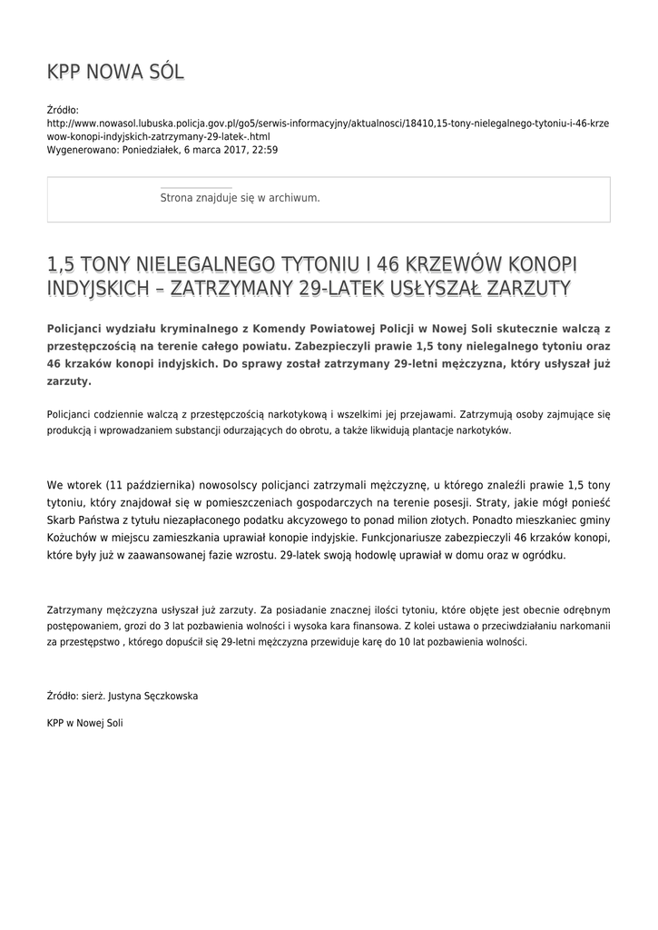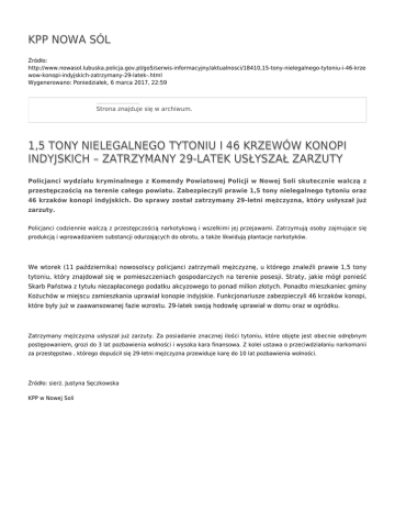KPP NOWA SÓL Źródło: http://www.nowasol.lubuska.policja.gov.pl/go5/serwis-informacyjny/aktualnosci/18410,15-tony-nielegalnego-tytoniu-i-46-krze wow-konopi-indyjskich-zatrzymany-29-latek-.html Wygenerowano: Poniedziałek, 6 marca 2017, 22:59 Strona znajduje się w archiwum. 1,5 TONY NIELEGALNEGO TYTONIU I 46 KRZEWÓW KONOPI INDYJSKICH – ZATRZYMANY 29-LATEK USŁYSZAŁ ZARZUTY Policjanci wydziału kryminalnego z Komendy Powiatowej Policji w Nowej Soli skutecznie walczą z przestępczością na terenie całego powiatu. Zabezpieczyli prawie 1,5 tony nielegalnego tytoniu oraz 46 krzaków konopi indyjskich. Do sprawy został zatrzymany 29-letni mężczyzna, który usłyszał już zarzuty. Policjanci codziennie walczą z przestępczością narkotykową i wszelkimi jej przejawami. Zatrzymują osoby zajmujące się produkcją i wprowadzaniem substancji odurzających do obrotu, a także likwidują plantacje narkotyków. We wtorek (11 października) nowosolscy policjanci zatrzymali mężczyznę, u którego znaleźli prawie 1,5 tony tytoniu, który znajdował się w pomieszczeniach gospodarczych na terenie posesji. Straty, jakie mógł ponieść Skarb Państwa z tytułu niezapłaconego podatku akcyzowego to ponad milion złotych. Ponadto mieszkaniec gminy Kożuchów w miejscu zamieszkania uprawiał konopie indyjskie. Funkcjonariusze zabezpieczyli 46 krzaków konopi, które były już w zaawansowanej fazie wzrostu. 29-latek swoją hodowlę uprawiał w domu oraz w ogródku. Zatrzymany mężczyzna usłyszał już zarzuty. Za posiadanie znacznej ilości tytoniu, które objęte jest obecnie odrębnym postępowaniem, grozi do 3 lat pozbawienia wolności i wysoka kara finansowa. Z kolei ustawa o przeciwdziałaniu narkomanii za przestępstwo , którego dopuścił się 29-letni mężczyzna przewiduje karę do 10 lat pozbawienia wolności. Źródło: sierż. Justyna Sęczkowska KPP w Nowej Soli Zainstaluj wtyczkę Flash, aby zobaczyć odtwarzacz. pobierz film - 7.22 MB Ocena: 0/5 (0) Tweetnij