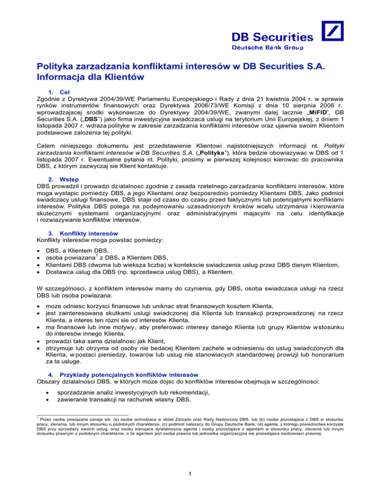 Polityka zarzadzania konfliktami interesów w DB Securities S.A. Informacja dla Klientów 1. Cel Zgodnie z Dyrektywa 2004/39/WE Parlamentu Europejskiego i Rady z dnia 21 kwietnia 2004 r. w sprawie rynków instrumentów finansowych oraz Dyrektywa 2006/73/WE Komisji z dnia 10 sierpnia 2006 r. wprowadzajacej srodki wykonawcze do Dyrektywy 2004/39/WE, zwanymi dalej lacznie „MiFID”, DB Securities S.A. („DBS”) jako firma inwestycyjna swiadczaca uslugi na terytorium Unii Europejskiej, z dniem 1 listopada 2007 r. wdraza polityke w zakresie zarzadzania konfliktami interesów oraz ujawnia swoim Klientom podstawowe zalozenia tej polityki. Celem niniejszego dokumentu jest przedstawienie Klientowi najistotniejszych informacji nt. Polityki zarzadzania konfliktami interesów w DB Securities S.A. („Polityka”), która bedzie obowiazywac w DBS od 1 listopada 2007 r. Ewentualne pytania nt. Polityki, prosimy w pierwszej kolejnosci kierowac do pracownika DBS, z którym zazwyczaj sie Klient kontaktuje. 2. Wstep DBS prowadzil i prowadzi dzialalnosc zgodnie z zasada rzetelnego zarzadzania konfliktami interesów, które moga wystapic pomiedzy DBS, a jego Klientami oraz bezposrednio pomiedzy Klientami DBS. Jako podmiot swiadczacy uslugi finansowe, DBS staje od czasu do czasu przed faktycznymi lub potencjalnymi konfliktami interesów. Polityka DBS polega na podejmowaniu uzasadnionych kroków wcelu utrzymania i kierowania skutecznymi systemami organizacyjnymi oraz administracyjnymi majacymi na celu identyfikacje i rozwiazywanie konfliktów interesów. 3. Konflikty interesów Konflikty interesów moga powstac pomiedzy: • • • • DBS, a Klientem DBS, 1 osoba powiazana z DBS, a Klientem DBS, Klientami DBS (dwoma lub wieksza liczba) w kontekscie swiadczenia uslug przez DBS danym Klientom, Dostawca uslug dla DBS (np. sprzedawca uslug DBS), a Klientem. W szczególnosci, z konfliktem interesów mamy do czynienia, gdy DBS, osoba swiadczaca uslugi na rzecz DBS lub osoba powiazana: • • • • • moze odniesc korzysci finansowe lub uniknac strat finansowych kosztem Klienta, jest zainteresowana skutkami uslugi swiadczonej dla Klienta lub transakcji przeprowadzonej na rzecz Klienta, a interes ten rózni sie od interesów Klienta, ma finansowe lub inne motywy, aby preferowac interesy danego Klienta lub grupy Klientów w stosunku do interesów innego Klienta, prowadzi taka sama dzialalnosc jak Klient, otrzymuje lub otrzyma od osoby nie bedacej Klientem zachete w odniesieniu do uslug swiadczonych dla Klienta, w postaci pieniedzy, towarów lub uslug nie stanowiacych standardowej prowizji lub honorarium za ta usluge. 4. Przyklady potencjalnych konfliktów interesów Obszary dzialalnosci DBS, w których moze dojsc do konfliktów interesów obejmuja w szczególnosci: • • sporzadzanie analiz inwestycyjnych lub rekomendacji, zawieranie transakcji na rachunek wlasny DBS, 1 Przez osobe powiazana uznaje sie: (a) osobe wchodzaca w sklad Zarzadu oraz Rady Nadzorczej DBS, lub (b) osobe pozostajaca z DBS w stosunku pracy, zlecenia, lub innym stosunku o podobnych charakterze, (c) podmiot nalezacy do Grupy Deutsche Bank, (d) agenta, z którego posrednictwa korzysta DBS przy sprzedazy swoich uslug, oraz osoby kierujace dzialalnoscia agenta i osoby pozostajace z agentem w stosunku pracy, zlecenie lub innym stosunku prawnym o podobnym charakterze, o ile agentem jest osoba prawna lub jednostka organizacyjna nie posiadajaca osobowosci prawnej. 1 • • doradztwo w zakresie finansowania przedsiebiorstw, zawieranie transakcji na rachunek wlasny przez osoby powiazane. Przyklady sytuacji mogacych stanowic typowy konflikt interesów, który moze powstac w odniesieniu do uslug inwestycyjnych swiadczonych przez DBS (lista nie jest zamknieta): • • • • DBS moze prowadzic dzialalnosc i obrót instrumentami finansowymi na wlasny rachunek i/lub na rachunek Klientów, podczas gdy inni Klienci dzialaja na tych samych rynkach, w tym samym czasie w odniesieniu do tych samych lub skorelowanych instrumentów finansowych, osoby powiazane moga prowadzic obrót na wlasny rachunek, podczas gdy Klienci DBS dzialaja na tych samych rynkach, w tym samym czasie w odniesieniu do tych samych lub skorelowanych instrumentów finansowych, DBS lub osoby powiazane moga otrzymac upominki znacznej wartosci, które moga wplywac na zachowanie w taki sposób, ze moze to skutkowac powstaniem konfliktu z interesami Klientów DBS; DBS posiada odpowiednie procedury majace zastosowanie w przypadku przekazania lub otrzymania przez DBS lub osoby powiazane upominku znacznej wartosci, co moze byc uznane za formy zachety, DBS moze wydawac analizy i rekomendacje dotyczace podmiotu, dla którego swiadczy równiez uslugi doradcze. 5. Identyfikacja i zarzadzanie konfliktami interesów W celu identyfikacji i zarzadzania konfliktami interesów DBS posiada odpowiednie instrumenty zapewniajace w szczególnosci, ze: • • • • • • • dzialy DBS i ich pracownicy dzialaja w sposób odpowiednio niezalezny od siebie, istnieja skuteczne procedury kontrolujace przeplyw informacji, istnieja odpowiednie procesy kontrolne w celu identyfikacji i zarzadzania wzajemnymi relacjami oraz zewnetrznym zaangazowaniem w dzialalnosc gospodarcza osób powiazanych, Klient jest odpowiednio powiadamiany w rzetelny i nie wprowadzajacy w blad sposób o konflikcie interesów, który niesie ze soba istotne ryzyko narazenia interesów Klienta, co umozliwia Klientowi podjecie swiadomych decyzji, prowadzone sa odpowiednie rejestry uslug, dzialalnosci i transakcji DBS, w których zidentyfikowano konflikt interesów, lub w których potencjalnie taki konflikt móglby sie pojawic, w razie potrzeby, osoby powiazane podlegaja ograniczeniom w zakresie zawierania transakcji na rachunek wlasny, przeprowadzane sa okresowe przeglady skutecznosci systemów i procesów kontrolnych DBS. Podstawowym, stosowanym przez DBS sposobem zarzadzania i zapobiegania konfliktom interesów jest utrzymywanie barier inf