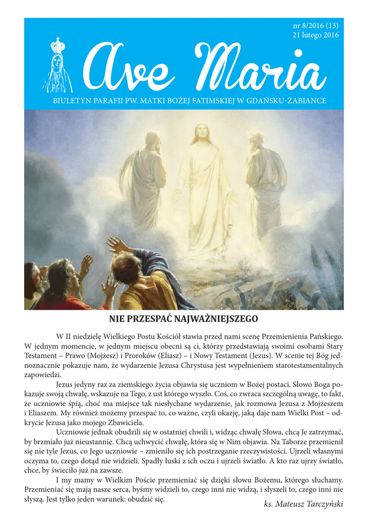 nr 8/2016 (13) 21 lutego 2016 Ave Maria BIULETYN PARAFII PW. MATKI BOŻEJ FATIMSKIEJ W GDAŃSKU-ŻABIANCE NIE PRZESPAĆ NAJWAŻNIEJSZEGO W II niedzielę Wielkiego Postu Kościół stawia przed nami scenę Przemienienia Pańskiego. W jednym momencie, w jednym miejscu obecni są ci, którzy przedstawiają swoimi osobami Stary Testament – Prawo (Mojżesz) i Proroków (Eliasz) – i Nowy Testament (Jezus). W scenie tej Bóg jednoznacznie pokazuje nam, że wydarzenie Jezusa Chrystusa jest wypełnieniem starotestamentalnych zapowiedzi. Jezus jedyny raz za ziemskiego życia objawia się uczniom w Bożej postaci. Słowo Boga pokazuje swoją chwałę, wskazuje na Tego, z ust którego wyszło. Coś, co zwraca szczególną uwagę, to fakt, że uczniowie śpią, choć ma miejsce tak niesłychane wydarzenie, jak rozmowa Jezusa z Mojżeszem i Eliaszem. My również możemy przespać to, co ważne, czyli okazję, jaką daje nam Wielki Post – odkrycie Jezusa jako mojego Zbawiciela. Uczniowie jednak obudzili się w ostatniej chwili i, widząc chwałę Słowa, chcą Je zatrzymać, by brzmiało już nieustannie. Chcą uchwycić chwałę, która się w Nim objawia. Na Taborze przemienił się nie tyle Jezus, co Jego uczniowie – zmieniło się ich postrzeganie rzeczywistości. Ujrzeli własnymi oczyma to, czego dotąd nie widzieli. Spadły łuski z ich oczu i ujrzeli światło. A kto raz ujrzy światło, chce, by świeciło już na zawsze. I my mamy w Wielkim Poście przemieniać się dzięki słowu Bożemu, którego słuchamy. Przemieniać się mają nasze serca, byśmy widzieli to, czego inni nie widzą, i słyszeli to, czego inni nie słyszą. Jest tylko jeden warunek: obudzić się. ks. Mateusz Tarczyński ZE SŁOWA BOŻEGO NA II NIEDZIELĘ WIELKIEGO POSTU Rdz 15,5-12.17-18; Ps 27,1.7-9.13-14; Flp 3,17-4,1; Łk 9,28b-36 Jezus wziął z sobą Piotra, Jana i Jakuba i wyszedł na górę, aby się modlić. Gdy się modlił, wygląd Jego twarzy się odmienił, a Jego odzienie stało się lśniąco białe. A oto dwóch mężów rozmawiało z Nim. Byli to Mojżesz i Eliasz. Ukazali się oni w chwale i mówili o Jego odejściu, którego miał dokonać w Jerozolimie. Tymczasem Piotr i towarzysze snem byli zmorzeni. Gdy się ocknęli, ujrzeli Jego chwałę i obydwóch mężów, stojących przy Nim. Gdy oni odchodzili od Niego, Piotr rzekł do Jezusa: Mistrzu, dobrze, że tu jesteśmy. Postawimy trzy namioty: jeden dla Ciebie, jeden dla Mojżesza i jeden dla Eliasza. Nie wiedział bowiem, co mówi. Gdy jeszcze to mówił, zjawił się obłok i osłonił ich; zlękli się, gdy [tamci] weszli w obłok. A z obłoku odezwał się głos: To jest Syn mój, Wybrany, Jego słuchajcie! W chwili, gdy odezwał się ten głos, Jezus znalazł się sam. A oni zachowali milczenie i w owym czasie nikomu nic nie oznajmili o tym, co widzieli. Z KALENDARZA LITURGICZNEGO 22 LUTEGO KATEDRY ŚWIĘTEGO PIOTRA, APOSTOŁA Do roku 1969 Kościół łaciński obchodził dwa święta związane ze Stolicą Piotrową: Katedry św. Piotra w Rzymie (18 I) i Katedry św. Piotra w Antiochii (22 II). Po reformie liturgii oba te święta zostały połączone w jedno pod wspólną nazwą: Katedry św. Piotra. Od IV w. chrześcijanie rzymscy znali i obchodzili święto Katedry świętego Piotra, wspominając, że Apostoł był biskupem tego miasta. W ten sposób składali hołd św. Piotrowi za to, że właśnie w Rzymie założył gminę chrześcijańską i miasto to obrał za stolicę chrześcijaństwa. Ponieważ jednak święto wypadało dawniej często podczas postu, dlatego w wielu stronach, np. w Galii, zaczęto je obchodzić 18 stycznia. Z biegiem lat ustaliły się zwyczajowo dwa święta: 18 stycznia Katedry św. Piotra w Rzymie, a 22 lutego Katedry św. Piotra w Antiochii. Według bowiem bardzo dawnej tradycji św. Piotr miał najpierw założyć swoją stolicę prymasa Kościoła Chrystusowego w Antiochii, gdzie przebywał kilka lat, zanim udał się ok. 42 roku do Rzymu i tam poniósł śmierć męczeńską. W 1558 roku papież Paweł IV ustalił ostatecznie 18 stycznia jako pamiątkę wstąpienia na tron rzymski św. Piotra, a 22 lutego na obchód święta objęcia stolicy w Antiochii. Oba święta obchodzone początkowo w Rzymie Paweł IV rozszerzył obowiązkowo na cały Kościół łaciński. W bazylice św. Piotra w Rzymie za głównym ołtarzem, w absydzie, jest tron (katedra), na którym miał zasiadać św. Piotr. Do V w. znajdował się on w baptysterium bazyliki św. Piotra. Drogocenna relikwia składa się jedynie z wielu kawałków drewna, spojonych od dawna bogato zdobionymi płytami z kości słoniowej. Słynny budowniczy bazyliki św. Piotra, Jan Wawrzyniec Bernini (+ 1680), zamknął ów tron w potężnej, marmurowej budowli. Ta właśnie katedra stała się symbolem władzy zwierzchniej w Kościele Chrystusa tak w osobie świętego Piotra, jak również jego następców. Święto to jest więc z jednej strony aktem wdzięczności Rzymian za to, że św. Piotr tak bardzo wyróżnił ich miasto, z drugiej zaś strony - jest okazją dla wiernych Kościoła okazania następcom św. Piotra wyrazu czci. Tron, na którym zasiadał św. Piotr, obecny stale w kościele, gdzie papież odprawia nabożeństwa i sprawu- je liturgię dnia, jest nieustannym świadectwem, że biskupi rzymscy mają tę samą władzę nad Kościołem Chrystusa, jaką miał Piotr; że następcami Piotra mogą być tylko biskupi rzymscy. Teksty ewangeliczne podają nam wiele przykładów, że Chrystus Pan spomiędzy wszystkich Apostołów wyróżniał w sposób szczególniejszy św. Piotra. Warto przypomnieć w tym miejscu dwa: obietnicę prymatu i jej wypełnienie: „I ja tobie powiadam: Ty jesteś Piotr (czyli Skała), i na tej Skale zbuduję Kościół mój, a bramy piekielne go nie przemogą. I tobie dam klucze królestwa niebieskiego; cokolwiek zwiążesz na ziemi, będzie związane w niebie, a cokolwiek rozwiążesz na ziemi, będzie rozwiązane w 