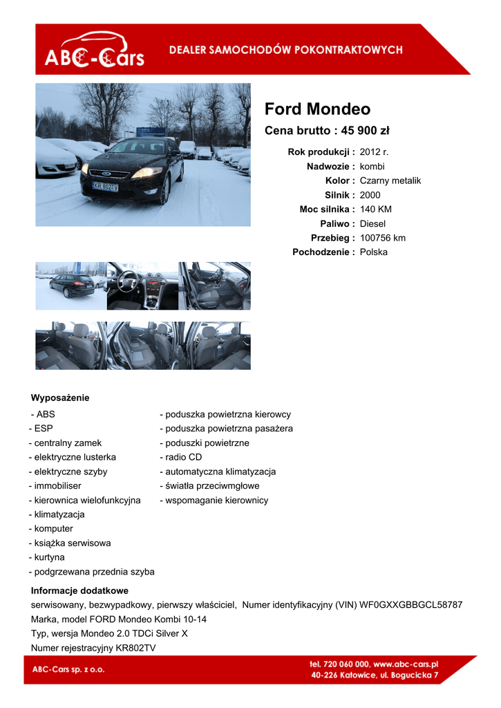 Ford Mondeo Cena brutto : 45 900 zł Rok produkcji : 2012 r. Nadwozie : kombi Kolor : Czarny metalik Silnik : 2000 Moc silnika : 140 KM Paliwo : Diesel Przebieg : 100756 km Pochodzenie : Polska Wyposażenie - ABS - poduszka powietrzna kierowcy - ESP - poduszka powietrzna pasażera - centralny zamek - poduszki powietrzne - elektryczne lusterka - radio CD - elektryczne szyby - automatyczna klimatyzacja - immobiliser - światła przeciwmgłowe - kierownica wielofunkcyjna - wspomaganie kierownicy - klimatyzacja - komputer - książka serwisowa - kurtyna - podgrzewana przednia szyba Informacje dodatkowe serwisowany, bezwypadkowy, pierwszy właściciel, Numer identyfikacyjny (VIN) WF0GXXGBBGCL58787 Marka, model FORD Mondeo Kombi 10-14 Typ, wersja Mondeo 2.0 TDCi Silver X Numer rejestracyjny KR802TV Silnik (rodz./poj./moc) diesel/1997 ccm/103 kW Stan licznika 100 756 km Data 1. rej./rok prod. 05-12-2012 /2012 Data nast. bad. techn. 17-11-2017 Nadwozie KOM 5/5 Lakier Czarny/2-warstwowa metalizowana Skrzynia biegów manualna Wszelkich informacji na temat pojazdu udzielą handlowcy pod numerem telefonu: (720 060 000 ) Zapraszamy do jazdy próbnej i sprawdzenia auta na serwisie. Wszystkie oferowane przez Nas auta, - pochodzą z krajowej sieci dealerskiej, - są serwisowane w autoryzowanych stacjach obsługi, - w bieżącej ofercie handlowej oferujemy ponad 100 używanych samochodów o udokumentowanej historii napraw i przeglądów, - w stałej ofercie posiadamy pełny wybór aut, zarówno pod względem marek, modeli, jak i przebiegów, - z możliwością zakupu za gotówkę lub w leasing, - z możliwością finansowania z Pakietem serwisowo-gwarancyjnym - z możliwością odliczenia VAT ( pełna faktura VAT). Firma ABC-CARS Sp. z o.o., to prężnie rozwijający się, dealer samochodów używanych na terenie Górnego Śląska. Zapraszamy do odwiedzenia Naszej strony internetowej Master1.otomoto.pl. Jesteśmy tak pewni naszych samochodów, że naszym klientom gwarantujemy ich ponowne nabycie jeśli zdecydują się ponownie skorzystać z naszych usług. Co oznacza, że posiadamy centrum samochodowe? U nas można nie tylko kupić samochód. Oferujemy pomoc w kredycie, leasingu i ubezpieczeniu, doposażenie auta w interesujące ich akcesoria już w momencie zakupu, bieżącą obsługę serwisową oraz likwidowanie szkód komunikacyjnych. Zapraszamy do naszego centrum samochodowego w Katowicach na ulicy Bogucickiej 7. Niniejsze ogłoszenie jest wyłącznie informacją handlową i nie stanowi oferty w myśl art. 66, § 1. Kodeksu Cywilnego. Sprzedający nie odpowiada za ewentualne błędy lub nieaktualność ogłoszenia.