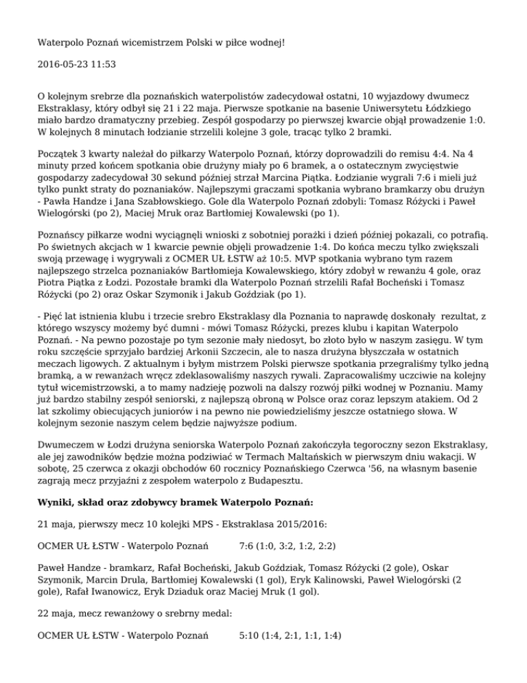 Waterpolo Poznań wicemistrzem Polski w piłce wodnej! 2016-05-23 11:53 O kolejnym srebrze dla poznańskich waterpolistów zadecydował ostatni, 10 wyjazdowy dwumecz Ekstraklasy, który odbył się 21 i 22 maja. Pierwsze spotkanie na basenie Uniwersytetu Łódzkiego miało bardzo dramatyczny przebieg. Zespół gospodarzy po pierwszej kwarcie objął prowadzenie 1:0. W kolejnych 8 minutach łodzianie strzelili kolejne 3 gole, tracąc tylko 2 bramki. Początek 3 kwarty należał do piłkarzy Waterpolo Poznań, którzy doprowadzili do remisu 4:4. Na 4 minuty przed końcem spotkania obie drużyny miały po 6 bramek, a o ostatecznym zwycięstwie gospodarzy zadecydował 30 sekund później strzał Marcina Piątka. Łodzianie wygrali 7:6 i mieli już tylko punkt straty do poznaniaków. Najlepszymi graczami spotkania wybrano bramkarzy obu drużyn - Pawła Handze i Jana Szabłowskiego. Gole dla Waterpolo Poznań zdobyli: Tomasz Różycki i Paweł Wielogórski (po 2), Maciej Mruk oraz Bartłomiej Kowalewski (po 1). Poznańscy piłkarze wodni wyciągnęli wnioski z sobotniej porażki i dzień później pokazali, co potrafią. Po świetnych akcjach w 1 kwarcie pewnie objęli prowadzenie 1:4. Do końca meczu tylko zwiększali swoją przewagę i wygrywali z OCMER UŁ ŁSTW aż 10:5. MVP spotkania wybrano tym razem najlepszego strzelca poznaniaków Bartłomieja Kowalewskiego, który zdobył w rewanżu 4 gole, oraz Piotra Piątka z Łodzi. Pozostałe bramki dla Waterpolo Poznań strzelili Rafał Bocheński i Tomasz Różycki (po 2) oraz Oskar Szymonik i Jakub Goździak (po 1). - Pięć lat istnienia klubu i trzecie srebro Ekstraklasy dla Poznania to naprawdę doskonały rezultat, z którego wszyscy możemy być dumni - mówi Tomasz Różycki, prezes klubu i kapitan Waterpolo Poznań. - Na pewno pozostaje po tym sezonie mały niedosyt, bo złoto było w naszym zasięgu. W tym roku szczęście sprzyjało bardziej Arkonii Szczecin, ale to nasza drużyna błyszczała w ostatnich meczach ligowych. Z aktualnym i byłym mistrzem Polski pierwsze spotkania przegraliśmy tylko jedną bramką, a w rewanżach wręcz zdeklasowaliśmy naszych rywali. Zapracowaliśmy uczciwie na kolejny tytuł wicemistrzowski, a to mamy nadzieję pozwoli na dalszy rozwój piłki wodnej w Poznaniu. Mamy już bardzo stabilny zespół seniorski, z najlepszą obroną w Polsce oraz coraz lepszym atakiem. Od 2 lat szkolimy obiecujących juniorów i na pewno nie powiedzieliśmy jeszcze ostatniego słowa. W kolejnym sezonie naszym celem będzie najwyższe podium. Dwumeczem w Łodzi drużyna seniorska Waterpolo Poznań zakończyła tegoroczny sezon Ekstraklasy, ale jej zawodników będzie można podziwiać w Termach Maltańskich w pierwszym dniu wakacji. W sobotę, 25 czerwca z okazji obchodów 60 rocznicy Poznańskiego Czerwca '56, na własnym basenie zagrają mecz przyjaźni z zespołem waterpolo z Budapesztu. Wyniki, skład oraz zdobywcy bramek Waterpolo Poznań: 21 maja, pierwszy mecz 10 kolejki MPS - Ekstraklasa 2015/2016: OCMER UŁ ŁSTW - Waterpolo Poznań 7:6 (1:0, 3:2, 1:2, 2:2) Paweł Handze - bramkarz, Rafał Bocheński, Jakub Goździak, Tomasz Różycki (2 gole), Oskar Szymonik, Marcin Drula, Bartłomiej Kowalewski (1 gol), Eryk Kalinowski, Paweł Wielogórski (2 gole), Rafał Iwanowicz, Eryk Dziaduk oraz Maciej Mruk (1 gol). 22 maja, mecz rewanżowy o srebrny medal: OCMER UŁ ŁSTW - Waterpolo Poznań 5:10 (1:4, 2:1, 1:1, 1:4) Paweł Handze - bramkarz, Rafał Bocheński (2 gole), Jakub Goździak (1 gol), Tomasz Różycki (2 gole), Oskar Szymonik (1 gol), Marcin Drula, Bartłomiej Kowalewski (4 gole), Eryk Kalinowski, Paweł Wielogórski, Rafał Iwanowicz, Eryk Dziaduk oraz Maciej Mruk. Trener: Jacek Maciąg Aleksandra Gutkowska/el Autor: Miejski Informator Multimedialny - www.poznan.pl Przeczytano: 107 razy Źródło: http://www.poznan.pl/mim/wiadmag/news/waterpo…