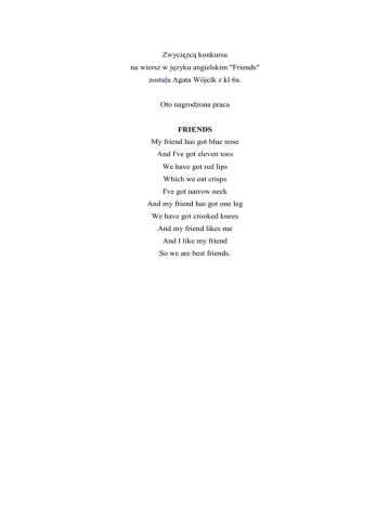 Zwyci zc konkursu na wiersz w j zyku angielskim "Friends" zosta a Agata Wójcik z kl 6a. Oto nagrodzona praca FRIENDS My friend has got blue nose And I've got eleven toes We have got red lips Which we eat crisps I've got narrow neck And my friend has got one leg We have got crooked knees And my friend likes me And I like my friend So we are best friends.