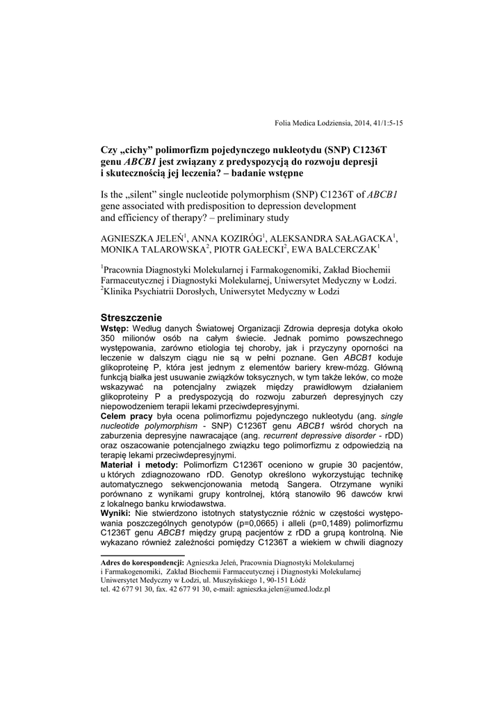 Folia Medica Lodziensia, 2014, 41/1:5-15 Czy „cichy” polimorfizm pojedynczego nukleotydu (SNP) C1236T genu ABCB1 jest związany z predyspozycją do rozwoju depresji i skutecznością jej leczenia? – badanie wstępne Is the „silent” single nucleotide polymorphism (SNP) C1236T of ABCB1 gene associated with predisposition to depression development and efficiency of therapy? – preliminary study AGNIESZKA JELEŃ1, ANNA KOZIRÓG1, ALEKSANDRA SAŁAGACKA1, MONIKA TALAROWSKA2, PIOTR GAŁECKI2, EWA BALCERCZAK1 1 Pracownia Diagnostyki Molekularnej i Farmakogenomiki, Zakład Biochemii Farmaceutycznej i Diagnostyki Molekularnej, Uniwersytet Medyczny w Łodzi. 2 Klinika Psychiatrii Dorosłych, Uniwersytet Medyczny w Łodzi Streszczenie Wstęp: Według danych Światowej Organizacji Zdrowia depresja dotyka około 350 milionów osób na całym świecie. Jednak pomimo powszechnego występowania, zarówno etiologia tej choroby, jak i przyczyny oporności na leczenie w dalszym ciągu nie są w pełni poznane. Gen ABCB1 koduje glikoproteinę P, która jest jednym z elementów bariery krew-mózg. Główną funkcją białka jest usuwanie związków toksycznych, w tym także leków, co może wskazywać na potencjalny związek między prawidłowym działaniem glikoproteiny P a predyspozycją do rozwoju zaburzeń depresyjnych czy niepowodzeniem terapii lekami przeciwdepresyjnymi. Celem pracy była ocena polimorfizmu pojedynczego nukleotydu (ang. single nucleotide polymorphism - SNP) C1236T genu ABCB1 wśród chorych na zaburzenia depresyjne nawracające (ang. recurrent depressive disorder - rDD) oraz oszacowanie potencjalnego związku tego polimorfizmu z odpowiedzią na terapię lekami przeciwdepresyjnymi. Materiał i metody: Polimorfizm C1236T oceniono w grupie 30 pacjentów, u których zdiagnozowano rDD. Genotyp określono wykorzystując technikę automatycznego sekwencjonowania metodą Sangera. Otrzymane wyniki porównano z wynikami grupy kontrolnej, którą stanowiło 96 dawców krwi z lokalnego banku krwiodawstwa. Wyniki: Nie stwierdzono istotnych statystycznie różnic w częstości występowania poszczególnych genotypów (p=0,0665) i alleli (p=0,1489) polimorfizmu C1236T genu ABCB1 między grupą pacjentów z rDD a grupą kontrolną. Nie wykazano również zależności pomiędzy C1236T a wiekiem w chwili diagnozy Adres do korespondencji: Agnieszka Jeleń, Pracownia Diagnostyki Molekularnej i Farmakogenomiki, Zakład Biochemii Farmaceutycznej i Diagnostyki Molekularnej Uniwersytet Medyczny w Łodzi, ul. Muszyńskiego 1, 90-151 Łódź tel. 42 677 91 30, fax. 42 677 91 30, e-mail: [email protected] 6 Ocena genu ABCB1 w depresji – badanie wstępne rDD (p=0,0807), nasileniem objawów depresji przed rozpoczęciem terapii (p=0,7956) czy skutecznością leczenia przeciwdepresyjnego (p=0,2051). Wnioski: Na podstawie wyników badania wstępnego, stwierdzono brak wpływu polimorfizmu C1236T genu ABCB1 na predyspozycję do rozwoju rDD, nasilenie objawów depresji w chwili diagnozy czy skuteczność terapii przeciwdepresyjnej. Słowa kluczowe: ABCB1, polimorfizm pojedynczego nukleotydu, C1236T, glikoproteina P, depresja, farmakogenomika, podatność. Abstract Introduction: According to the World Health Organization about 350 million people around the world are affected by depression. Despite the high prevalence of this disease the mechanism of depression origination as well as the causes of the resistance to therapy are still not fully understood. ABCB1 gene encode P-glycoprotein which is one of the components of blood-brain barrier. The main function of this protein is the efflux of many toxic compounds, including drugs, which may indicate potential association between the proper functioning of P-glycoprotein and the susceptibility to the development of depressive disorders or the failure of antidepressant therapy. The objective of this study was to evaluate single nucleotide polymorphism (SNP) C1236T of the ABCB1 gene in the group of patients with recurrent depressive disorder (rDD) and to estimate the possible association of this polymorphism with the response to antidepressant therapy. Material and methods: C1236T was evaluated in 30 patients with rDD. Genotyping was performed using automated sequencing (the Sanger method). The results were compared with those obtained from the control group which consisted of 96 blood donors from the local blood bank. Results: No statistically significant difference in the frequency of genotypes (p=0.0665) and allele (p=0.1489) for the SNP C1236T of ABCB1 gene was found between the patients with rDD and the control group. No correlation between C1236 and the age when the disease was stated (p=0.0807). Neither the association between genotypes and the severity of depressive symptoms before treatment (p=0.7956) nor the association with effectiveness of the therapy (p=0.2051) were found. Conclusions: On the basis of the results of the preliminary study, C1236T of ABCB1 gene have no influence on the predisposition to rDD, the severity of depressive symptoms and the efficiency of antidepressant therapy have not been stated, either. Agnieszka Jeleń i wsp. 7 Key words: ABCB1, single nucleotide polymorphism, C1236T, P-glycoprotein, depression, pharmacogenomics, susceptibility. Wstęp W odpowiedzi na problem XXI wieku, jakim niewątpliwie jest nieskuteczność farmakoterapii w leczeniu zaburzeń psychicznych przy jednocześnie szybko powiększającym się odsetku osób dotkniętych tą chorobą, coraz większe znaczenie wydaje się mieć poznanie endogennych przyczyn rozwoju oraz niepowodzenia w leczeniu tych zaburzeń. Na depresję, która jest najczęściej występującym zaburzeniem psychicznym, choruje w ciągu całego swojego życia nawet do kilkunastu procent osób dorosłych [1]. Glikoproteina P, produkt ekspresji genu oporności wielolekowej ABCB1 (MDR1), jest błonowym białkiem transportującym o szerokim spektrum substratowym. Jej główną funkcją jest ochrona