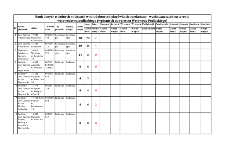 Bank danych o wolnych miejscach w całodobowych placówkach opiekuńczo - wychowawczych na terenie województwa podlaskiego (wpisanych do rejestru Wojewody Podlaskiego) Lp Nazwa placówki Adres 1 Dom Dziecka 17-230 w Białowieży Białowieża ul.Parkowa 2 2 Dom Dziecka 16-426 w Pawłówce Pawłówka Lipiec Lipec Sierpień Sierpień Wrzesień Wrzesień Październik Październik Listopad Listopad Grudzień Grudzień Liczba Wolne Liczba Wolne Liczba dzieci Wolne Liczba Wolne Liczba Wolne miejsc Liczba Wolne Liczba dzieci miejsc dzieci miejsca dzieci miejsca miejsca dzieci miejsca dzieci miejsca a 0856812 Socjalizacy Socjalizac 403 jna yjne 30 28 2 Telefon/ Typ Rodzaj Faks placówki miejsc 0875691 Socjalizacy Socjalizac 711 jna yjne 3 Pogotowie Opiekuńcze Opoka w Wasilkowie 16-010 Wasilków ul. Kościelna 40 0857185 Interwenc Interwenc 521 yjna yjne 4 Rodzinny Dom Dziecka w Augustowie 16-300 Augustów ul.Wypusty 13 0876431 Rodzinna 862/060 3388513 Rodzinne 5 Rodzinny Dom Dziecka Nr 1 w Białymstoku 15-442 0857445 Rodzinna Białystok 935 ul. Żabia 22 m 38 Rodzinne 6 Rodzinny Dom Dziecka Nr 2 w Białymstoku 15-774 Białystok ul. Kołłątaja 67 m 29 0856641 Rodzinna 224 Rodzinne 7 Rodzinny Dom Dziecka Nr 1 w Bielsku Podlaskim 17-100 Bielsk 0857300 Rodzinna Podlaski 822 ul. Jaroszewicza 15 Rodzinne 15-343 8 Rodzinny 0856631 Rodzinna Dom Dziecka Białystok 667 ul. Nowa 32A Świętej Rodziny z Nazaretu w Białymstoku Rodzinne 30 26 4 14 15 0 6 6 0 4 3 1 4 4 0 8 6 2 8 8 0 9 Nasz Dom Dobry Pasterz w Białymstoku 10 Wielofunkcyj na Placówka OpiekuńczoWychowawc za Jedynka w Białymstoku 11 Wielofunkcyj na Placówka OpiekuńczoWychowawc za Dwójka im. dr Ireny Białówny w Białymstoku 15-213 0857432 Wielofunk Białystok 250 cyjna Socjalizac ul.Mickiewicz yjne a 13 Wsparcia dziennego 54 0857328 Wielofunk 15-028 725 cyjna Białystok Socjalizac ul. Słonimska yjne 8 Mieszkani a usamodzi elnienia Wsparcia dziennego 73 15-320 Białystok ul. 11-go Listopada 6 74 12 Pogotowie 15-021 Opiekuńcze Białystok w ul.Orla 2 Białymstoku 0857420 Wielofunk 748 cyjna Interwenc yjne 24 44 10 53 20 73 1 64 6 30 30 23 20 20 30 Mieszkani a usamodzi elnienia Hostel 0857416 Wielofunk 846 cyjna Socjalizac yjne Interwenc yjne Interwenc yjna grupa pierwszeg o kontaktu 20 4 70 30 30 10 13 Dom Dziecka 16-030 0857183 Wielofunk w Supraślu Supraśl 516 cyjna Socjalizac ul.Piłsudskieg yjne o 17a Mieszkani a usamodzi elnienia 45 Interwenc yjne 10 0857177 Socjalizacy 134/085 jnoInterwenc 7177135 interwenc yjne yjna Socjalizac 55 14 Dom Dziecka 16-060 im.Janusza Zabłudów Korczaka w Krasne Krasnem yjne Mieszkani a usamodzi elnienia 15 Zespół 18-400 Placówek Łomża Opiekuńczo- ul.Polna 16 Wychowawc zych w Łomży 28 7 33 56 0 7 51 17 Wielofunkcyj na Placówka OpiekuńczoWychowawc za Środowiskow y Dom Rodzinny "Nasz Dom" w Białymstoku 95 10 30 w likwidacji 10 1 30 20 30 0 95 0 10 Wsparcia dziennego 80 Hotel 12 Interwenc yjne 0 15 0862164 Wielofunk 843/086 cyjna Interwenc 2163130 yjne Socjalizac yjne Grupa usamodzi elnienia Izba rotacyjna 16-400 0875663 Socjalizacy 16 Placówka Opiekuńczo- Suwałki 125 jnoSocjalizac interwenc yjne Wychowawc ul. 23-go za w Października yjna Interwenc 20a Suwałkach yjne 15-449 0856524 Białystok 717 ul. Proletariacka 21 48 3 18 Zespół Placówek OpiekuńczoWychowawc zych w Zambrowie 18-301 Zambrów Al. Woj. Polskiego 52 0862713 Wielofunk 489 cyjna Interwenc yjne Socjalizac yjne Grupa z zaburzeni ami psychiczn ymi Grupa usamodzi elnienia 57 10 24 63 12 11 0