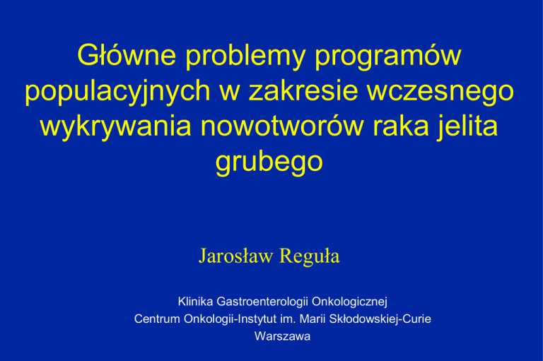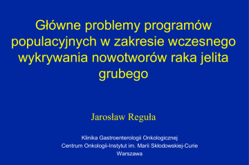 Główne problemy programów populacyjnych w zakresie wczesnego wykrywania nowotworów raka jelita grubego Jarosław Reguła Klinika Gastroenterologii Onkologicznej Centrum Onkologii-Instytut im. Marii Skłodowskiej-Curie Warszawa Metody badań przesiewowych • Testy wykrywające raka - gwajakolowy test na krew utajoną w kale – co rok - immunochemiczne badania stolca – co 1-3 lata - DNA w stolcu • Testy wykrywające raka i polipy - sigmoidoskopia (1/3 jelita) – co 5 lat - kolonoskopia – co 10 lat (raz w życiu) - wirtualna kolonoskopia (CT kolonografia) (Levin B. et al. CA Cancer J Clin 2008; 58:130) Skrining w raku j grubego • wszystkie metody – są kosztowo-efektywne • większość z nich jest – kosztowo-oszczędzające • najlepsza jest ta metoda, która jest stosowana (dobrze) ( w Polsce funkcjonuje program kolonoskopowy, który jest optymalny w warunkach polskich) Skrining raka jelita grubego daje oszczędności !!!! Lansdorp-Vogelaar I et al. J Natl Cancer Inst 2009 Badanie populacyjne, RCT, 18,114 uczestników FIT vs sigmoidoskopia vs kolonoskopia Zgłaszalność Zgłasz (Verona) Rak Zaaw. gruczolak FIT 32% 56% 0,1% 1,1% Sigmo 32% 52% 0,6% 4,6% Colo 27% 47% 0,8% 6,3% Segnan N et al. Gastroenterology 2007 Kolonoskopia vs FIT Hiszpania RCT, 53,302 uczetsników Zgłaszalność Zaaw neoplasia proksymalna dystalna FIT 34% Kolo 25% 0,2% 0,9% 0,8% 1,5% Quintero E et al. NEJM 2012 Badania przesiewowe na świecie • klasyczny test na krew utaj.– Francja, Finlandia, UK • immunologiczny – ” – Holandia od 2013 • sigmoidoskopia – UK od 2012 • kolonoskopia – Niemcy , Austria, Polska, Włochy, Czechy (odejście od FOBT) • wszystkie powyższe - USA Kolonoskopia jako badanie pzesiewowe – dlaczego? • prostota: strategia jednostopniowa • prostota: organizacja b. prosta (raz w życiu) • niski koszt: 100 euro/zabieg • koszty całego programu - najtańsze • poprzednie badanie z użyciem testu stolca (lata 80-te) - 16% akceptacja Wady kolonoskopii przesiewowej - Badanie inwazyjne - Niższa zgłaszalność - Wyższy koszt początkowy - Potrzeba kontroli jakości Efekt jednej sigmoidoskopii Atkin W. et al. Lancet 2010 HR 0,68 (0,59-0,82) in ITT analysis Program oportunistyczny – ale zorganizowany - ok. 300 000 kolonoskopii od 2000 91 ośrodków w 2010/2011 Metody programu oportunistycznego • rekrutacja oportunistyczna - lekarze POZ • dodatkowe godziny pracy endoskopii • kolonoskopie wykonywane ambulatoryjnie • większość (70%) bez sedacji • wspólna baza danych - monitorowana centralnie Kryteria włączenia • ludzie zdrowi, • wiek 50-65 lat (40-65 gdy wywiad rodzinny) • pisemna zgoda Colonoscopy • programme New Engl J Med. 2006; 355, 1863 Wyniki lata 2000-2009 (189 196 kolonoskopii) • Rak - 1,760 (0.93 %) • Gruczolaki istotne (HGD, - 10,690 (5.65 %) - 12,450 (6.58 %) >1 cm, kosmkowe) • Raki lub gruczolaki istotne NordICC trial – Polish arm Kaminski MF, Regula J et al.N Engl J Med, 2010; 362: 1795-803 Ryzyko raka interwałowego - w zależności od jakości endoskopisty Średnia jakość endoskopistów z upływem lat 20,0% 18,0% 16,0% 14,0% 12,0% 21,7% 10,0% 8,0% 6,0% 14.1% 15.6% 17.7% 18.7% 2004' 2005' 2006' 2007' 4,0% 2,0% 0,0% 2010/2011 Kaminski MF et al. Gastrointest Endosc 2009;69(5):AB215. Tylko kolonoskopia (dobrej jakości) jest w stanie wykryć taką nieprawidłowość Program populacyjnhy - od 2012 • Wysokiej jakości zaproszenia w 5 ośrodkach • System zapraszany w pełni rozwiniety 4-5 lat (planowane 130 ośrodki ) • Data kolonoskopii wyznaczona w zaproszeniu (metodologia z badania NordICC ) • Jedna w życiu kolonoskopia - wiek 55-64 lata • Stopniowo zwiększany zakres terytorialny i kohort urodzeniowych • Pełne pokrycie populacji od 2021 ( zakładając 30% zgłaszalność) Wbudowany system ewaluacji • Grupy: niebieska) - zaproszenie w danym roku biała) - zaproszenie opóźnione Efekt populacyjny w Polsce zaczyna być widoczny… Dane niepublikowane, U. Wojciechowska Centrum Onkologii, W-wa Aktualna koncepcja Kolonoskopia raz w życiu jako jedyny test skriningowy w wieku około 60 lat Bez gruczolaków Gruczolaki Koniec skriningu Nadzór Bretthauer M. NEJM 2012 Aktulana sytuacja • Stary program 2000- 2011 – stworzono ośrodki dobrej jakości, wyszkolono endoskopistów aby rozpocząć program populacyjny • Nowy program od 2012 – wprowadzany stopniowo • Główne cechy nowego programu: - Jedna kolonoskopia w życiu wiek 55-64 - Wysokiej jakości zaproszenia - System ewaluacji w czasie implementacji Propozycja działania (aplikacji) • Tworzenie nowych ośrodków przesiewowych (sprzęt kolonokospowy, personel, szkolenia) • Finansowanie funkcjonowania utworzonych ośrodków • Włączenie do istniejącego Programu Przesiewowego - platforma informatyczna gotowa - wysyłka zaproszeń centralna - ewaluacja efektów - pomoc w szkoleniu