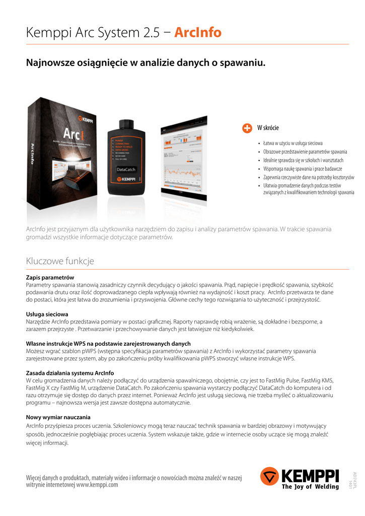Kemppi Arc System 2.5 – ArcInfo Najnowsze osiągnięcie w analizie danych o spawaniu. W skrócie • • • • • • Łatwa w użyciu w usługa sieciowa Obrazowe przedstawienie parametrów spawania Idealnie sprawdza się w szkołach i warsztatach Wspomaga naukę spawania i prace badawcze Zapewnia rzeczywiste dane na potrzeby kosztorysów Ułatwia gromadzenie danych podczas testów związanych z kwalifikowaniem technologii spawania ArcInfo jest przyjaznym dla użytkownika narzędziem do zapisu i analizy parametrów spawania. W trakcie spawania gromadzi wszystkie informacje dotyczące parametrów. Kluczowe funkcje Zapis parametrów Parametry spawania stanowią zasadniczy czynnik decydujący o jakości spawania. Prąd, napięcie i prędkość spawania, szybkość podawania drutu oraz ilość doprowadzanego ciepła wpływają również na wydajność i koszt pracy. ArcInfo przetwarza te dane do postaci, która jest łatwa do zrozumienia i przyswojenia. Główne cechy tego rozwiązania to użyteczność i przejrzystość. Usługa sieciowa Narzędzie ArcInfo przedstawia pomiary w postaci graficznej. Raporty naprawdę robią wrażenie, są dokładne i bezsporne, a zarazem przejrzyste . Przetwarzanie i przechowywanie danych jest łatwiejsze niż kiedykolwiek. Własne instrukcje WPS na podstawie zarejestrowanych danych Możesz wgrać szablon pWPS (wstępna specyfikacja parametrów spawania) z ArcInfo i wykorzystać parametry spawania zarejestrowane przez system, aby po zakończeniu próby kwalifikowania pWPS stworzyć własne instrukcje WPS. Zasada działania systemu ArcInfo W celu gromadzenia danych należy podłączyć do urządzenia spawalniczego, obojętnie, czy jest to FastMig Pulse, FastMig KMS, FastMig X czy FastMig M, urządzenie DataCatch. Po zakończeniu spawania wystarczy podłączyć DataCatch do komputera i od razu otrzymuje się dostęp do danych przez internet. Ponieważ ArcInfo jest usługą sieciową, nie trzeba myśleć o aktualizowaniu programu – najnowsza wersja jest zawsze dostępna automatycznie. Nowy wymiar nauczania ArcInfo przyśpiesza proces uczenia. Szkoleniowcy mogą teraz nauczać technik spawania w bardziej obrazowy i motywujący sposób, jednocześnie pogłębiając proces uczenia. System wskazuje także, gdzie w internecie osoby uczące się mogą znaleźć więcej informacji. AD743PL 1401 Więcej danych o produktach, materiały wideo i informacje o nowościach można znaleźć w naszej witrynie internetowej www.kemppi.com Kemppi Arc System 2.5 – ArcInfo Nie utrudniaj sobie życia – podłącz i kliknij MENU CHANNEL X37 + FastMig + DataCatch Konto użytkownika ArcInfo na serwerze w chmurze Laptop ArcInfo na serwerze w chmurze Aby rozpocząć rejestrację danych ze spawarki i przesyłać je na serwer ArcInfo, wystarczy podłączyć urządzenie i kliknąć. 1. Urządzenie DataCatch powinno być podłączone do maszyny, której parametry mają być rejestrowane. 2. Podłącz urządzenie DataCatch do komputera i kliknij przycisk, aby przesłać dane do aplikacji ArcInfo. 3. Rozpocznij analizę danych spawania. Charakterystyka systemu 1 3 2 1. Przejrzysta i łatwa do zrozumienia prezentacja spoin na osi czasu 2. Obrazowe prezentowanie parametrów spawania dla każdej spoiny 3. Wiele przydatnych informacji o najczęściej występujących wadach spoin Dane do zamówienia ArcInfo 6265032 AD743PL 1401 Więcej danych o produktach, materiały wideo i informacje o nowościach można znaleźć w naszej stronie internetowej www.kemppi.com