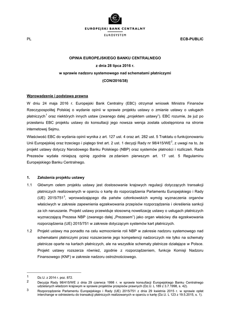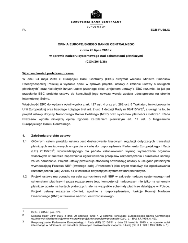 PL ECB-PUBLIC OPINIA EUROPEJSKIEGO BANKU CENTRALNEGO z dnia 28 lipca 2016 r. w sprawie nadzoru systemowego nad schematami płatniczymi (CON/2016/38) Wprowadzenie i podstawa prawna W dniu 24 maja 2016 r. Europejski Bank Centralny (EBC) otrzymał wniosek Ministra Finansów Rzeczypospolitej Polskiej o wydanie opinii w sprawie projektu ustawy o zmianie ustawy o usługach płatniczych oraz niektórych innych ustaw (zwanego dalej „projektem ustawy”). EBC rozumie, że już po 1 przesłaniu EBC projektu ustawy do konsultacji jego nowsza wersja została udostępniona na stronie internetowej Sejmu. Właściwość EBC do wydania opinii wynika z art. 127 ust. 4 oraz art. 282 ust. 5 Traktatu o funkcjonowaniu Unii Europejskiej oraz trzeciego i piątego tiret art. 2 ust. 1 decyzji Rady nr 98/415/WE , z uwagi na to, że 2 projekt ustawy dotyczy Narodowego Banku Polskiego (NBP) oraz systemów płatności i rozliczeń. Rada Prezesów wydała niniejszą opinię zgodnie ze zdaniem pierwszym art. 17 ust. 5 Regulaminu Europejskiego Banku Centralnego. 1. Założenia projektu ustawy 1.1 Głównym celem projektu ustawy jest dostosowanie krajowych regulacji dotyczących transakcji płatniczych realizowanych w oparciu o kartę do rozporządzenia Parlamentu Europejskiego i Rady (UE) 2015/751 , wprowadzającego dla państw członkowskich wymóg wyznaczenia organów 3 właściwych w zakresie zapewnienia egzekwowania przepisów rozporządzenia i określenia sankcji za ich naruszanie. Projekt ustawy przewiduje stosowną nowelizację ustawy o usługach płatniczych wyznaczającą Prezesa NBP (zwanego dalej „Prezesem”) jako organ właściwy dla egzekwowania rozporządzenia (UE) 2015/751 w zakresie dotyczącym systemów kart płatniczych. 1.2 Projekt ustawy ma ponadto na celu wzmocnienie roli NBP w zakresie nadzoru systemowego nad schematami płatniczymi przez rozszerzenie jego kompetencji nadzorczych nie tylko na schematy płatnicze oparte na kartach płatniczych, ale na wszystkie schematy płatnicze działające w Polsce. Projekt ustawy rozszerza również, zgodnie z rozporządzeniem, funkcje Komisji Nadzoru Finansowego (KNF) w zakresie nadzoru ostrożnościowego. 1 Dz.U. z 2014 r. poz. 872. 2 Decyzja Rady 98/415/WE z dnia 29 czerwca 1998 r. w sprawie konsultacji Europejskiego Banku Centralnego udzielanych władzom krajowym w sprawie projektów przepisów prawnych (Dz.U. L 189 z 3.7.1998, s. 42). Rozporządzenie Parlamentu Europejskiego i Rady (UE) 2015/751 z dnia 29 kwietnia 2015 r. w sprawie opłat interchange w odniesieniu do transakcji płatniczych realizowanych w oparciu o kartę (Dz.U. L 123 z 19.5.2015, s. 1). 3 ECB-PUBLIC 1.3 Projekt ustawy dodaje do ustawy o usługach płatniczych nowy rozdział zawierający przepisy określające rodzaje czynności podejmowanych przez Prezesa przy wykonywaniu nowych zadań jako organ właściwy w zakresie nadzoru systemowego nad schematami płatniczymi. Do czynności Prezesa będzie w szczególności należało: i) wydawanie zgody na prowadzenie schematu płatniczego oraz zgody na zmianę zasad funkcjonowania schematu płatniczego; ii) dokonywanie oceny funkcjonowania schematów płatniczych; iii) pozyskiwanie i żądanie przedstawienia informacji lub dokumentów niezbędnych do dokonywania takiej oceny; iv) wydawanie zaleceń; oraz v) wydawanie decyzji o zawieszeniu albo uchyleniu zgody na prowadzenie schematu płatniczego. Nowy rozdział obejmuje zasady mające zastosowanie do schematów płatniczych i procedurę wydawania zgody na ich prowadzenie. Projekt ustawy przewiduje także, że minister właściwy do spraw instytucji finansowych, po zasięgnięciu opinii Prezesa, określi w drodze rozporządzenia kryteria oceny schematu płatniczego oraz zakres informacji i dokumentów wymaganych dla wniosku o wydanie zgody. 1.4 Projekt ustawy wprowadza ponadto przepisy uzupełniające zasady współpracy między NBP i KNF w zakresie nadzoru nad krajowymi instytucjami płatniczymi świadczącymi usługę acquiringu. KNF będzie w szczególności obowiązana do informowania Prezesa o każdej zmianie mającej wpływ na aktualność informacji i dokumentów dołączonych do wniosku o wydanie zgody złożonego przez taką instytucję płatniczą, w zakresie w jakim mogą one mieć wpływ na sposób świadczenia usługi acquiringu. Ponadto, w przypadku powzięcia przez Prezesa informacji, że działalność instytucji płatniczej mogłaby zagrozić stabilności systemu płatniczego, Prezes zawiadamia o tym KNF. 1.5 Projekt ustawy określa zakres opinii wydawanej przez Prezesa przed wydaniem przez KNF zezwolenia krajowej instytucji płatniczej. Opinia ma zawierać ocenę wniosku w zakresie zgodności z prawem, bezpieczeństwa i sprawności świadczenia usługi płatniczej. Projekt ustawy przewiduje także, że opinia ma być wydana w terminie miesiąca od dnia doręczenia wniosku KNF. 1.6 Projekt ustawy przewiduje, że zgoda na prowadzenie schematu płatniczego oraz zgoda Prezesa na zmianę zasad funkcjonowania schematu płatniczego nie będzie wymagana i) w przypadku trójstronnych schematów płatniczych (tj. schematów, w których organizacja płatnicza jest wydawcą instrumentu płatniczego oraz jedynym podmiotem świadczącym usługę acquiringu) oraz ii) jeżeli zasady funkcjonowania schematu płatniczego na terytorium Polski zostały poddane ocenie przez odpowiedni organ nadzoru innego państwa członkowskiego lub Unii Europejskiej. W tym drugim przypadku projekt ustawy wprowadza wymóg, aby organizacja płatnicza właściwa dla schematu płatniczego udzieliła Prezesowi określonych informacji przed rozpoczęciem funkcjonowania schematu na terytorium Polski. Jednakże, jeżeli Prezes stwierdzi, że zasady funkcjonowania schematu płatniczego nie zapewniają wystarczającego bezpieczeństwa lub sprawności schematu płatniczego lub infrastruktury, systemów płatności lub schematów płatniczych, z którymi schemat płatniczy jest powiązany, może on zobowiązać organizac