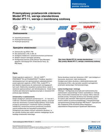 Elektroniczny pomiar ciśnienia Przemysłowy przetwornik ciśnienia Model IPT-10, wersja standardowa Model IPT-11, wersja z membraną czołową Karta katalogowa WIKA PE 86.11 Zastosowanie ■■ Inżynieria procesowa ■■ Przemysł farmaceutyczny ■■ Przemysł spożywczy Specjalne właściwości ■■ Ochrona Ex wg ATEX i FM ■■ Dla zastosowan z SIL-2 (SIL-3) ■■ Dostępna metaliczna i ceramiczna komora pomiarowa ■■ Siedem różnych warinatów obudowy ■■ Konfiguracja poprzez DTM (Device Type Manager) zgodnie z koncepcją FDT (Field Device Tool), np. PACTware Rys. lewy: Model IPT-10, wersja standardowa Rys. prawy: Model IPT-11, wersja z membraną czołową Opis Dzięki sygnałom wyjściom 4 ... 20 mA, HART®, PROFIBUS® PA lub FOUNDATION™ Fieldbus, łącznie z iskrobezpiecznym lub ognioszczelnym zabezpieczeniem przed zapłonem (zgdonie z ATEX i FM), model IPT-1x jest idealnie dopasowany do zastosowań wymagających tych cech. Elektronika wszystkich przetworników, nawet w wariancie ognioszczelnym, jest iskrobezpieczna. Dzięki temu możliwe jest dokonanie regulacji przyrządu w obszarach EX podczas jego działania. Uniwersalny w zastosowaniu Dzięki dostępnym zakresom pomiarowym 0 ... 0.1 bar do 0 ... 4,000 bar i dowolnie wybieranej regulacji zakresu, przyrząd może być stosowany w prawie każdej aplikacji. Duża liczba przyłączy procesowych i możliwość wyboru pomiędzy metaliczną i ceramiczną komora pomiarową umożliwia użycie przetwornika we wszystkich przemysłach. Dostępnych jest siedem różnych wariantów obudowy i w ten sposób możliwy jest wybór wariantu nadającego się do każdego środowiska roboczego. Sama obudowa może być obracana o 330° i jest dostępna w tworzywie, aluminium i stali nierdzewnej. Dostępna jest także obudowa z elektropolerowanej stali nierdzewnej (316L), aby sprostać wysokim wymaganiom przemysłu spożyczego i farmaceutycznego. Łatwa konfiguracja i obsługa Obsługa i i konfiguracja przyrządu jest wykonywana przy zastosowaniu opcjonalnego modułu wyświetlacza i obsługi, który można łatwo dostosować do 4 pozycji. Menu robocze posiada prostą i intuicyjnę strukturę oraz dziewięć języków do wyboru jako standard. Alternatywnie parametry pracy można ustawić za pomocą bezpłatnego i niezastrzeżonego oprogramowania konfiguracyjnego PACTware™. Specyficzne dla urządzenia DTM umożliwia łatwą integrację z odpowiednimi Rozproszonymi Systemami Sterowania. Karta katalogowa WIKA PE 86.11 ∙ 01/2012 Karty katalogowe podobnych produktów: UniTrans®, uniwersalny przetwornik ciśnienia dla różnych aplikacji; modele UT-10 i UT-11; patrz karta katalogowa PE 86.01 Różnicowy przetwornik ciśnienia; model DPT-10; patrz karta katalogowa PE 86.21 Strona 1 z 13 Zakresy pomiarowe Ciśnienie względne (bar) Zakres pomiarowy Dopuszczalne przeciążenie Ciśnienie niszczące Zakres pomiarowy Dopuszczalne przeciążenie Ciśnienie niszczące Zakres pomiarowy Dopuszczalne przeciążenie Ciśnienie niszczące Metaliczna komora pomiarowa 0 ... 0.4 2 2.4 0 ... 40 80 400 0 ... 1,000 1,500 3,000 0 ... 1.6 10 12 0 ... 100 200 800 0 ... 1,600 2,000 4,000 0 ... 6 35 42 0 ... 250 500 1,200 0 ... 2,500 3,000 5,000 0 ... 16 80 96 0 ... 600 1,200 2,400 1) 0 ... 4,000 4,400 7,000 Ceramiczna komora pomiarowa 0 ... 0.1 15 15 0 ... 5 65 65 0 ... 0.4 30 30 0 ... 10 90 90 0 ... 1 35 35 0 ... 25 130 130 0 ... 2.5 50 50 0 ... 60 200 200 1) Dla modelu IPT-11: wartości wyspecyfikowane w tabeli mają zastosowanie tylko kiedy uszczelnienie jest wykonane za pomocą pierścienia uszczelniającego pod śrubą sześciokątną. Inaczej obowiązuje max. 1,600 bar. Inne zakresy pomiarowe mogą być ustawione poprzez zmniejszanie zakresy. Dla zakresów pomiarowych powyżej 600 bar dostępny jest tylko model IPT-10. Zakresy pomiarowe w ciśnieniu absolutnym dostępne są w takich samych odstępach jak w ciśnieniu względnym. Metaliczne komory pomiarowe tylko do 0 … 16 bar absolutnych i ceramiczne komory pomiarowe tylko do 0 ... 60 bar absolutnych. Podciśnienie i zakresy pomiarowe +/- (bar) Metaliczna komora pomiarowa Zakres pomiarowy Dopuszczalne przeciążenia Ciśnienie niszczące Zakres pomiarowy Dopuszczalne przeciążenie Ciśnienie niszczące Bezpieczeństwo próżniowe -1 ... 0 5 6 -1 ... +15 80 96 -1 ... +0.6 10 12 -0.2 ... +0.2 2 3 -1 ... +3 17 20 -0.1 ... +0.3 2 3 -1 ... +5 35 41 Ceramiczna komora pomiarowa -1 ... +1.5 50 50 -0.1 ... +0.1 15 15 -1 ... +10 -1 ... +25 90 130 90 130 -0.05 ... +0.05 15 15 Metaliczna komora pomiarowa Ceramiczna komora pomiarowa Tak od zakresu pomiarowego 1 bar 1) -1 ... +60 200 200 1) Nie dla aplikacji z tlenem Dokładność Metaliczna komora pomiarowa Dokładność w temperaturze pokojowej 1) Regulacja punktu zero Nieliniowość Niepowtarzalność Zachowanie przy zmniejszaniu 2) ■■ 1:1 ... 5:1 z zakresem pomiarowym 0.4 ... 1,000 bar ■■ > 5:1 z zakresem pomiarowym 0.4 ...1,000 bar ■■ 1:1 ... 2:1 z zakresem pomiarowym ≥ 1,600 bar ■■ 1:1 ... 5:1 z zakresem pomiarowym 0.1 bar absolutny ■■ > 5:1 z zakresem pomiarowym 0.1 bar absolutny Stabilność długookresowa 3) Znamionowy zakres temperatury ■■ bez wyświetlacza ■■ z wyświetlaczem Zakresy pomiarowe < 1,600 bar: ≤ 0.1 % zakresu Zakresy pomiarowe ≥ 1,600 bar: ≤ 0.6 % zakresu -5 ... +95 % ≤ 0.05 % zakresu BFSL (IEC 61298-2) ≤ 0.1 % zakresu Ceramiczna komora pomiarowa ≤ 0.075 % zakresu Zakres pomiarowy 0.1 bar abs.: ≤ 0.25 % zakresu -20 ... +95 % ≤ 0.05 % zakresu BFSL (IEC 61298-2) ≤ 0.1 % zakresu Bez zmiany dokładności Bez zmiany dokładności < 0.02 % x zmniejszenie < 0.015 % x zmniejszenie < 0.6 % - - < 0.25 % - 0.05 % x zmniejszenie ≤ (0.1 % x zmniejszenie) / rok ≤ (0.1 % x zmniejszenie) / rok -40 ... +80 °C -15 ... +70 °C 0 ... 100 °C 0 ... 70 °C 1) Obejmuje nieliniowość, histerezę, zero offset i odchylenie wartości końcowej (odpowiada błędowi pomiaru wg IEC 61298-2). Kalibrowany w pozycji pio