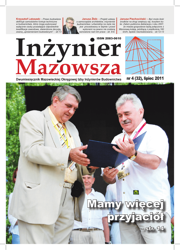 Krzysztof Latoszek: - Prawo budowlane definiuje samodzielne funkcje techniczne w budownictwie, które mogą wykonywać wyłącznie osoby posiadające odpowiednie kwalifikacje zawodowe, stwierdzone decyzją, zwaną „uprawnieniami budowlanymi”. - str.13 Janusz Żbik: - Projekt ustawy o samorządzie architektów, inżynierów budownictwa i urbanistów na razie nie jest procedowany w Sejmie i przed wyborami na pewno nie zostaną wznowione nad nim prace - str. 8-9. Janusz Piechociński: - Być może ilość środków na drogi zwiększy się, kosztem kolei. Zatem publiczna deklaracja z roku 2007, że miasta-gospodarze będą połączone z Warszawą koleją, jeżdżącą z prędkością 160 km/h, będzie niezrealizowana. - str.12-13 Inżynier ISSN 2083-0610 Mazowsza Dwumiesięcznik Mazowieckiej Okręgowej Izby Inżynierów Budownictwa nr 4 (32), lipiec 2011 Mamy więcej przyjaciół - str. 14 str 2 Komentarz Mazowiecka Okręgowa Izba Inżynierów Budownictwa 02-134 Warszawa, ul. 1 Sierpnia 36 B e-mail: [email protected] www.maz.piib.org.pl Budownictwo - problem społeczny O brady Kongresu Budownictwa, cała seria wystąpień społecznych przeciwko projektom ograniczenia spółdzielczości mieszkaniowej – z jednej strony, a z drugiej - niepokojące wieści z budów infrastrukturalnych i mieszkaniowych oraz pewne „światełka” pokazujące, że mamy potencjał intelektualny w budownictwie - mowa tutaj o ciekawych rezultatach ostatniej XXI edycji konkursu Budowa Roku - pokazują, że sprawy budownictwa i organizacji z nim związanych, stają na czele listy ważkich problemów społecznych. Oto, co powiedzieli nam: Zbigniew Janowski, przewodniczący Związku Zawodowego „Budowlani”: Rozwój, przetrwanie czy likwidacja? - Kongres Budownictwa podczas swej dziesięcioletniej działalności wielokrotnie podejmował działania na rzecz obrony budownictwa, mieszkalnictwa, a także spółdzielczości mieszkaniowej. Jedną z podstawowych idei Kongresu była i jest promocja racjonalnej, zrównoważonej i odpowiadającej potrzebom społecznym polityki mieszkaniowej. Wśród wielu inicjatyw możemy wspomnieć Białą Księgę Budownictwa z 2003 r., promocję wieloletniego programu mieszkaniowego z 2007 r, działania na rzecz opracowania przez rząd podstaw polityki mieszkaniowej w 2010 r. lub też wielką ilość opracowań eksperckich i statystyk. Za te działania należą się Przedstawicielstwu Kongresu, a szczególnie jego prezesowi Romanowi Nowickiemu, podziękowania całego środowiska budowlanego. Polska spółdzielczość mieszkaniowa to ponad 120 lat tradycji. Najstarsze spółdzielcze wspólnoty mieszkaniowe powstały w 1890 roku w Bydgoszczy i Poznaniu. Musimy się dziś poważnie zastanowić, czy ta rocznica, za którą kryją się lata społecznej działalności i gospodarczej emancypacji, niezwykle udanego socjalnego eksperymentu w dwudziestoleciu międzywojennym, ale też uzależnienia i „upaństwowienia” przy bardzo szerokiej działalności inwestycyjnej po wojnie - nie będzie, aby jedną z rocznic ostatnich. Ostatni, kilkuletni etap w historii spółdzielczości mieszkaniowej to czas planowego, systematycznego niszczenia jej podstaw, etap bezwzględnego ataku na same zasady działalności spółdzielczej. Rozumiem ludzi, którzy atakują spółdzielczość mieszkaniową, bo widzą w tym własny, indywidualny interes uzyskanie majątku, który nie do końca sami wytworzyli. Rozumiem ludzi, którzy korzystają ze stwarzanych możliwości uzyskania własności lokali praktycznie za darmo. Rozumiem także tych, którzy ostro krytykują funkcjonowanie wielu spółdzielni za brak procedur demokratycznych, brak właściwego nadzoru władz, brak aktywności inwestycyjnej, a czasami za niegospodarność. Nie potrafię natomiast zrozumieć wpływowej, niestety, grupy polityków, których misją dziejową jest niszczenie spółdzielczości mieszkaniowej i którzy tę misję ze znacznym powodzeniem obecnie realizują. Nie rozumiem, bo nie widzę w tym żadnego interesu poza ideologicznym zacietrzewieniem. godziny pracy biura: poniedziałki i czwartki: 10.00-18.00 wtorki, środy i piątki: 8.00-16.00 Biuro Izby: sekretariat biura: pok. 126 tel. centrala: 22 868 35 35, 22 868 35 81, 22 868 35 82 fax. 22 868 35 49 e-mail: [email protected] Przewodniczący Rady MOIIB sekretariat: pok. 126 dyżury: poniedziałek godz. 12.00-14.00 e-mail: [email protected] Porady prawne udzielane są po wcześniejszym uzgodnieniu telefonicznym. tel.: 22 868 35 50 wew. 145 Komisja Rewizyjna przyjęcia interesantów pok. 113 dyżury we wtorki godz. 14.00-15.00 Komisja Kwalifikacyjna: sprawy nadawania uprawnień budowlanych i tytułu rzeczoznawcy pok. 11, 12 tel.: 22 878 04 03, 22 878 04 04 fax: 22 826 28 67 wew.153 Rzecznik Odpowiedzialności Zawodowej sekretariat - przyjęcia interesantów pok. 116 dyżury: poniedziałek godz. 16.00-18.00 tel. wew. 135, fax. wew. 118 Sąd Dyscyplinarny sekretariat - przyjęcia interesantów pok. 117 dyżury: poniedziałki, godz. 16.00-18.00 tel. wew. 145, fax. wew. 118 Dział Członkowski: przyjęcia nowych członków i wydawanie zaświadczeń - pok. 101 i 102 telefony bezpośrednie: 22 878 04 11, 22 826 11 05 wew. 121 do 124 fax: 22 300 99 00 Dział Szkoleń: czytelnia norm i czasopism: pok. 121 telefony bezpośrednie: 22 828 34 10, 22 868 35 50 wew 140 do 142 BIURA TERENOWE Godziny przyjęć interesantów tak jak w biurze w Warszawie Roman Nowicki, Kongres Budownictwa: Idziemy do tyłu - Według wstępnych danych, w okresie styczeń-maj 2011 r. oddano do użytkowania 45 825 mieszkań, tj. o 14,9% mniej niż w 2010 r. i o 28,7% mniej w porównaniu z okresem styczeń-maj 2009 r. Sytuacja w budownictwie mieszkaniowym jest znacznie gorsza niż z budową autostrad, a jednak towarzyszy temu śmiertelna cisza. Jak stwierdziła Najwyższa Izba Kontroli rząd nie prowadzi żadnej długofalowej polityki mieszkaniowej. Polska umacnia swoje ostatnie miejsce w Europie prawie we wszystkich