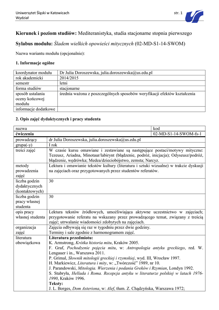 Uniwersytet Śląski w Katowicach Wydział str. 1 Kierunek i poziom studiów: Mediteranistyka, studia stacjonarne stopnia pierwszego Sylabus modułu: Śladem wielkich opowieści mitycznych (02-MD-S1-14-SWOM) Nazwa wariantu modułu (opcjonalnie): 1. Informacje ogólne koordynator modułu rok akademicki semestr forma studiów sposób ustalania oceny końcowej modułu informacje dodatkowe Dr Julia Doroszewska, [email protected] 2014/2015 letni stacjonarne średnia ważona z poszczególnych sposobów weryfikacji efektów kształcenia 2. Opis zajęć dydaktycznych i pracy studenta nazwa ćwiczenia prowadzący grupa(-y) treści zajęć metody prowadzenia zajęć liczba godzin dydaktycznych (kontaktowych) liczba godzin pracy własnej studenta opis pracy własnej studenta organizacja zajęć literatura obowiązkowa kod 02-MD-S1-14-SWOM-fs-1 dr Julia Doroszewska, [email protected] I rok W czasie kursu omawiane i zestawiane są następujące postaci/motywy mityczne: Tezeusz, Ariadna, Minotaur/labirynt (błądzenie, podróż, inicjacja); Odyseusz/podróż, błądzenie, wędrówka; Medea/dzieciobójstwo, zemsta; Narcyz. Lektura i omawianie tekstów kultury (literatura i sztuki wizualne) w trakcie dyskusji na zajęciach oraz przygotowanych przez studentów referatów. 30 30 Lektura tekstów źródłowych, umożliwiająca aktywne uczestnictwo w zajęciach; przygotowanie referatu na wskazany przez prowadzącego temat, związany z treścią zajęć; utrwalanie wiadomości zdobytych na zajęciach. Zajęcia odbywają się raz w tygodniu przez dwie godziny. Terminy i sale zgodnie z harmonogramem zajęć. Literatura przedmiotu: K. Armstrong, Krótka historia mitu, Kraków 2005. F. Graf, Pochodzenie pojęcia mitu, w: Antropologia antyku greckiego, red. W. Lengauer i in., Warszawa 2011. P. Grimal, Słownik mitologii greckiej i rzymskiej, wyd. III, Wrocław 1997. H. Markiewicz, Literatura i mity, w: „Twórczość” 1989, nr 10. J. Parandowski, Mitologia. Wierzenia i podania Greków i Rzymian, Londyn 1992. S. Stabryła, Hellada i Roma. Recepcja antyku w literaturze polskiej w latach 19761990, Kraków 1996. Teksty: J. L. Borges, Dom Asteriona, w: Alef, tłum. Z. Chądzyńska, Warszawa 1972; Uniwersytet Śląski w Katowicach Wydział literatura uzupełniająca str. 2 J. i E. Coen, Bracie, gdzie jesteś?, Francja, USA, Wielka Brytania 2000; A. Gide, Tezeusz, w: Immoralista i inne utwory, tłum. I. Rogozińska, Warszawa 1984; Z. Herbert, Historia Minotaura, w: Pan Cogito, Warszawa 1974; H. Hesse, Narcyz i Złotousty (fragmenty), tłum. M. Tarnowski, Warszawa 1991. J. Joyce, Ulisses (fragmenty), tłum. M. Słomczyński, Bydgoszcz 1994. S. Kubrick, Lśnienie, Kanada, Wielka Brytania, USA 1980. H. Malewska, Labirynt (fragmenty), Warszawa 1970. P.P. Pasolini, Medea, Francja, RFN, Włochy 1969. A. Rodziewicz, [Jestem nikim…], w: Wierzba. Poematy, Warszawa 2014. L. von Trier, Medea, Dania 1998. O. Wilde, Portret Doriana Graya (fragmenty), tłum. Z. Feldmanowa, Kraków 1995. Z. Abramowiczówna, Wstęp, w: Homer, Odyseja, tłum. L. Siemieński, Wrocław 1992. M. Czapiga, Labirynt: inicjacja, podróż i zbłądzenie, Wrocław 2013. M. Głowiński, Mity przebrane, Kraków 1990. Mit, człowiek, literatura, red. S. Stabryła, Warszawa 1992. adres strony www zajęć informacje dodatkowe 3. Opis sposobów weryfikacji efektów kształcenia modułu nazwa kod 02-MD-S1-14-SWOM-w-1 Kolokwium pisemne kod(-y) zajęć 02-MD-S1-14-SWOM-fs-1 osoba(-y) dr Julia Doroszewska, [email protected] przeprowadzająca(e) weryfikację grupa(-y) I rok wymagania Znajomość treści poruszanych na zajęciach (zob. punkt: treści zajęć): umiejętność merytoryczne wskazania i zinterpretowania współczesnych tekstów kultury rewokujących i reinterpretujących wybrane motywy mityczne, omawiane w trakcie kursu. kryteria oceny Kolokwium pisemne składające się z pytań otwartych i zamkniętych dotyczących treści poruszanych na zajęciach. przebieg procesu Według harmonogramu organizacji roku akademickiego. weryfikacji informacje dodatkowe
