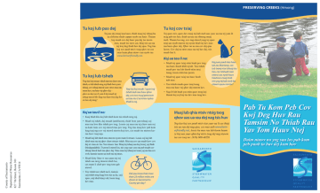 PRESERVING CREEKS (Hmong) Tu koj lub pas dej Tu koj cov tsiaj Tej pas dej muaj kua kauv, thiab muaj tej tshuaj hu ua chlorine thiab copper nyob rau hauv. Thaum koj muab cov dej hauv pas dej tso tawm mus, muab tso raws cai, thiaj tsis ua rau tej kwj deg thiab hav dej qias. Yog tias koj xav paub ntxiv txog qhov no ces mus luam phau ntawv uas nyob rau www.beriverfriendly.net. • Muab tej quav tsiaj tso hauv hoob nab mus. Yog tias koj muab 1 quart roj tsheb laub rau hauv qhov dej, ces nws muaj peevxwm ua tau rau 2 acre kev nplua thiab lo roj. Koj ua tau li no: • Kuaj thiab kho koj lub tsheb kom tsis txhob nrog roj. Sacramento, CA 95814 • Muab koj lub tsheb nres ntawm nyom mam li ntxuav. Lossis coj koj lub tsheb mus rau tej qhov chaw ntxuav tsheb. Mus rau cov uas muab lawv cov dej siv mus siv los. Nco ntsoov tias: Muaj tej tshuaj uas kuj txawj yaj thiab (biodegradable). Txawm li ntawd los, tsis yog yuav zoo rau peb muab cov tshuaj ntawd laub rau qhov dej. Ntau zaus tej tshuaj no tsuas yaj sai dua cov xwb, tiamsis tseem ua mob rau tej ntses. 827 7th Street, Room 301 Department of Water Resources County of Sacramento • Muab roj tsheb, dej ntsuab (antifreeze), thiab lwm yam tshuaj coj mus rau kws kho tsheb pov tseg. Lossis coj mus rau tej chaw sam roj ua kam txais cov roj ntawd mus pov tseg. Yog tias muaj kev pab kom luag tuaj nqa cov roj ntawd ntawm koj tsev, ces muab tso ntawm kev rau lawv tuaj nqa. • Muab kitty litter w rau saum tej roj tsheb uas nrog ntawm tsheb los, ces mam li cheb pov tseg tom qab ntawd. • Tsis txhob tsav tsheb tas li, tiamsis caij tsheb nrog luag lwm tus ua ke, caij npav, caij tsheb kauj vab, lossis taug kev mus. Koj ua tau li no: • Muab tej quav tsiaj ntim hnab pov tseg rau hauv thoob khib nyiab. Tsis txhob muab pov rau lub thoob ntim nroj tsuag, lossis ntim kas poom. Tu koj lub tsheb Yog tias koj ntxuav tsheb ntawm chaw nres tsheb, es lub tsheb nrog roj thiab lwm yam tshuaj, cov tshuaj ntawd yuav ntws mus rau nram kev, rau hauv tej qhov dej – qhov no kuj zoo ib yam li koj muab tej tshuaj ntawd hliv kiag rau hauv kwj deg lossis hav dej ntag! Tej quav miv, quav dev muaj tej kab mob uas yuav ua rau tej yam ib ncig peb tsis huv, thiab ua tau rau tibneeg muaj mob. Thaum los nag, cov nag ntawd yaug tej quav tsiaj uas nyob ntawm tej nyom thiab tej kev mus rau hauv qhov dej. Qhov no ua rau cov dej qias lawm. Cov dej no ntws mus rau tej hav dej, tsis muab lim li. Did you know that more than 23 million miles are driven in Sacramento County per day? • Tsis txhob muab quav tsiaj tsuag mus rau hauv tej qhov dej ntawm kev. Koj puas paub tias hauv lub zos Monterey, cov tub txawj ntse tshuaj tau tias, cov ntshuab (sea otters) uas nyob hauv hiavtxwv muaj mob vim yog tej kab mob los ntawm quav miv los? • Nqa ib lub hnab yas ntim quav nrog koj thaum koj coj koj tus dev mus taug kev. Muaj lub qhia ntxiv ntsig txog qhov uas ua rau dej nag tsis huv Yog tias koj xav paub ntxiv tias yuav ua li cas thiaj tsis ua rau dej nag qias, ces mus saib www.beriverfriendly.net, lossis hu mus rau lub koom haum ze koj uas yuav qhia koj ntxiv txog dej nag ntawm tus xov tooj no: (916) 808-4H20. Pab Tu Kom Peb Cov Kwj Deg Huv Rau Tamsim No Thiab Rau Yav Tom Hauv Ntej Daim ntawv no yog sau los pab kom peb paub tu hav dej kom huv Help keep our waterways clean and healthy for generations to come Koj Ua Tau Li No: V im muaj tej hav dej hauv Sacramento County peb thiaj tau mus caij nkoj ua si, mus ua luam dej, mus nuv ntses, thiab peb tau mus pom tej hav dej zoo nkauj ntawd. Vim muaj cov dej ntawd, tej niam txiv zoo coj menyuam mus ua si. Kuj muaj chaw rau tej tsiaj txhu ua tsev nyob. Tiamsis peb yuav tsum ua tib zoo saib xyuas tej hav dej ntawd. Tej uas peb ua txhua txhua hnub, xws li thaum peb tsav tsheb, ua teb, kho vaj kho tsev, thiab thaum peb ntxuav tsheb, tej ntawd ua tau rau tej hav dej qias. Yog li ntawd, zoo rau peb pauv tej yam uas peb ua hauv peb lub neej kom thiaj tsis ua rau tej hav dej ntawd qias. • Cog tej paj ntoos uas kab tsis nyiam noj thiab tej paj ntoos uas ib txwm muaj ntawm koj thaj tsam. Tej Raj Deg Thiab Tej Qhov Dej Nyias Txawv Nyias Koj puas paub tias tej raj deg hauv koj lub tsev thiab tej qhov dej ntawm kev, sib txawv li cas? Yog tias koj tsis paub los tsis ua cas. Coob leej kuj tsis paub thiab. • Thaum peb tso dej hauv hoob nab mus, cov dej ntawd mus rau ib qho chaw uas lim dej qias. Tom qab muab cov dej ntawd lim tas ces mam li tso cov dej ntawd ntws mus rau nram hav dej. • Cov dej uas ntws mus rau nram kev thiab mus rau hauv tej qhov dej, ntws ncaj qha mus rau nram hav dej. Cov dej no lus Askiv hu ua urban runoff. Tej tsheb thiab tibneeg, thiab tej tsiaj ua rau cov dej uas ntws mus rau nram kev tsis huv. Thaum cov dej ntawd ntws mus rau tej hav dej thiab tej kwj deg, tsis huv li, rau qhov tsis tau muab lim. Ua li cas tsis zoo thaum dej nag qias… Tsis zoo rau dej nag qias, rau qhov yuav ua mob rau tej tsiaj txhu thiab tej ntses. Thaum kawg yuav ua rau tag nrho cov dej ntawd tsis huv. Tiamsis ntau zaus thaum muaj tej yam ua rau dej nag tsis huv, peb qhov muag yuav tsis pom thiab yuav sijhawm ntev mam li kuaj tau. Muaj ntau yam uas peb ua txhua txhua hnub, uas ua rau dej nag tsis huv. Tiamsis koj kuj pab tau kom tej kwj deg thiab tej hav dej huv tuaj. Tom tog vaj tog tsev Thaum koj siv tej chiv thiab tej tshuaj tua kab tsis raws cai, ces thaum los nag tej tshuaj ntawd yuav ntws mus rau tej qhov dej, ua rau tej kwj deg thiab kwj liag tsis huv. Tsis tas li ntawd xwb, yog tias koj siv tej tshuaj ntawd ntau dhau lawm ces yuav ua rau koj cov nyom tuag. • Paub tej kab hauv koj lub vaj-thiab siv tej tshuaj tua kab uas tsis ua mob rau tibneeg. • Thaum koj kho vaj kho tsev muab cov av thiab cov hmoov ntoo uas koj tsis siv npog, cua thiaj tsis ntsawj mus rau hauv tej qhov dej. • Cheb tej khib nyiab ntawm ntug kev, thiab ntawm koj tog vaj tog tseg mus. • Tsis txhob siv tshuaj tua kab thiab chiv ntau ntau. Yog tias koj paub tias yuav los nag ob hnub tom ntej, ces 